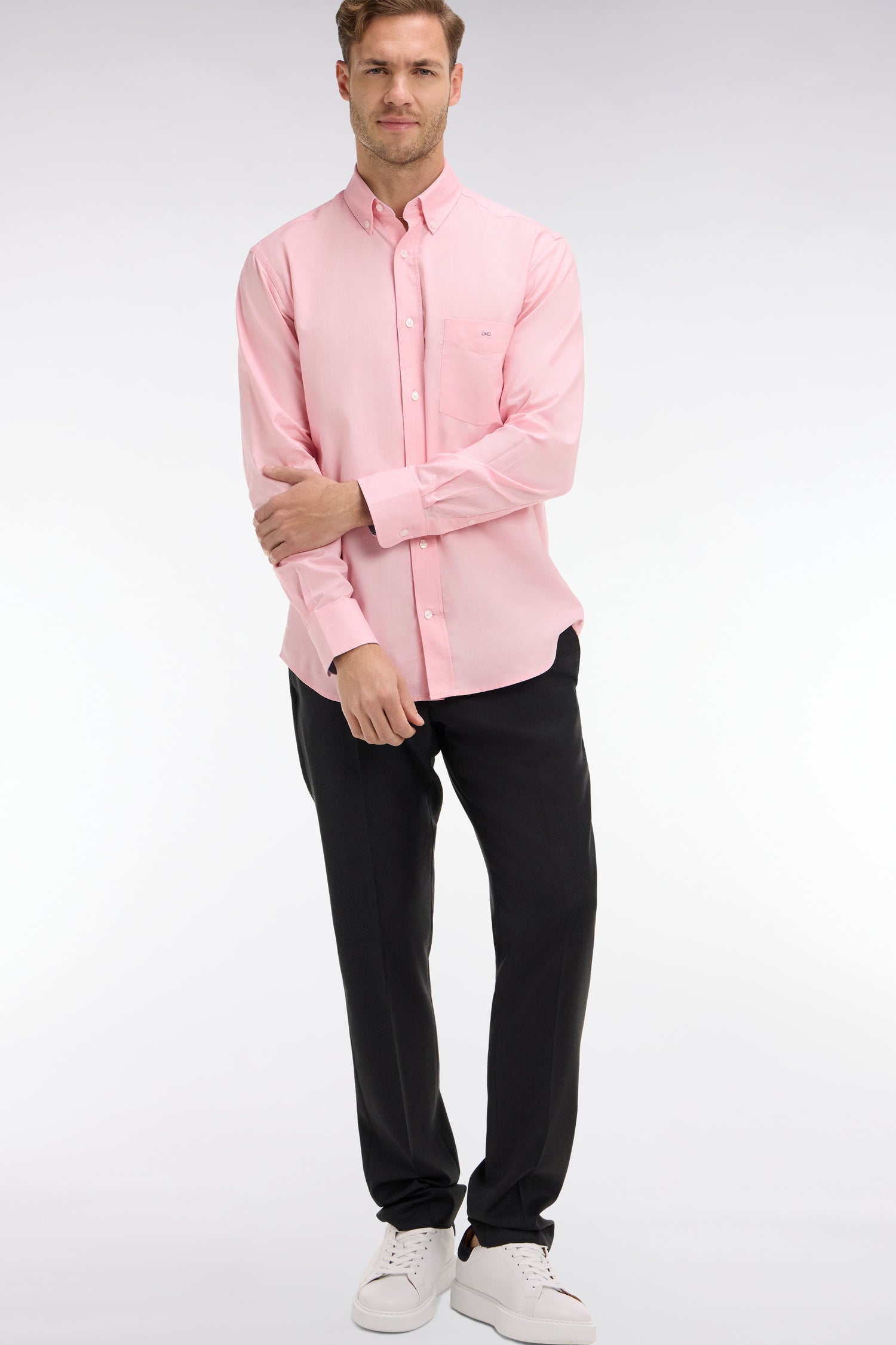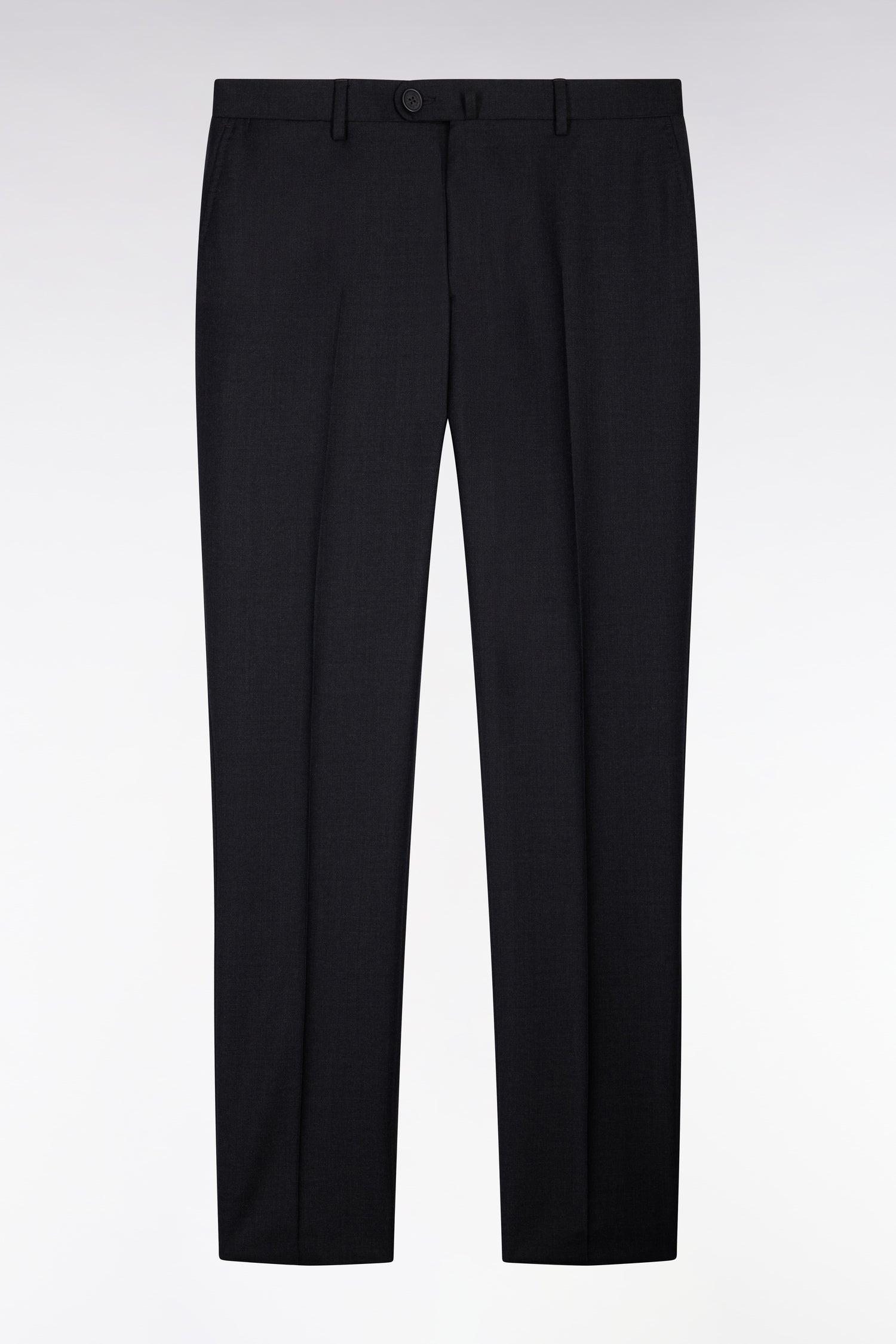 Slim dark grey wool trousers with broken fold