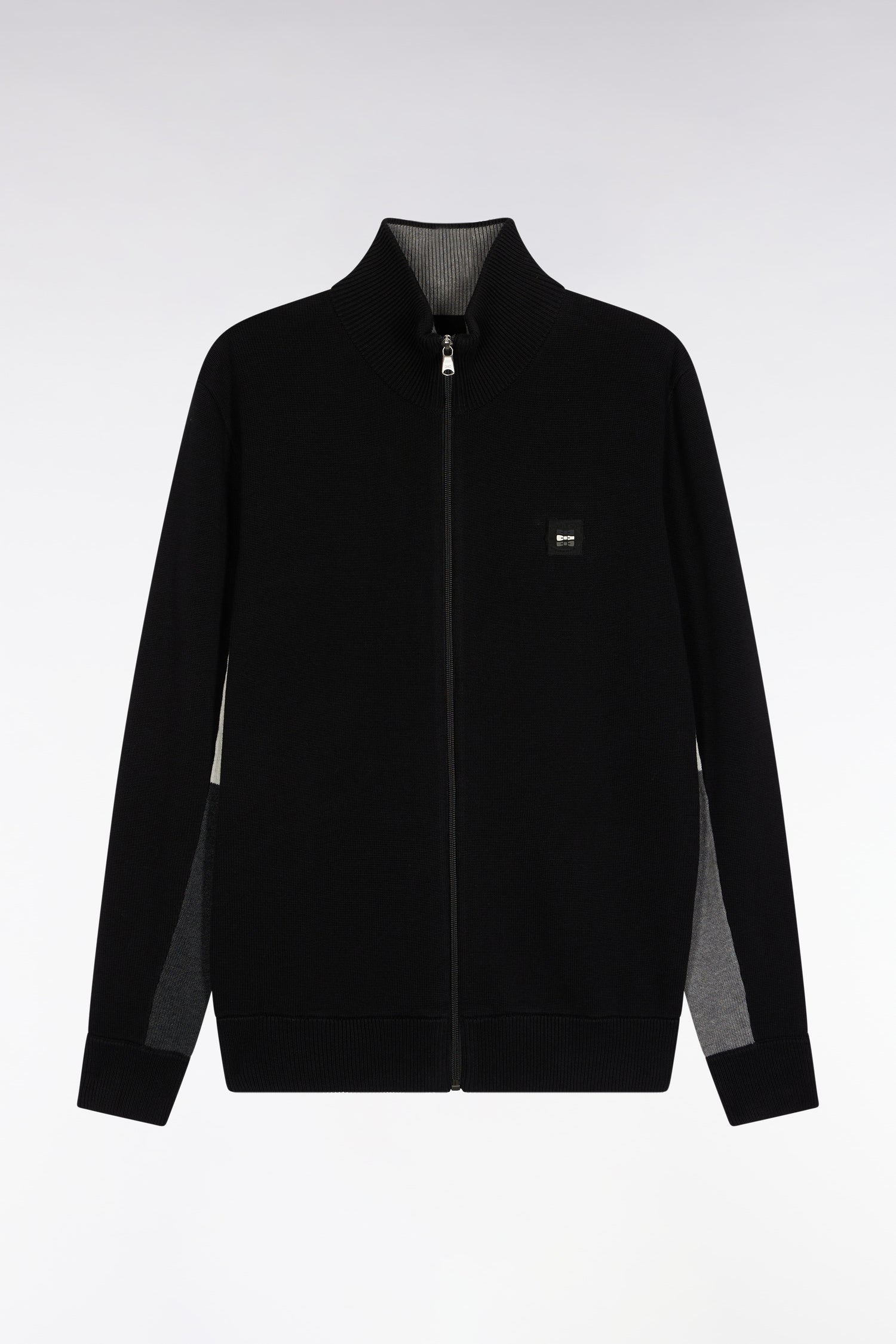 This zipped cardigan with stand-up collar seduces with its play of colors. The jersey body contrasts subtly with the inside of the sleeves, rewoven in different colors. Designed to combine comfort with a sporty-chic look, this trucker-neck sweater is signed with a felt and silicone badge on the chest.
