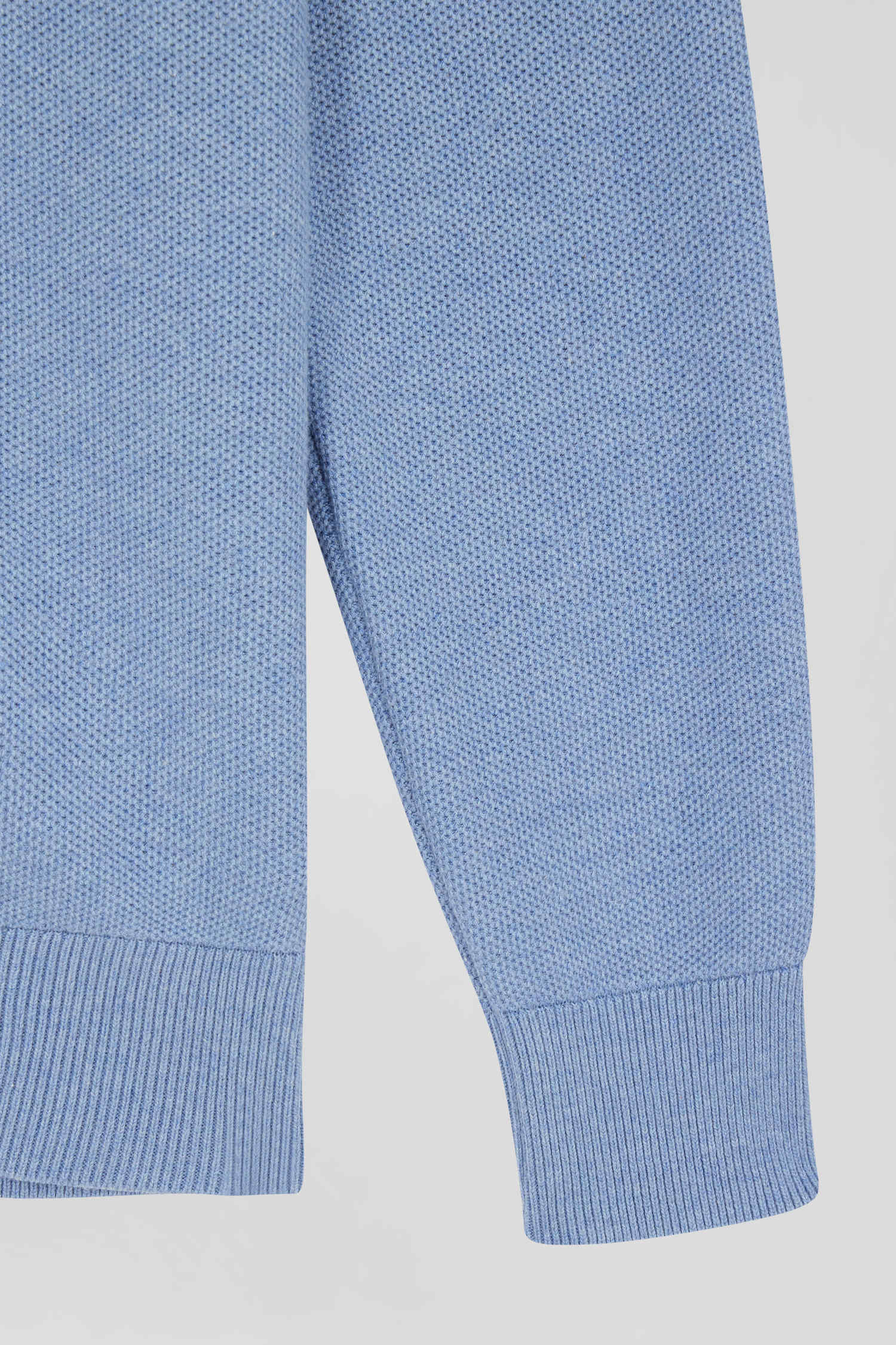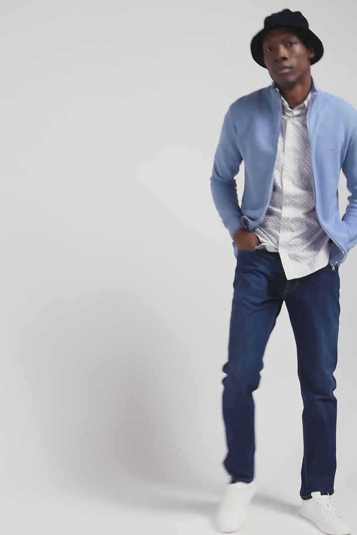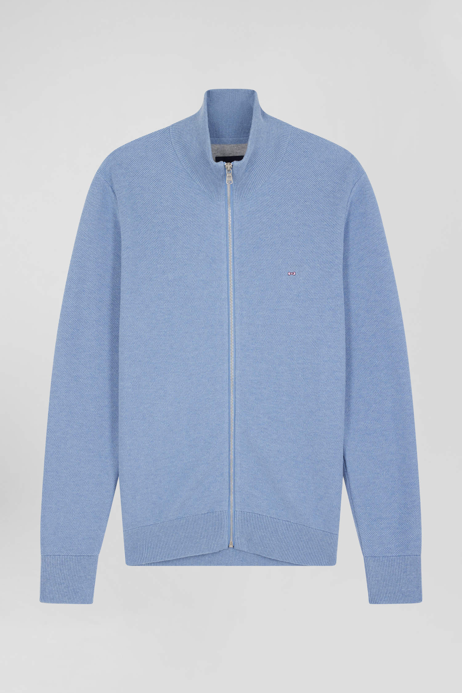 Regular plain sky blue cotton high collar zipped cardigan