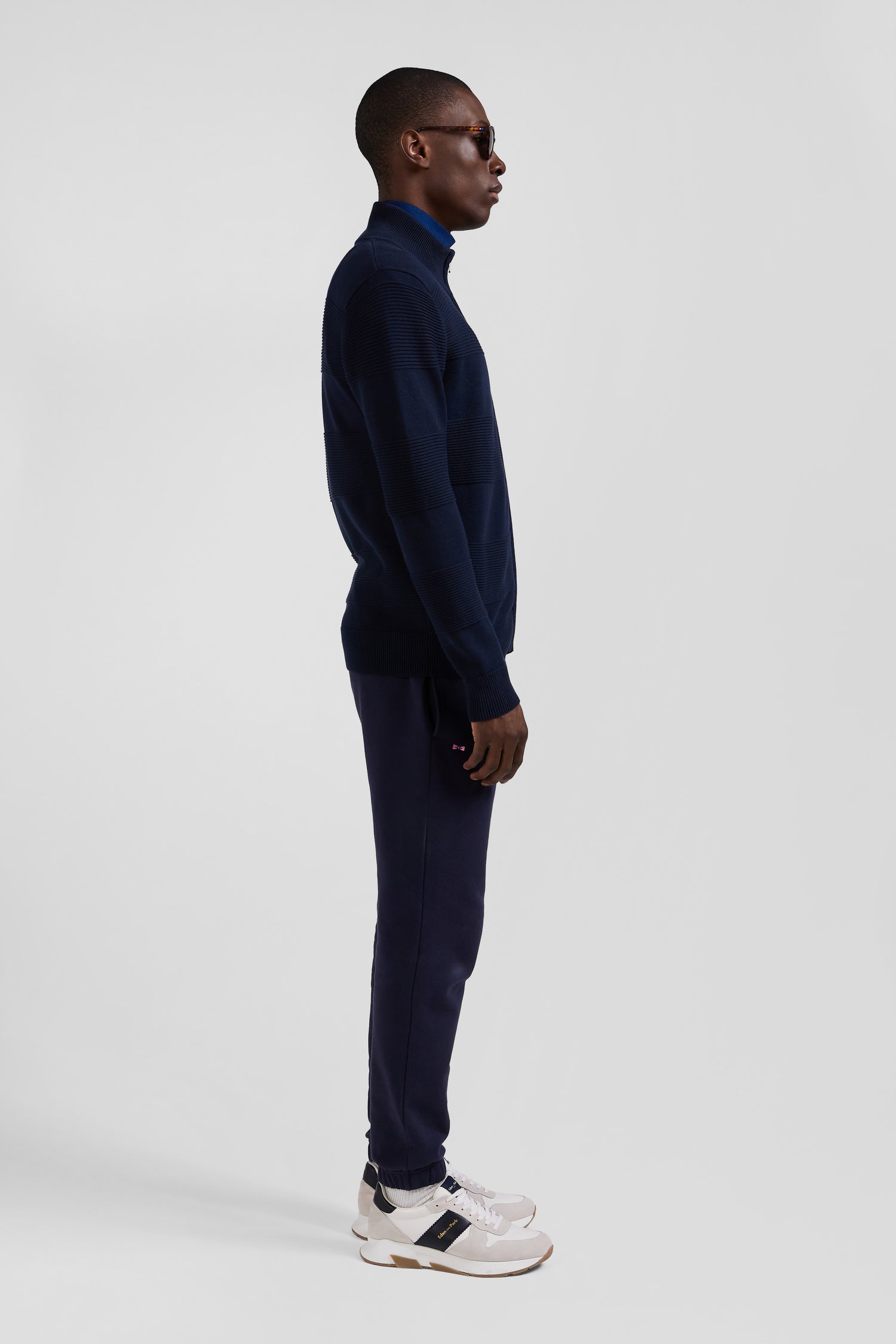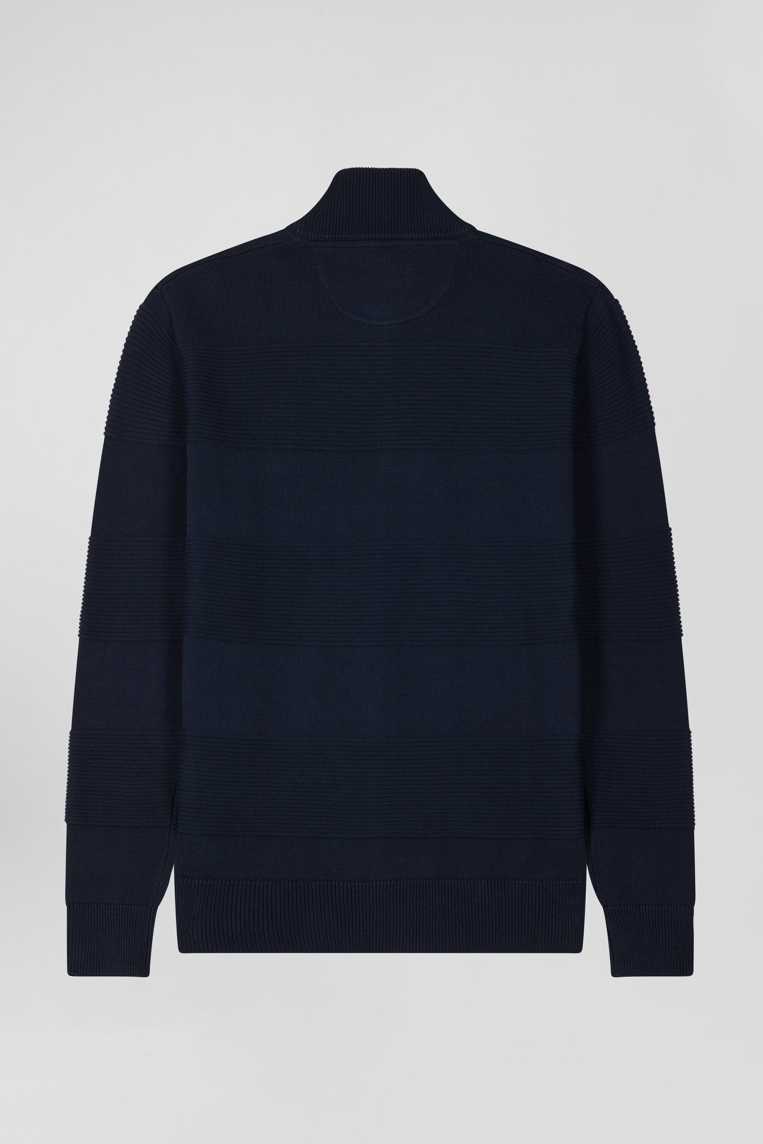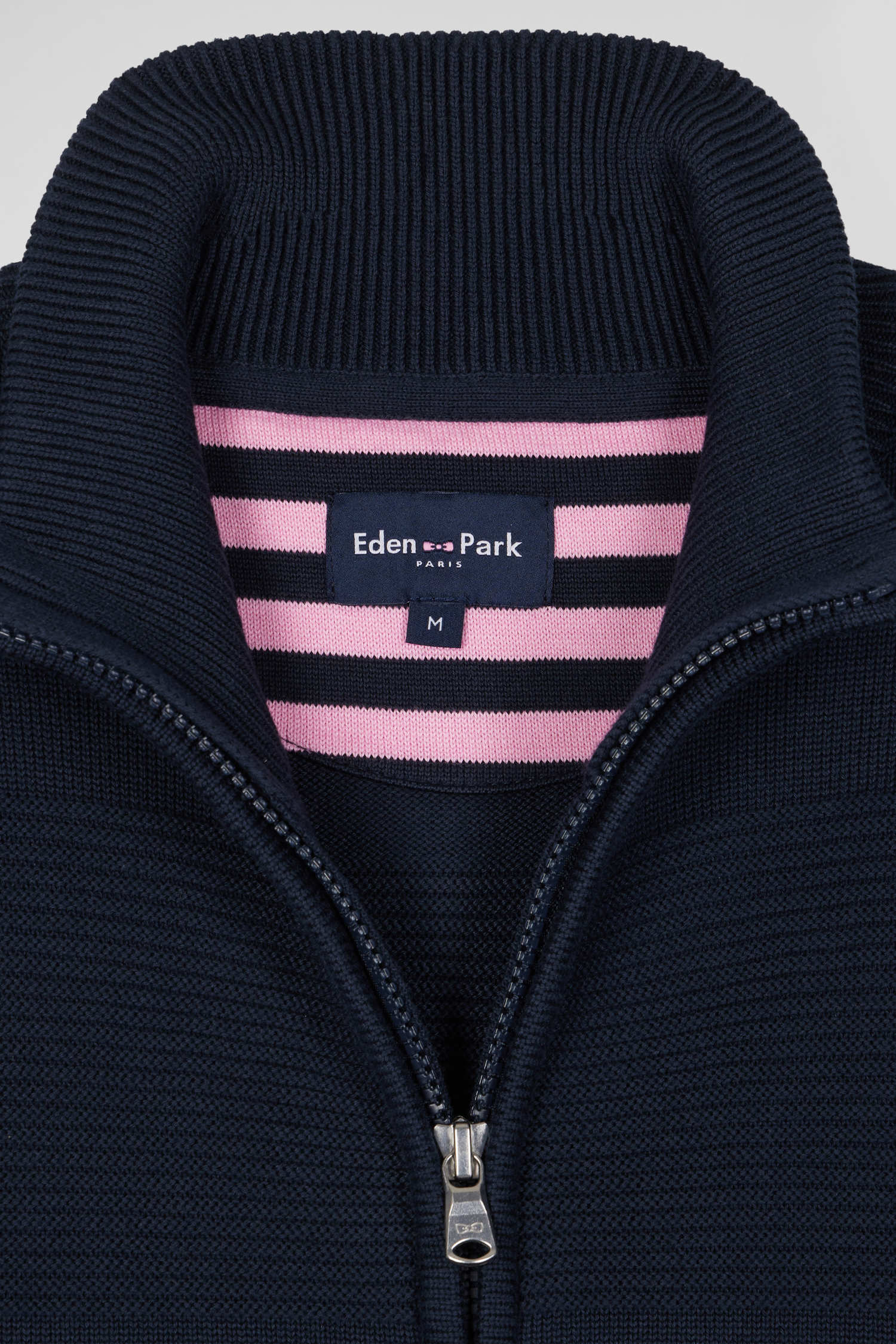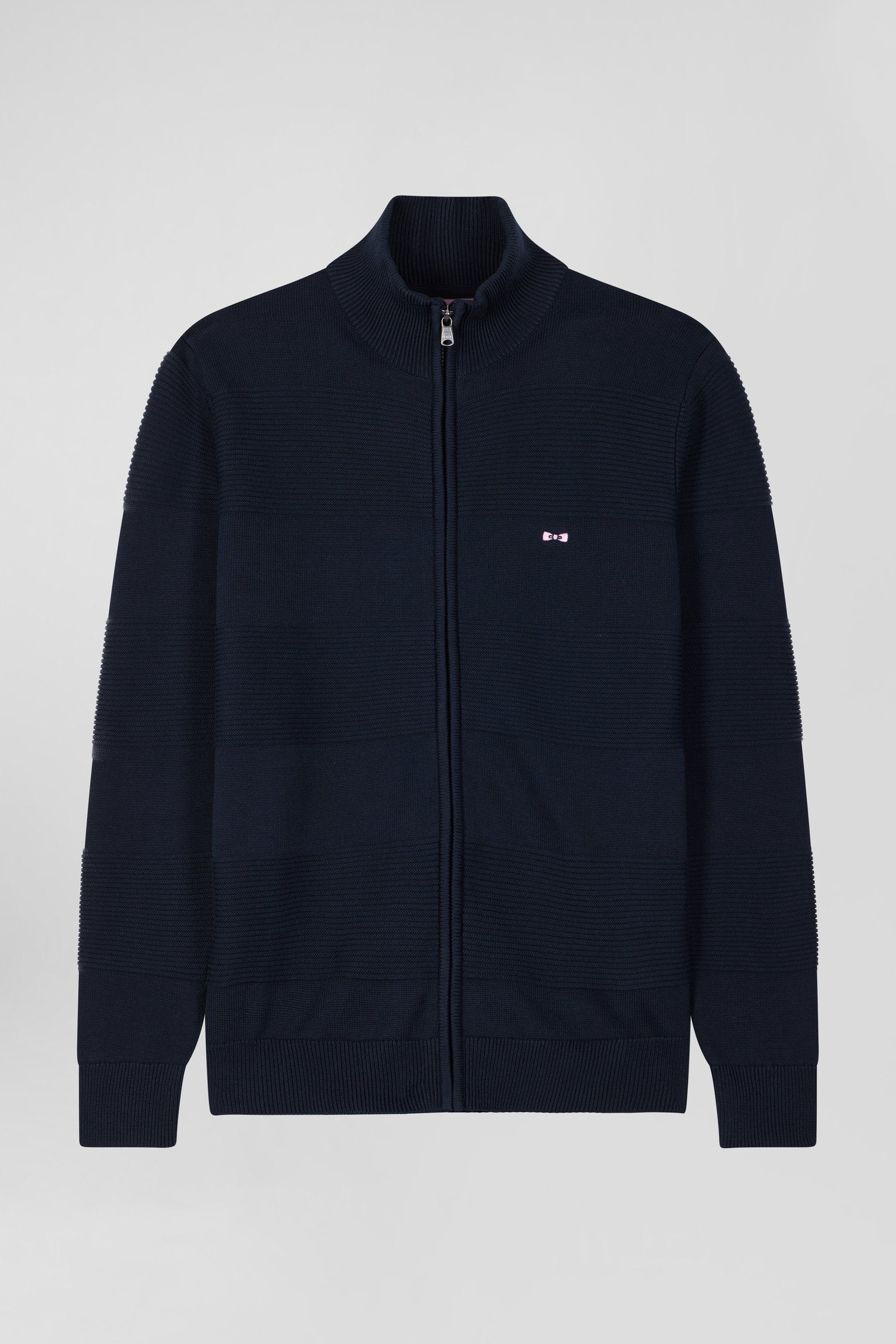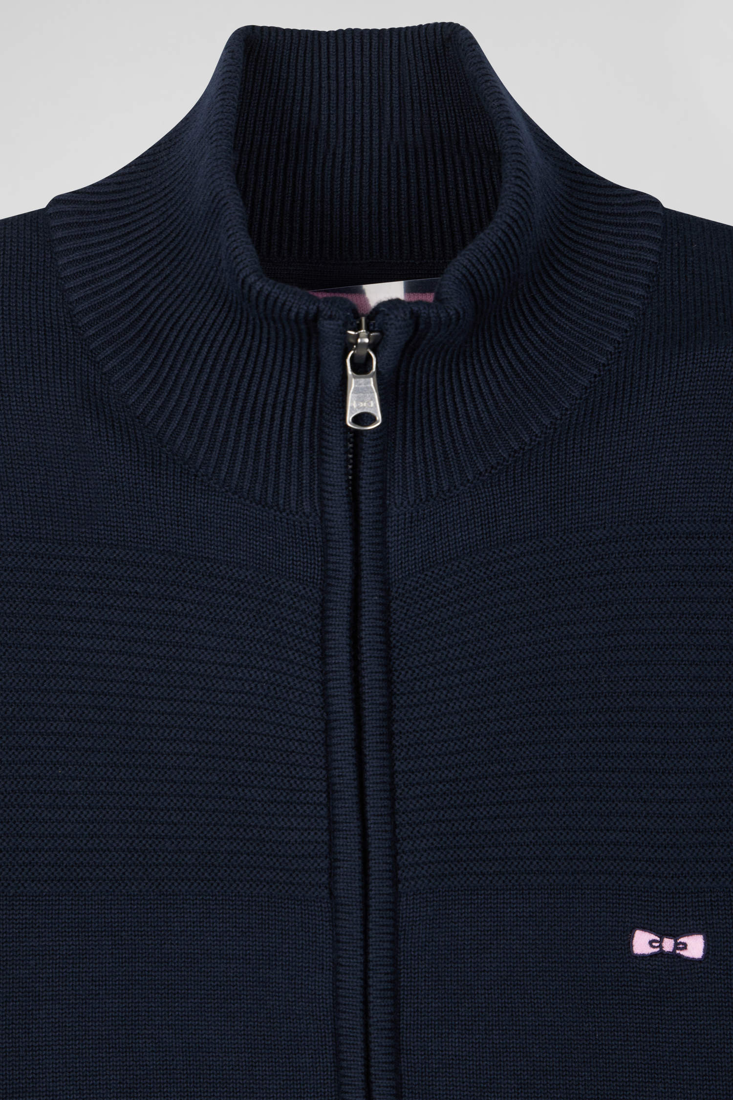 Regular navy blue plain cotton zipped cardigan with knit patterns