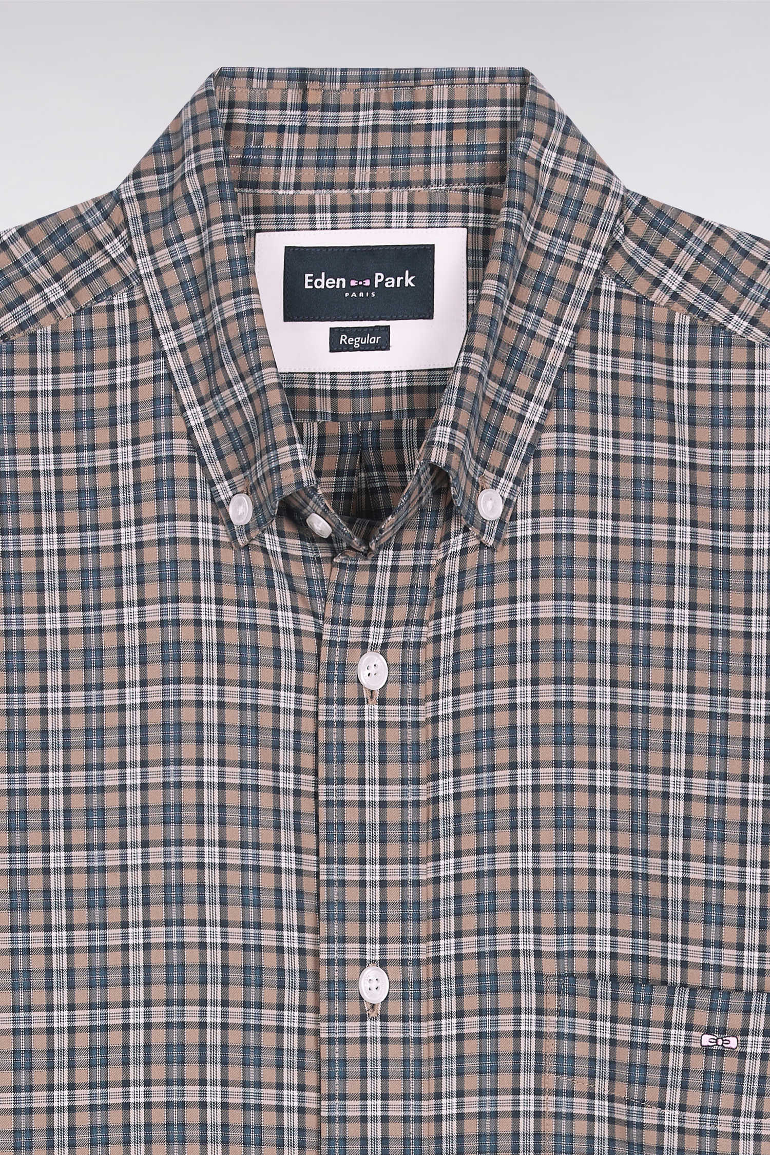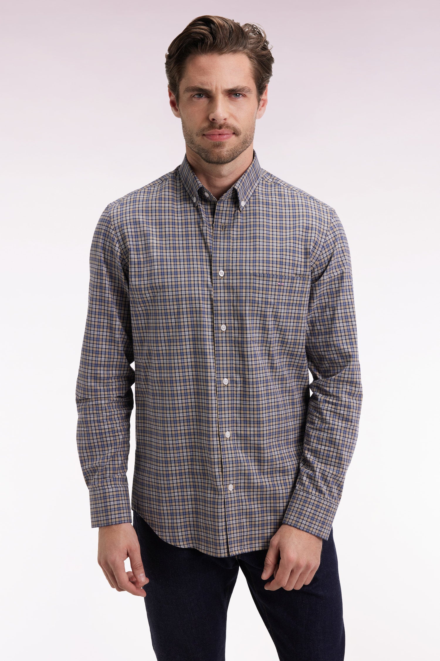 This men's plaid shirt, in navy cotton poplin punctuated with beige or pink, offers natural, understated elegance. Its straight cut and soft cotton make it a comfortable piece, ideal for structuring a casual outfit with style.