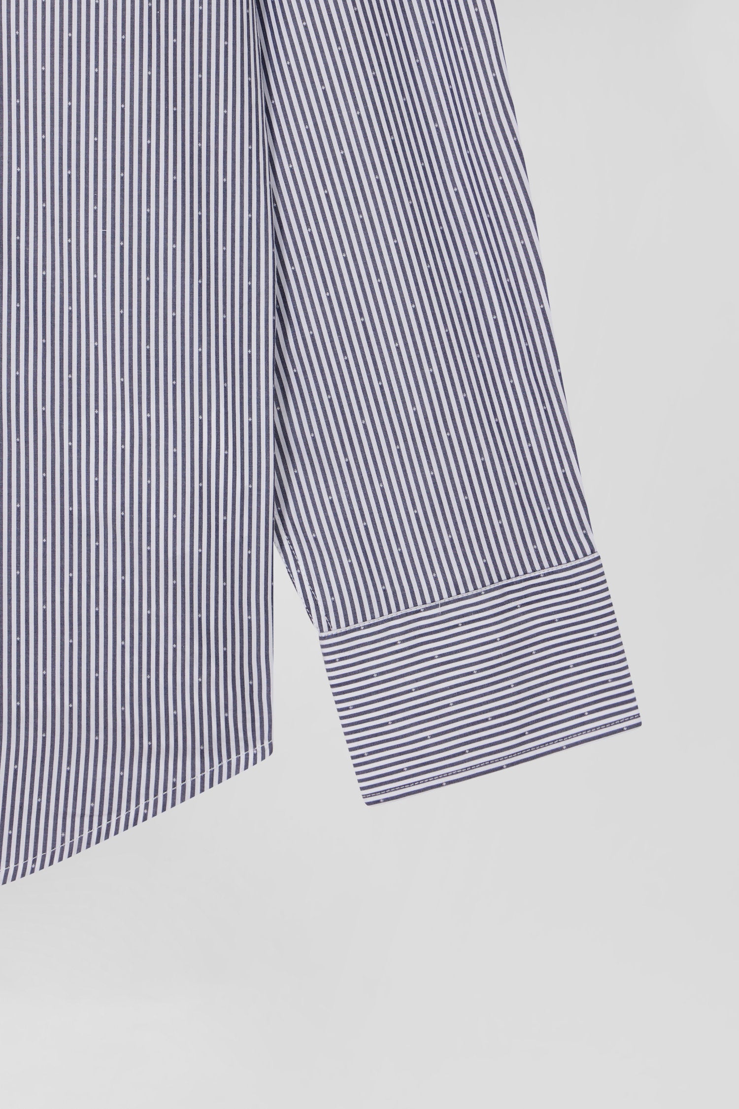 This elegant jacquard cotton shirt is available in two classic colors: navy and white or sky and white. Each version features fine stick stripes that add an understated touch of elegance to this timeless masculine piece. This shirt, cut in a straight Regular fit, features a double collar with buttoned points and a back pleat for added comfort and mobility. Our delicately embroidered bow tie on the breast pocket marks this piece with distinction.