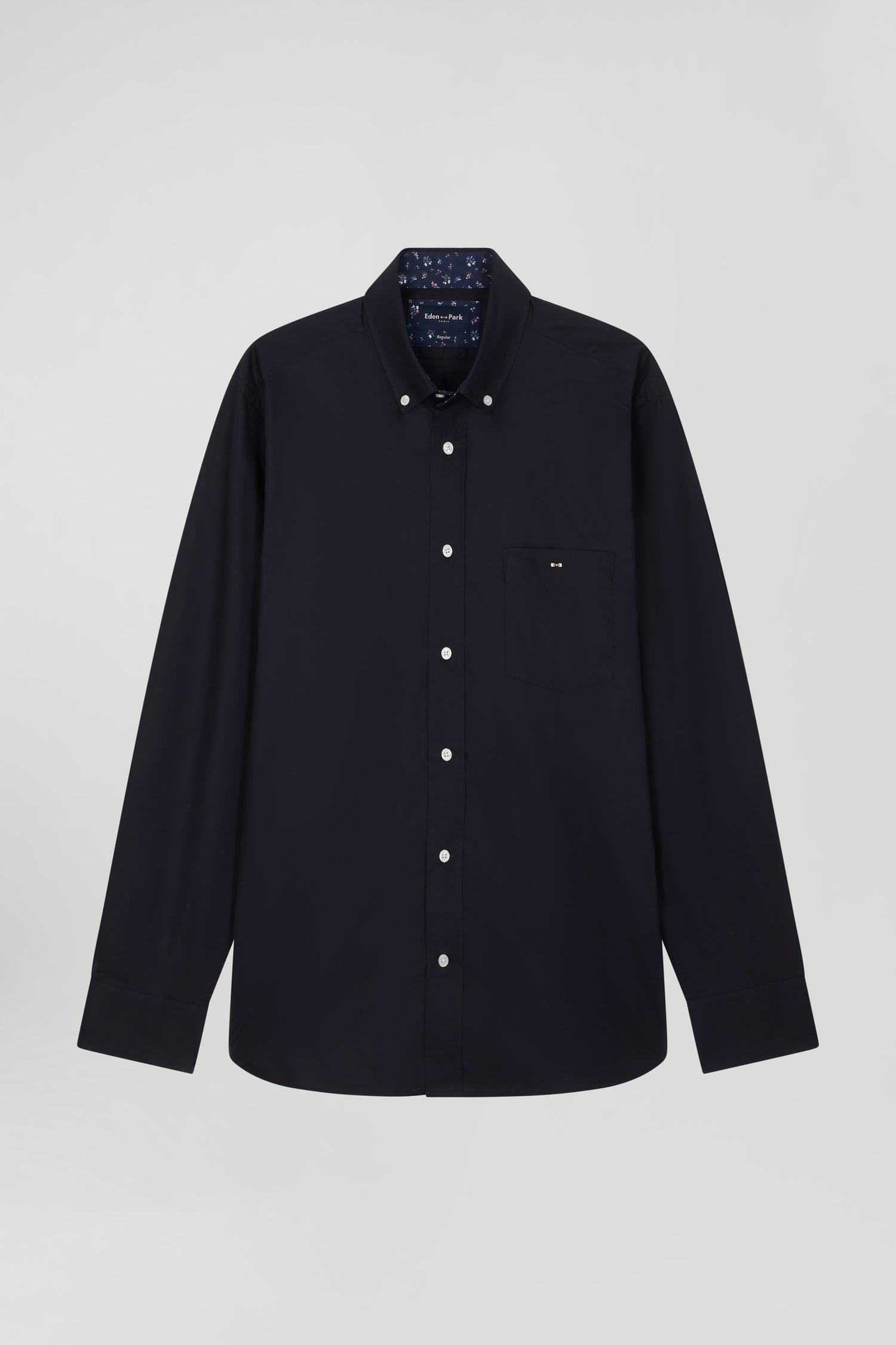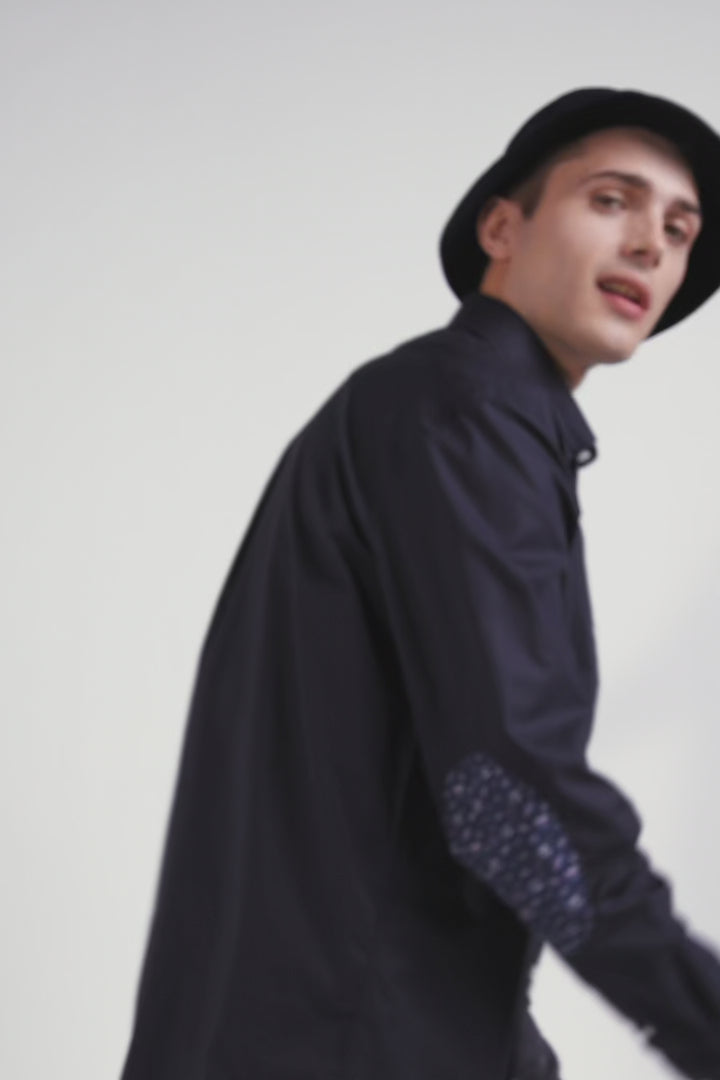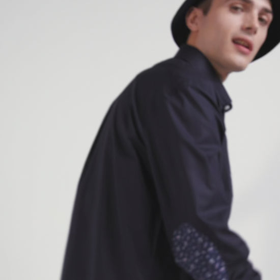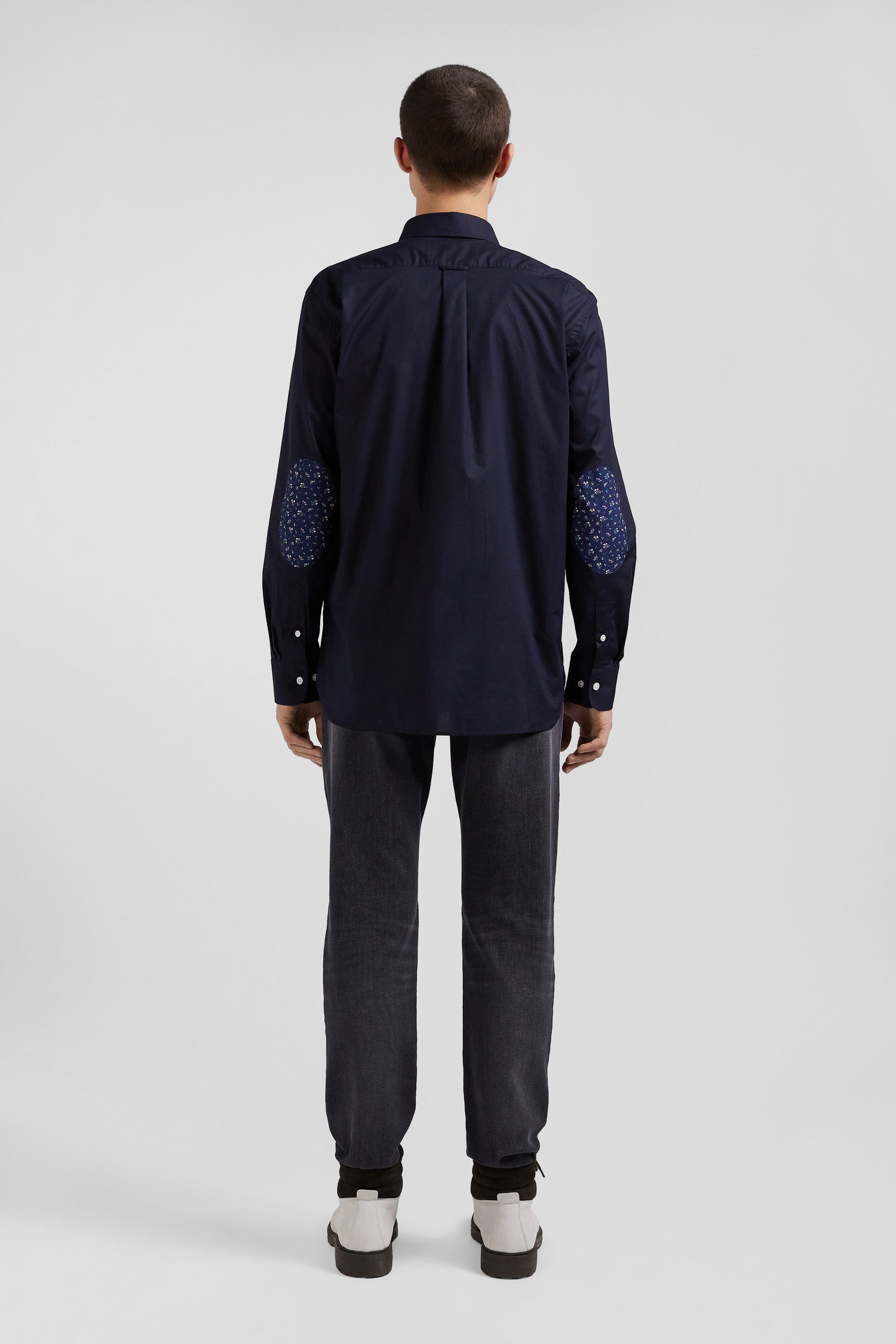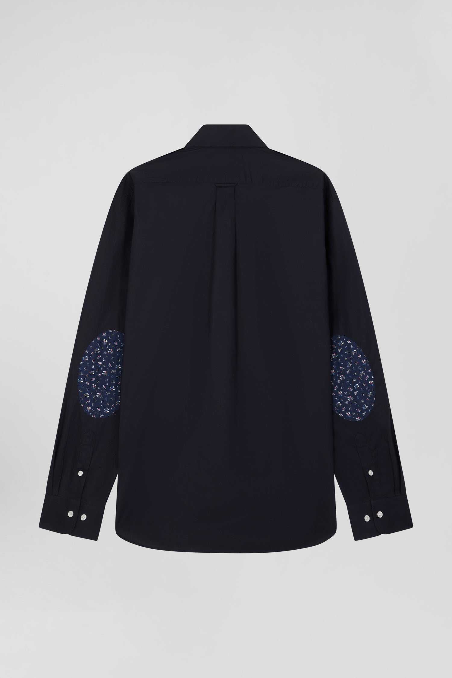 Regular navy blue cotton poplin shirt with button-down collar and printed elbow patches