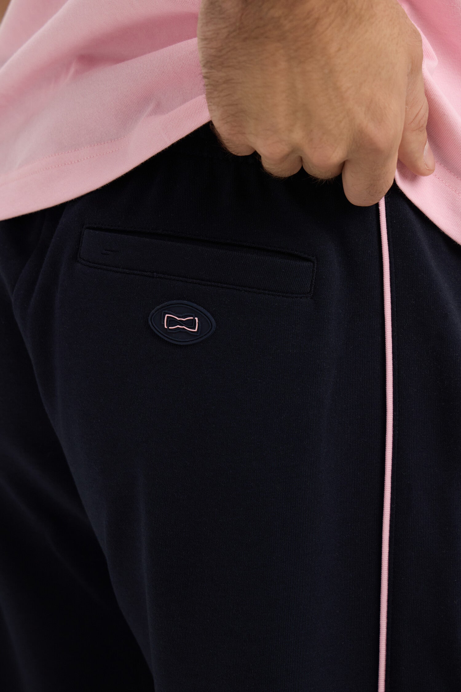 Ce pantalon de jogging masculin réalisé en interlock marine ou noir est conçu pour être porté avec le sweatshirt zippé assorti, promesse d'une allure athlétique. Plus épais que le jersey, il offre chaleur et douceur. Les détails soignés, comme le badge en gomme aligné avec la poche et les passepoils contrastés le long des jambes, soulignent l’attention aux détails propre à notre Maison. Sa ceinture élastique et son cordon de serrage assurent un ajustement parfait pour un style confortable et travaillé à la fois. En été, associez-lui simplement un tee-shirt ou un polo à manches courtes dans un piqué coton assorti.