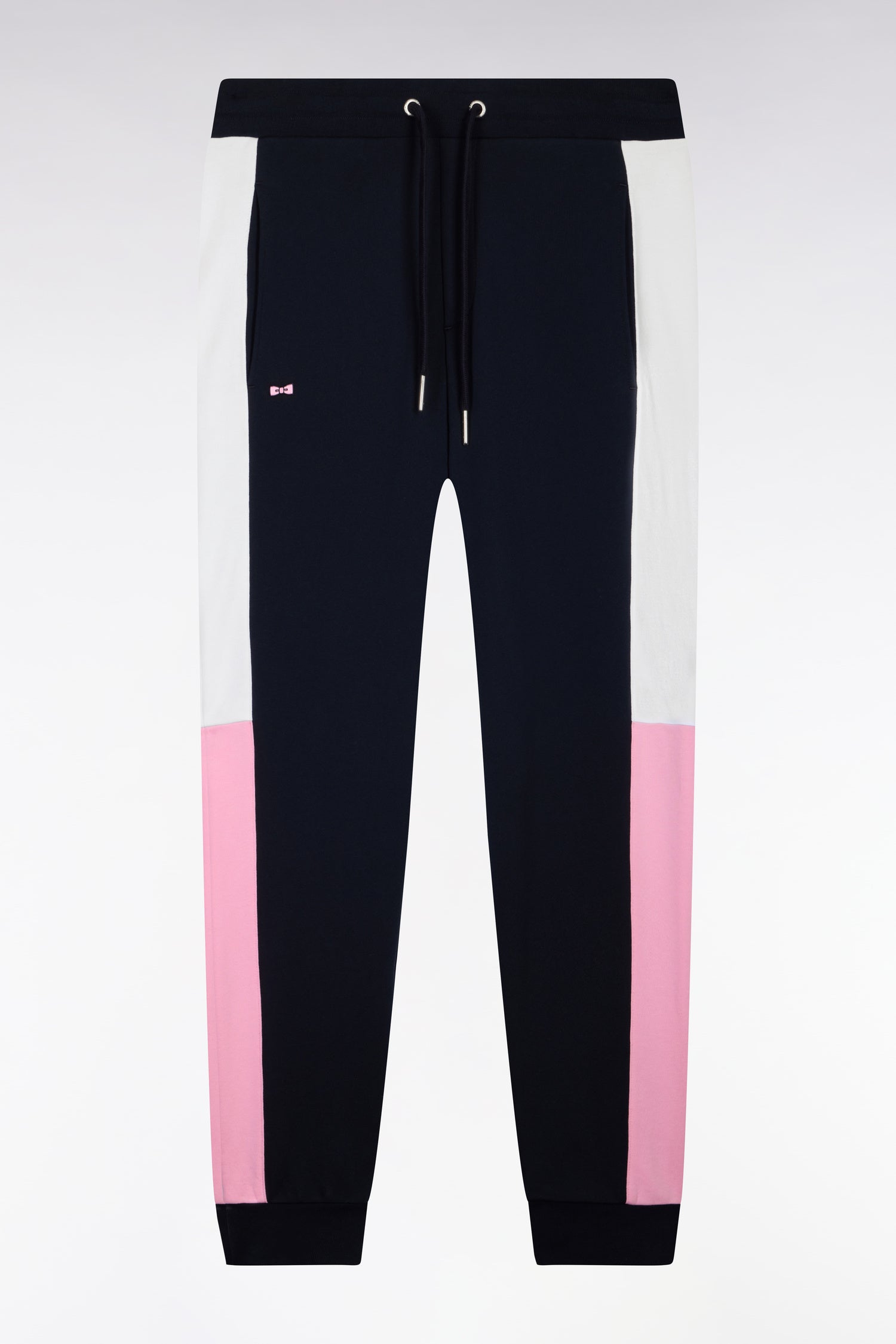 Pour vos week-ends ou vos moments de détente, ce pantalon de jogging homme promet style et confort. Confectionné dans un molleton coton marine doux, il présente un colorblock irrésistiblement French Flair grâce à des découpes de jambe bicolores blanches et roses. Un essentiel décontracté, pilier du vestiaire de notre Maison française. Polo, maillot ou sweatshirt : vous avez le choix pour varier les silhouettes au gré de vos envies.