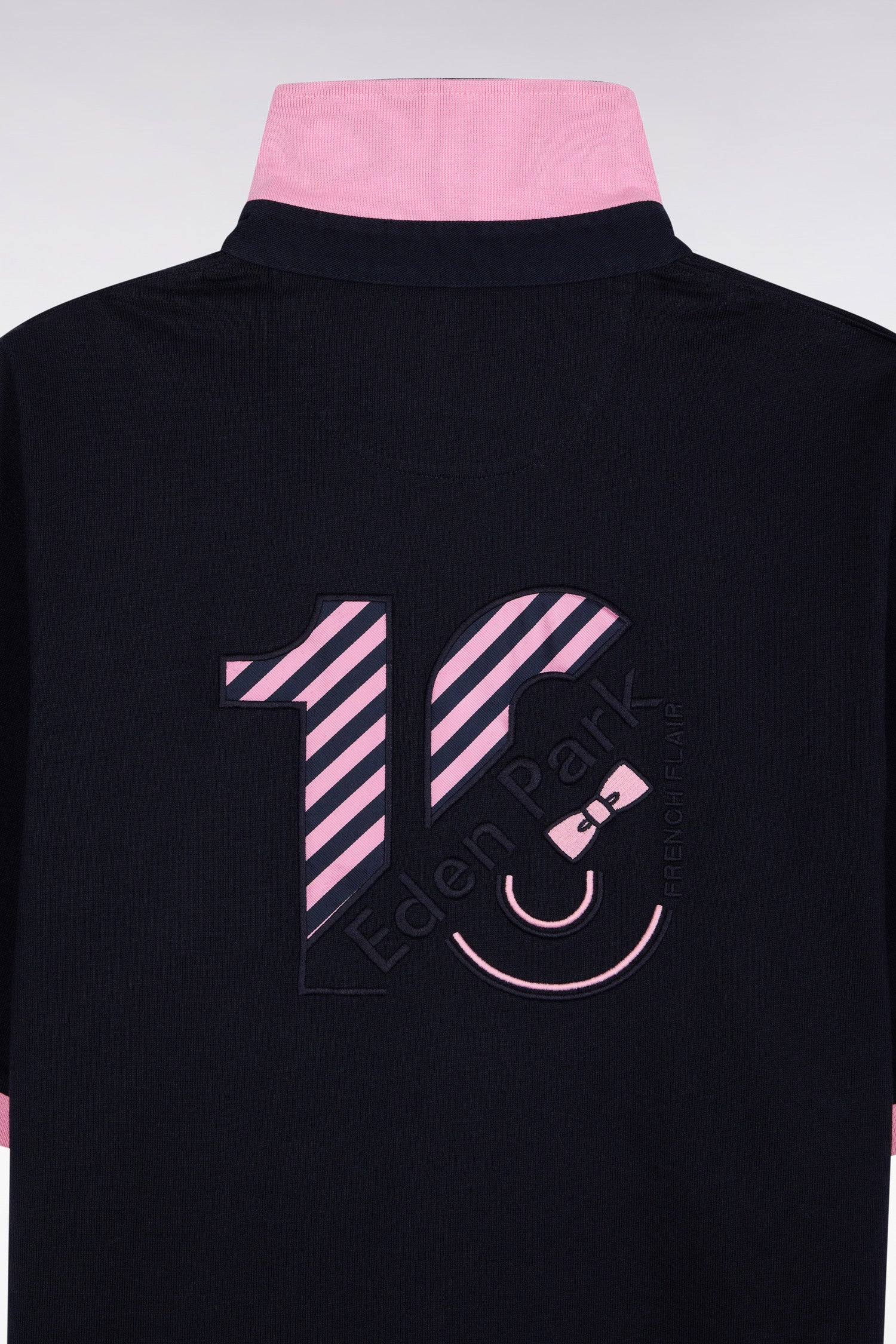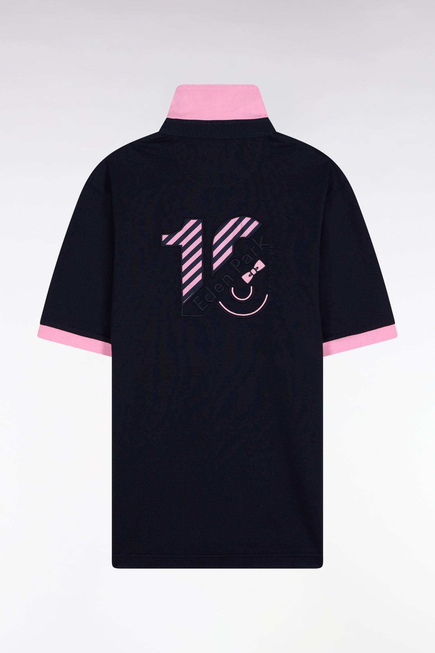 A graphic look and an elegant twist for this short-sleeved jersey, which comes to life with fine pink stripes on a navy base. Inspired by the codes of rugby, it features a button-down collar, a comfortable fit and the bowtie embroidery that identifies it as part of the Eden Park universe. On the back, a large embroidery affirms the rugby inspirations of this unique model, designed as a tribute to rugby but resolutely at ease in the city.
