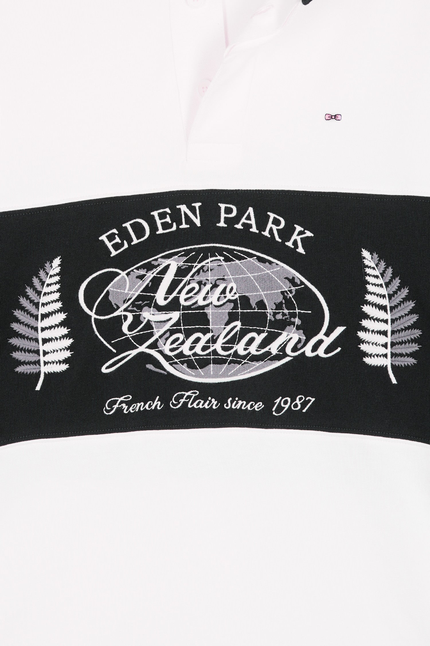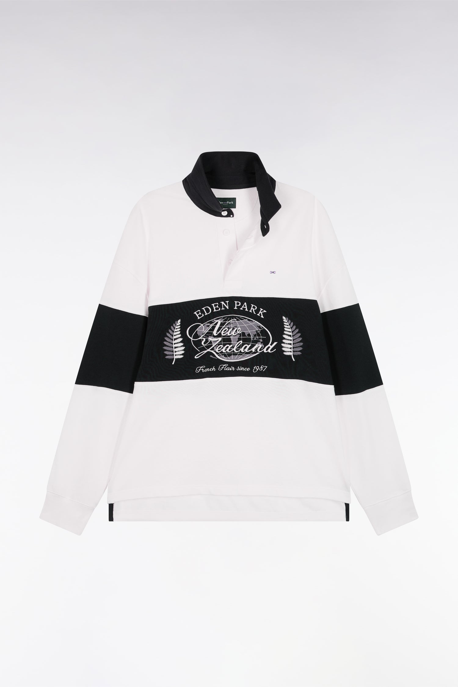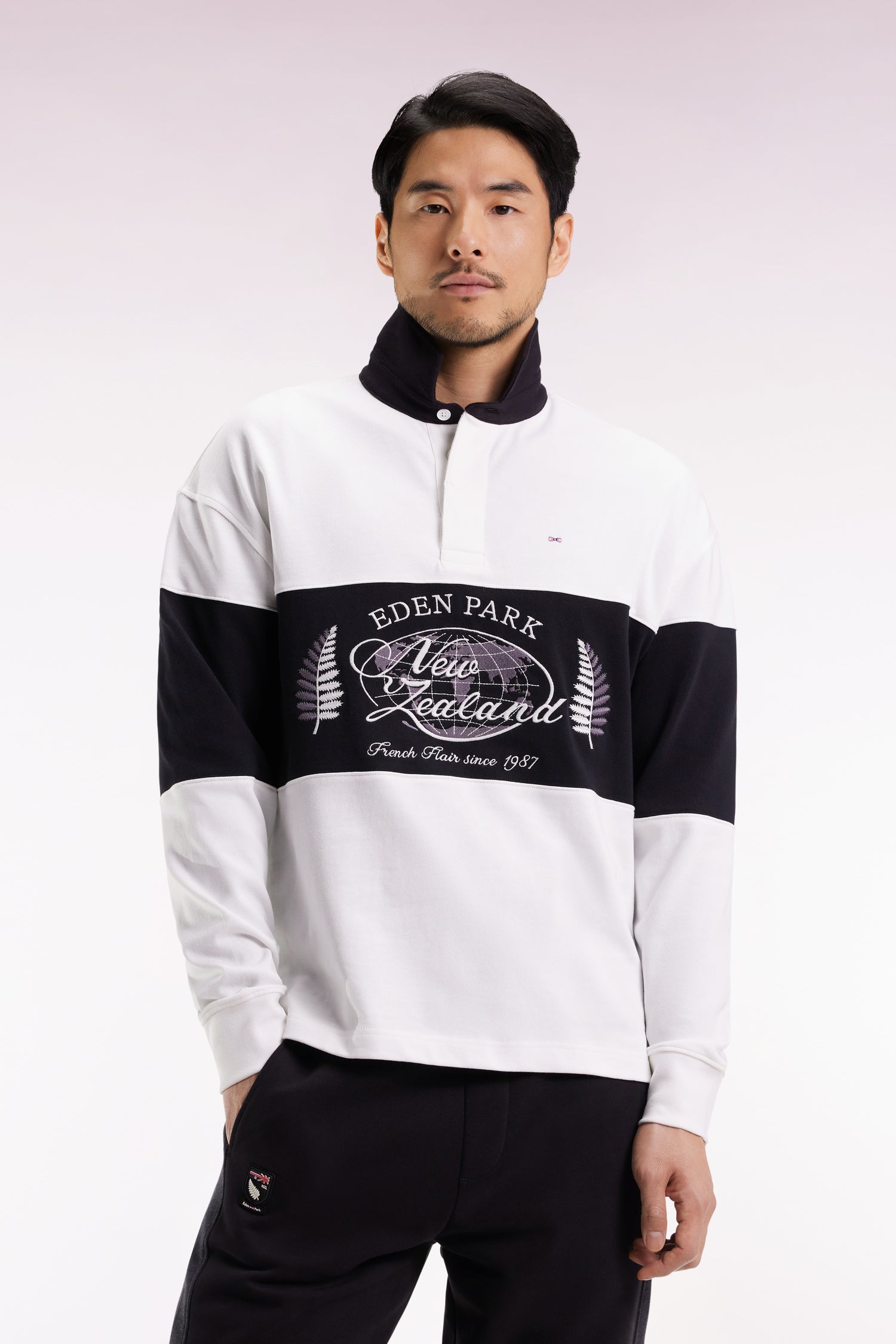 A nod to our company's rugby DNA, this long-sleeved jersey celebrates the link between Eden Park and New Zealand. Made from thick cotton jersey for warmth and comfort, it features a wide contrast cutout and signature New Zealand embroidery embellished with the fern emblem on the front. The contrasting twill collar adds a touch of refinement to this iconic piece of sport-chic wardrobe with slightly vintage influences.