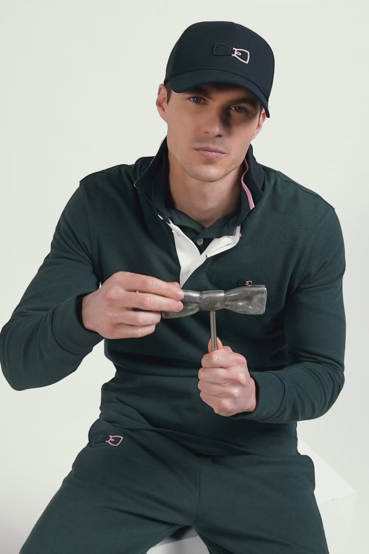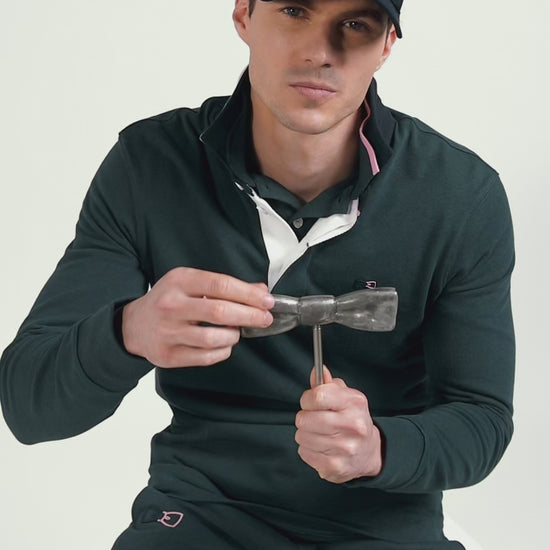 This discreetly elegant long-sleeved men's jersey, with its tricolored ribbon collar enhanced by a pink cotton twill underside, is enhanced by a large embroidery on the back featuring a tricolored bow tie, the Eden Park hallmark also used on a rubber badge on a felt base to adorn its bib. A harmonious blend of colors and high-quality materials gives this masculine piece a refined yet sporty allure.