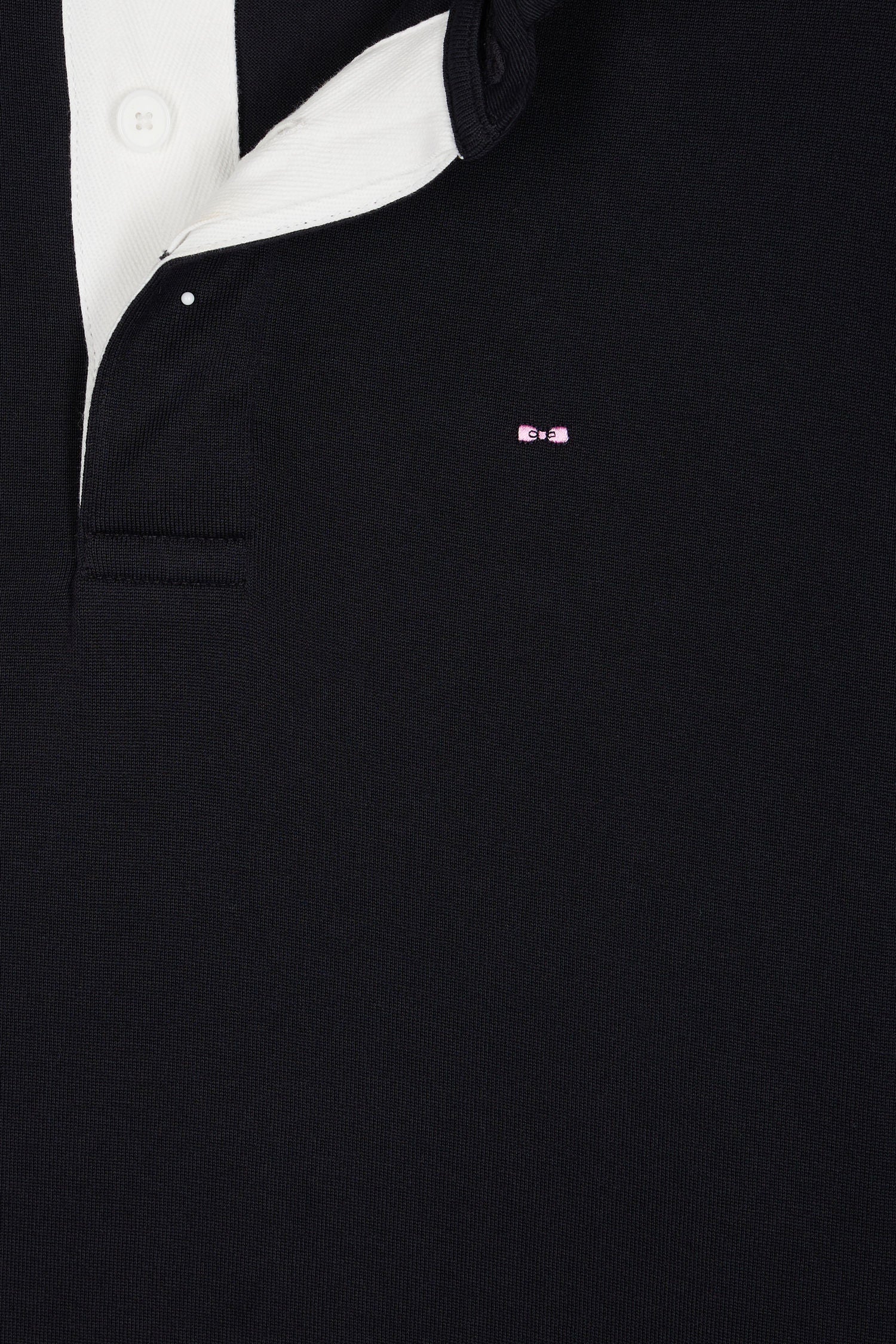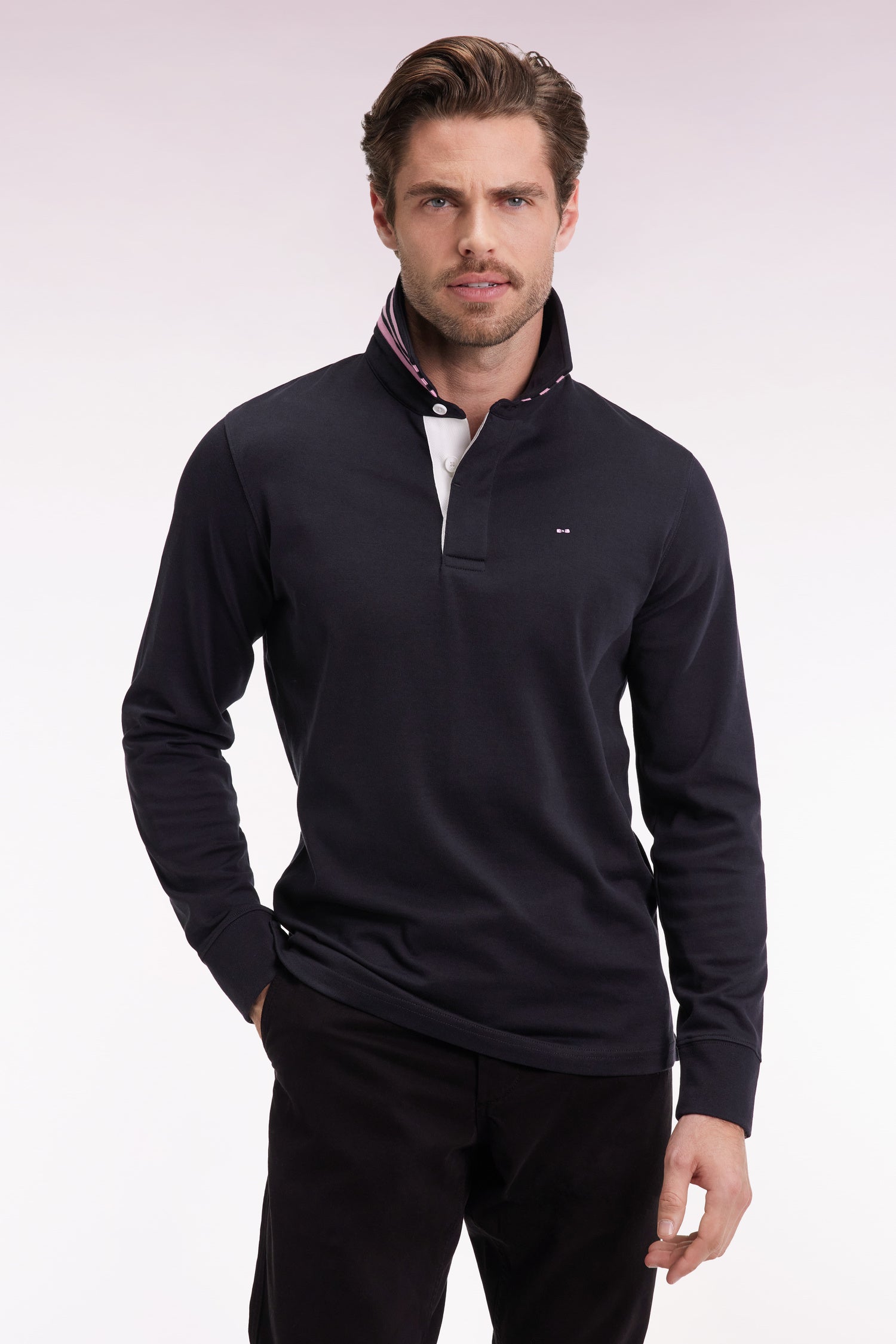 4-thread-count Pima cotton jersey and a straight cut finished with flat-knit ribbing give this long-sleeved jersey a long-lasting fit. The white-lined button placket and navy collar provide an elegant contrast, enhanced by a fine stripe under-collar. A comfortable, timeless sport-chic model designed for the modern man.