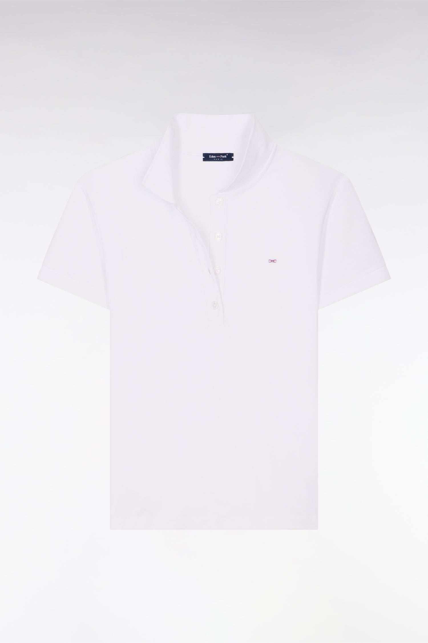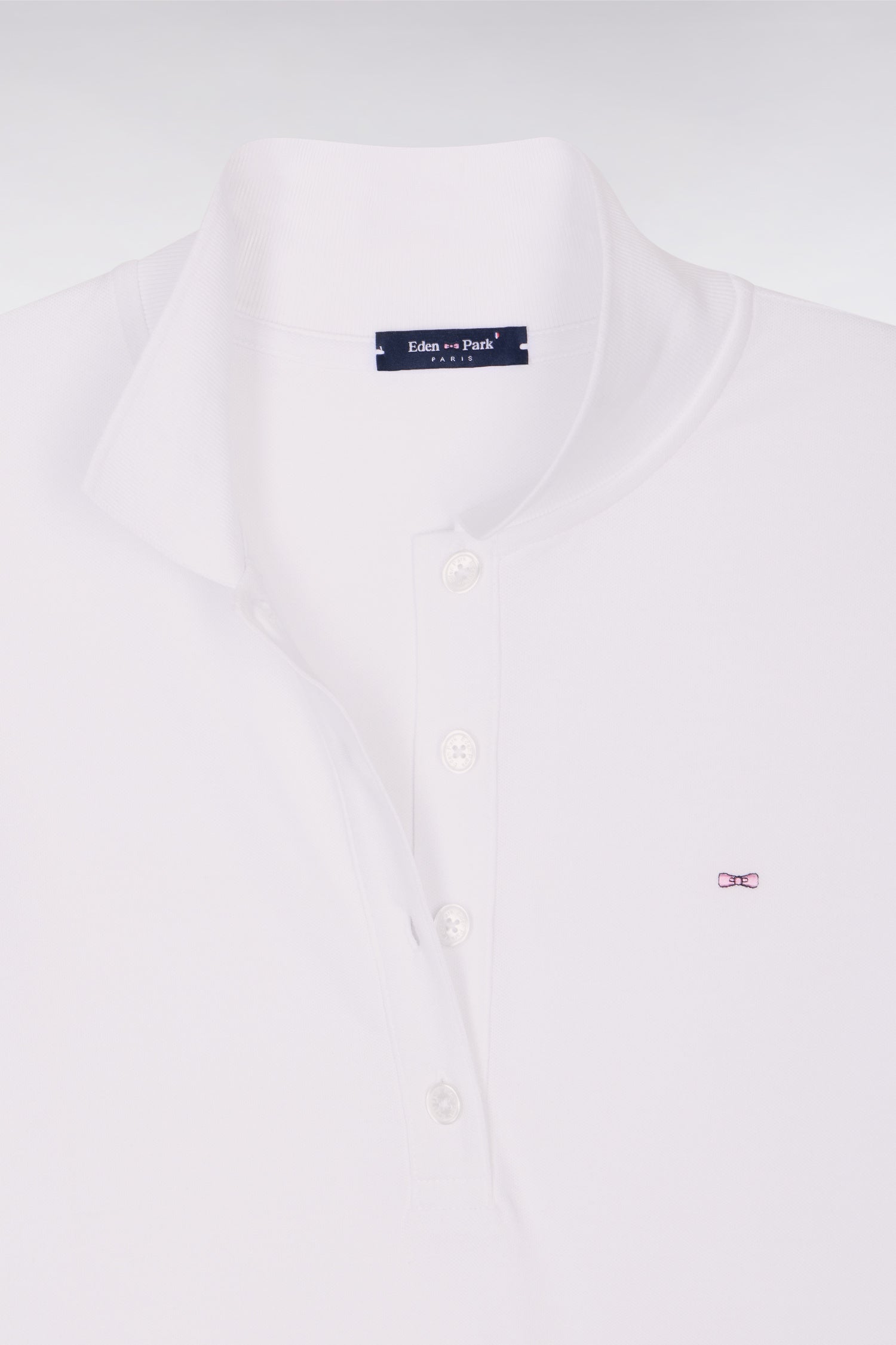 Ce polo femme à manches courtes confectionné dans un coton stretch doux et léger est disponible en coloris blanc, marine ou rose. Sa coupe slim plus cintrée assure une allure chic et sportive au quotidien. Ce modèle iconique arbore notre broderie signature : l'emblème nœud papillon Eden Park.