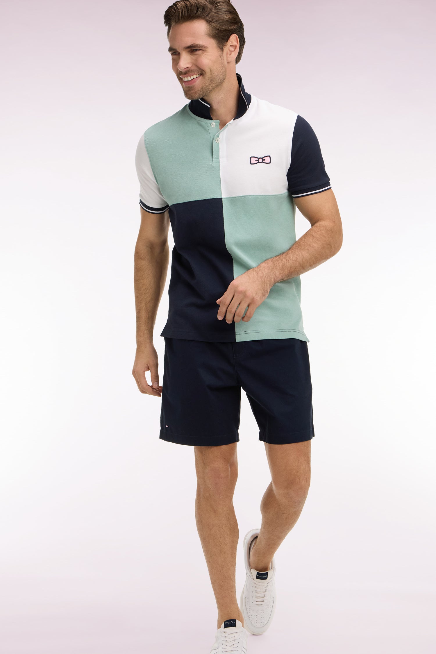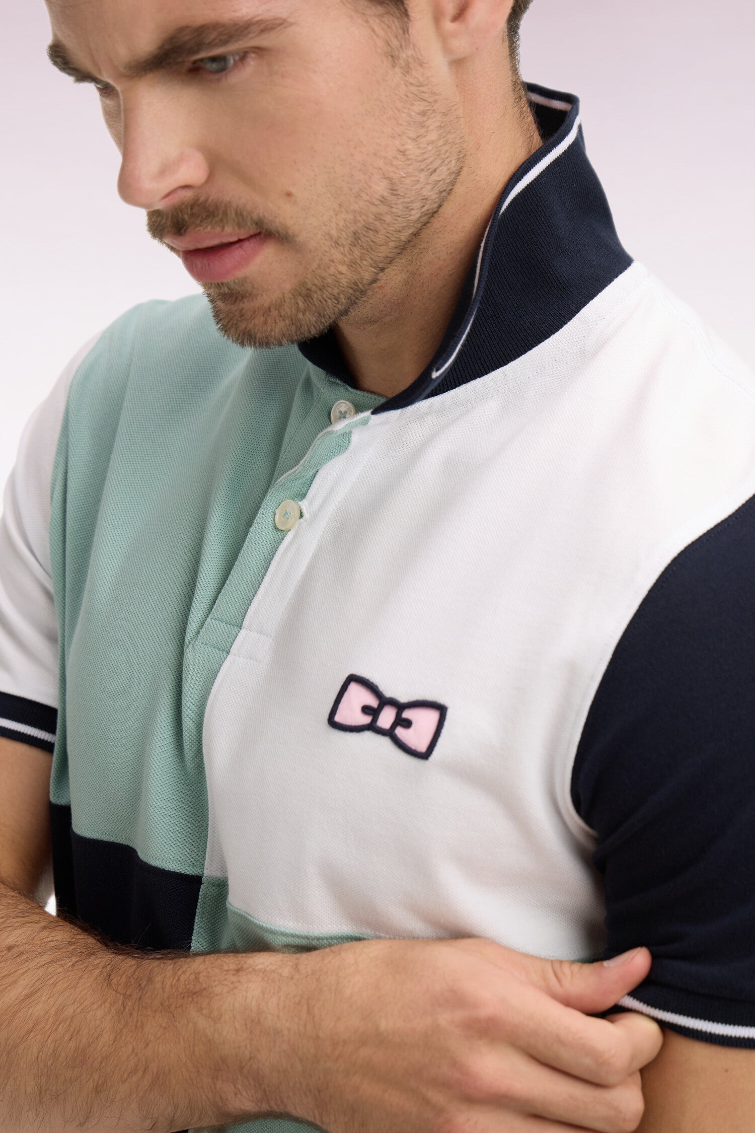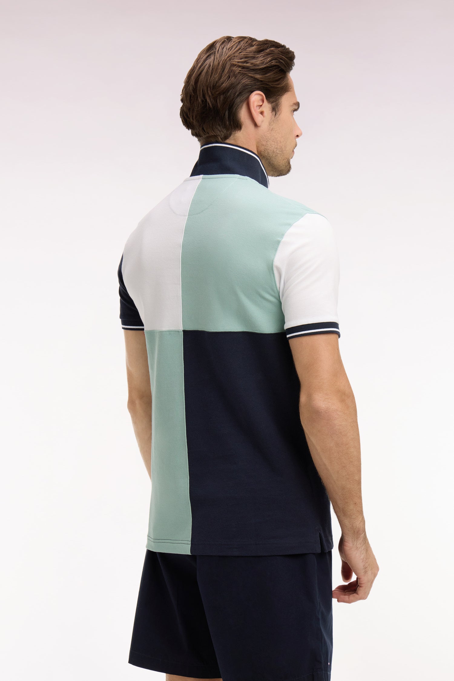 Ce polo en piqué de coton s’illustre par des contrastes soignés travaillés en cadrans et un liseré coordonné sur le col et les bas de manches, référence discrète aux codes du rugby et aux maillots les plus mythiques. Sa coupe nette et ses finitions soignées composent une silhouette moderne, facile à coordonner au quotidien. Ce polo à manches courtes est décliné en 4 coloris pastel : ciel, rose, jaune ou vert d'eau, toujours associés à notre marine signature.