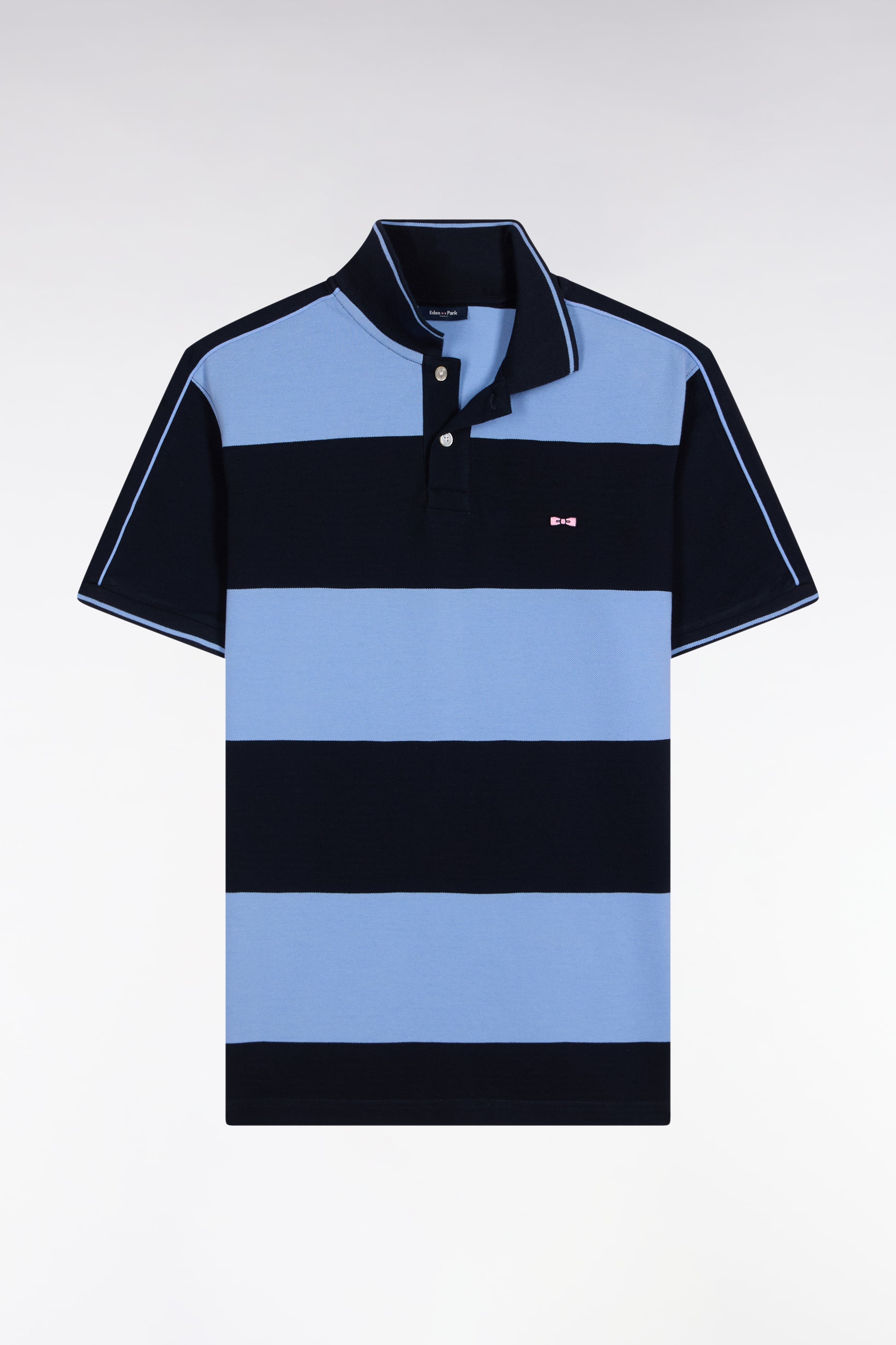 Horizontal rugby stripes have become an Eden Park signature. Here, they add a graphic touch to our polo shirt, whose plain sleeves and polo collar are highlighted by piping in the color of the stripes. Striped ribbing and bow-tie embroidery ensure elegance and support for this straight polo. This emblematic model from the house's French Flair wardrobe is available in three of our wardrobe's signature colors: pink and navy, sky and navy or black and ecru. Which will you prefer?