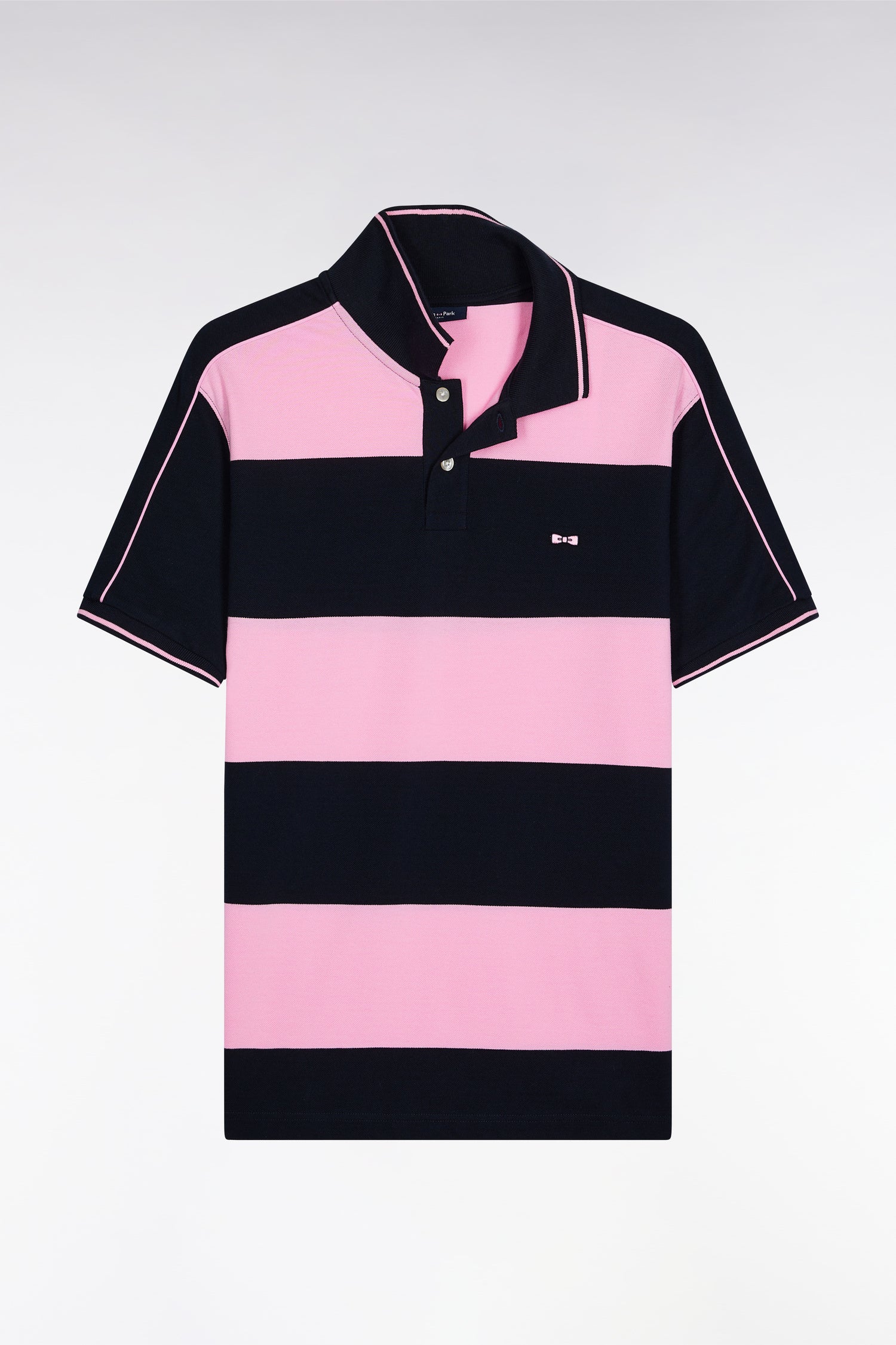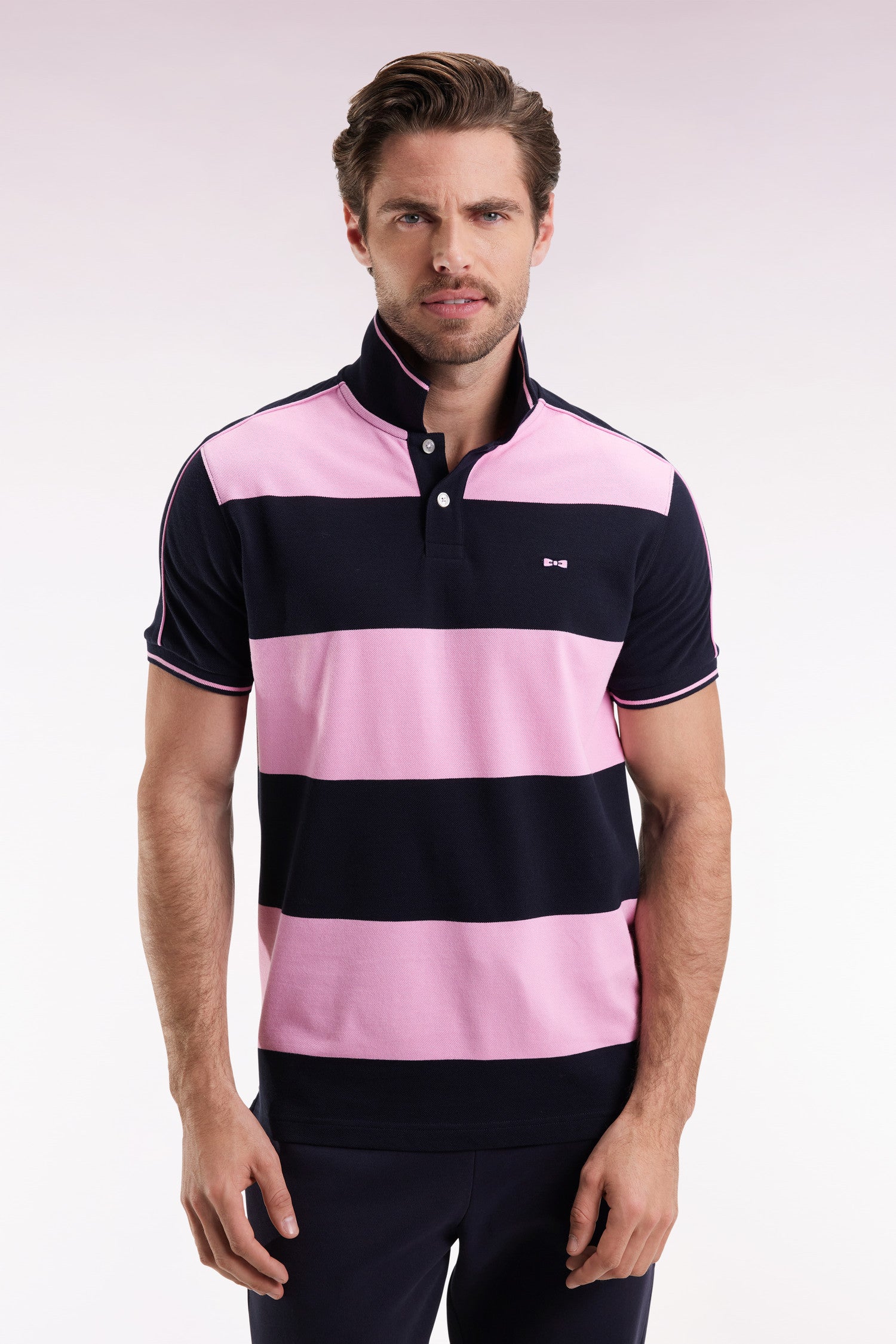Horizontal rugby stripes have become an Eden Park signature. Here, they add a graphic touch to our polo shirt, whose plain sleeves and polo collar are highlighted by piping in the color of the stripes. Striped ribbing and bow-tie embroidery ensure elegance and support for this straight polo. This emblematic model from the house's French Flair wardrobe is available in three of our wardrobe's signature colors: pink and navy, sky and navy or black and ecru. Which will you prefer?