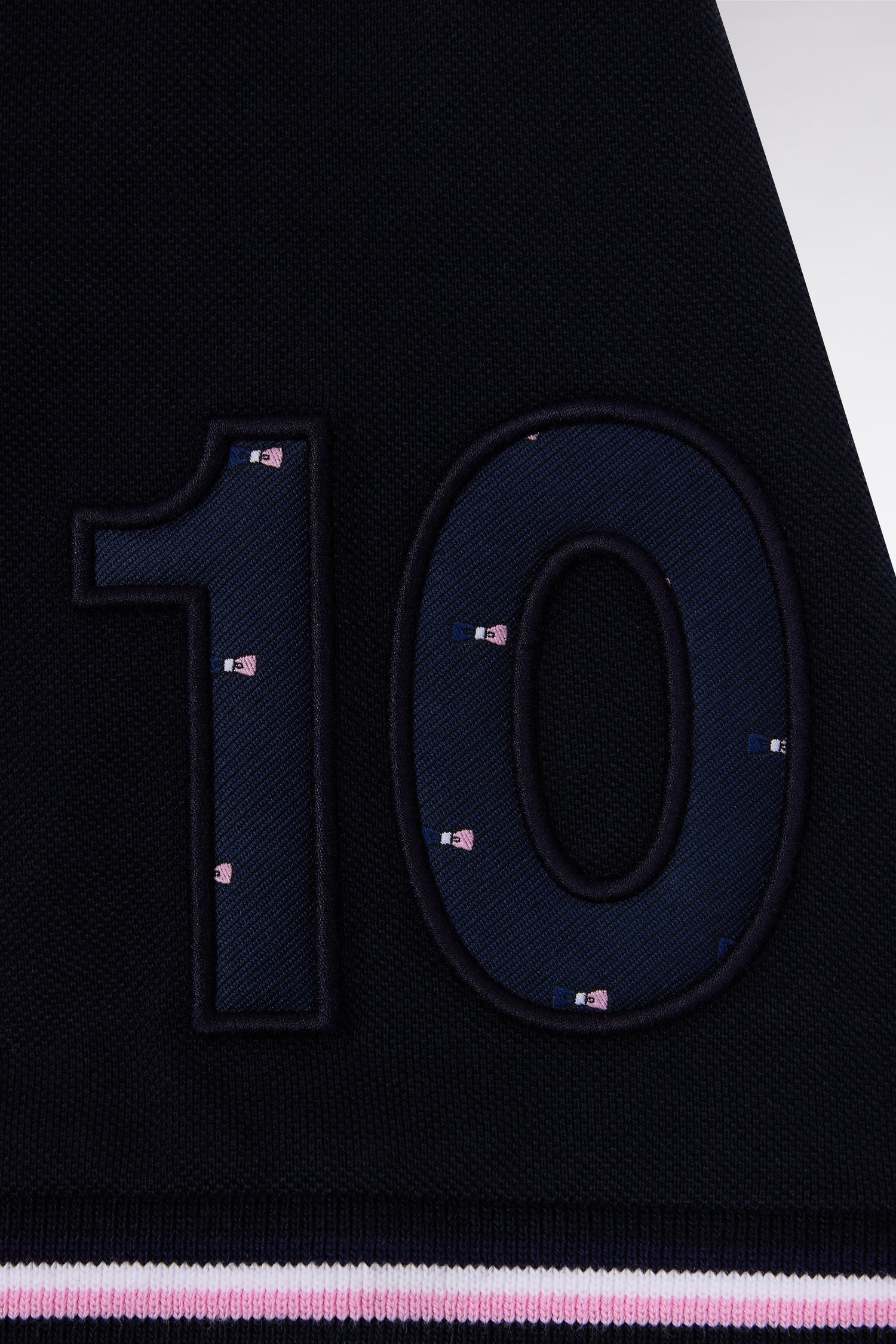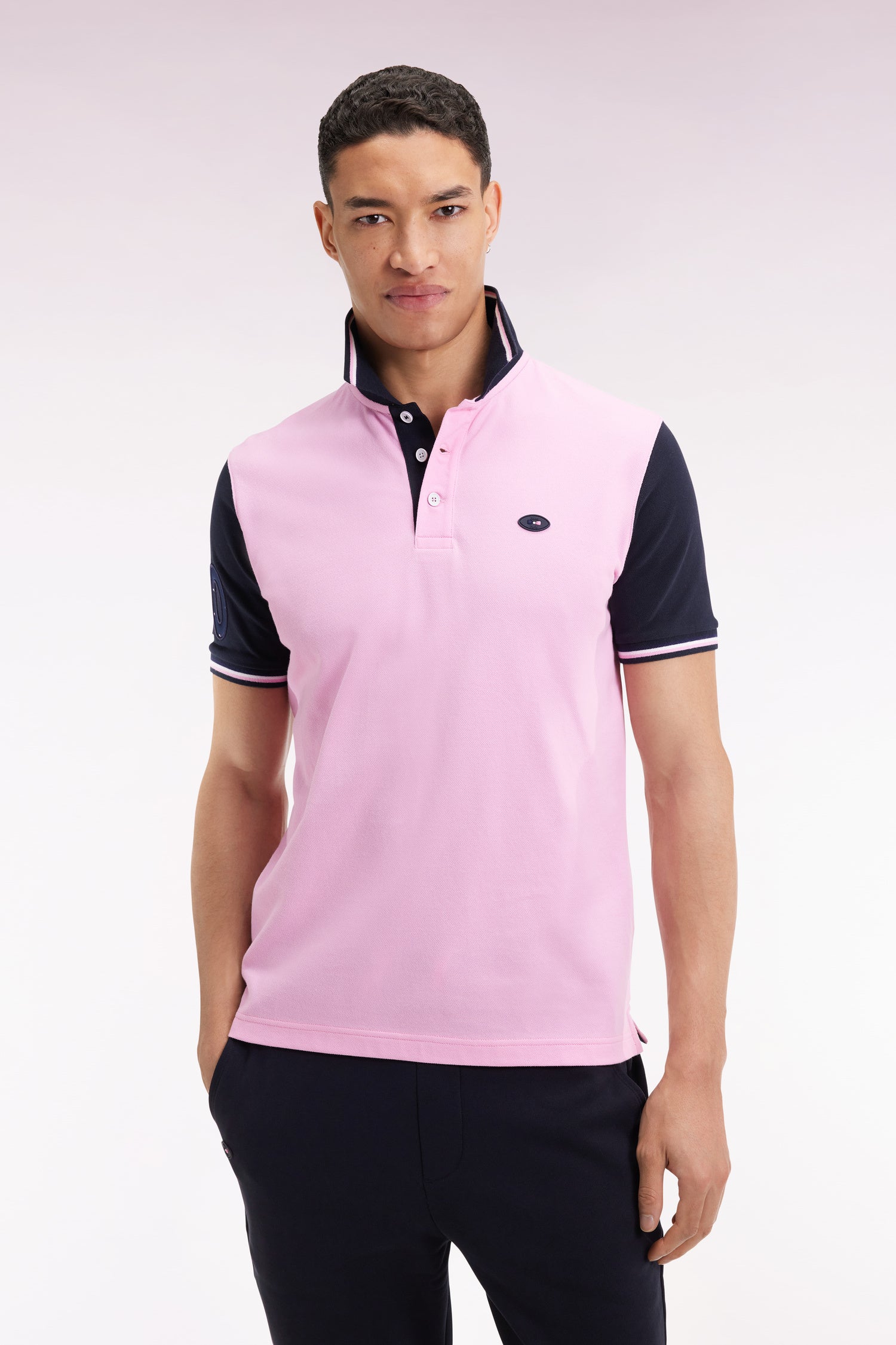 Short-sleeved pink and navy polo shirt with tricolored trim, straight cut