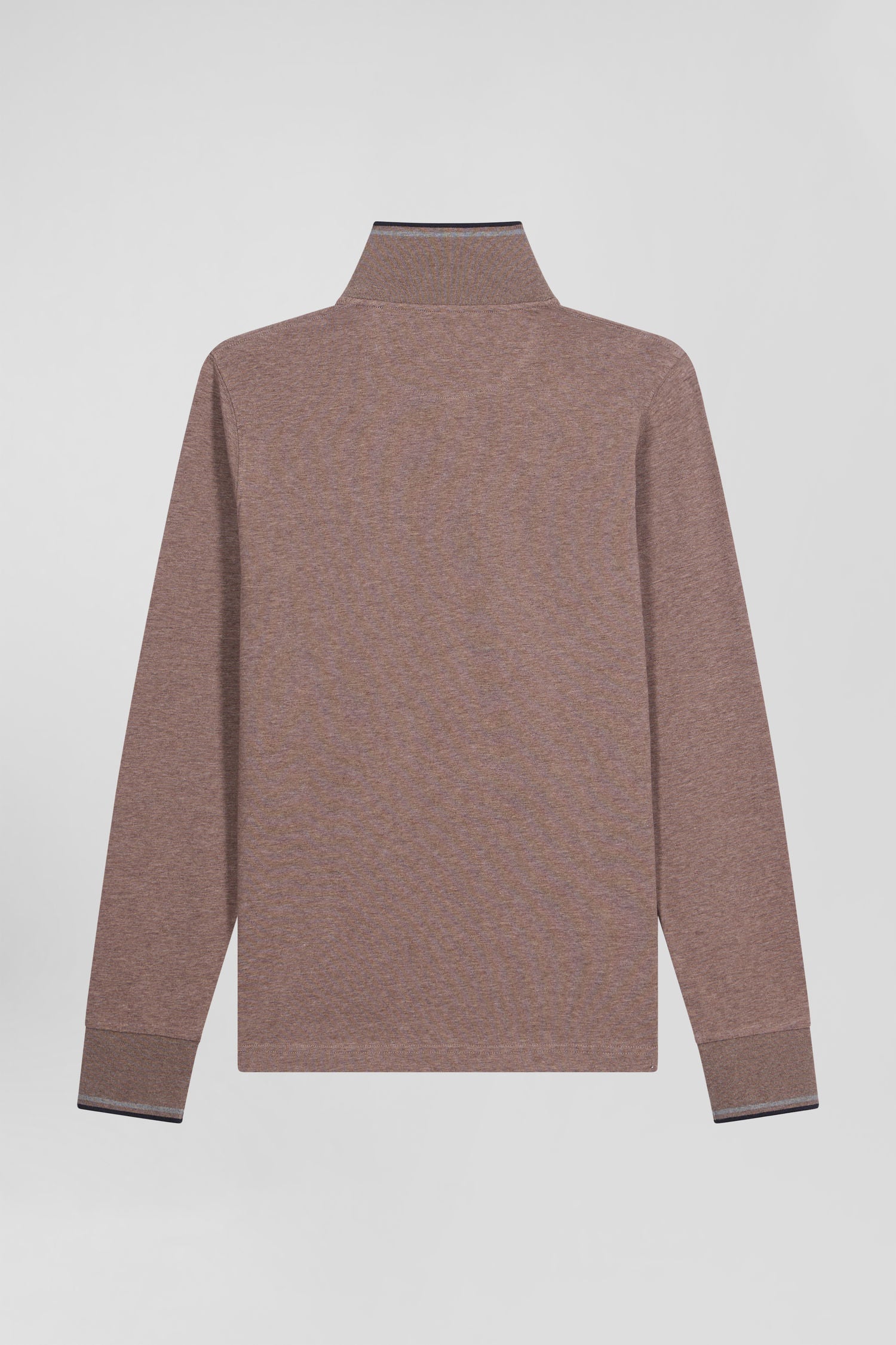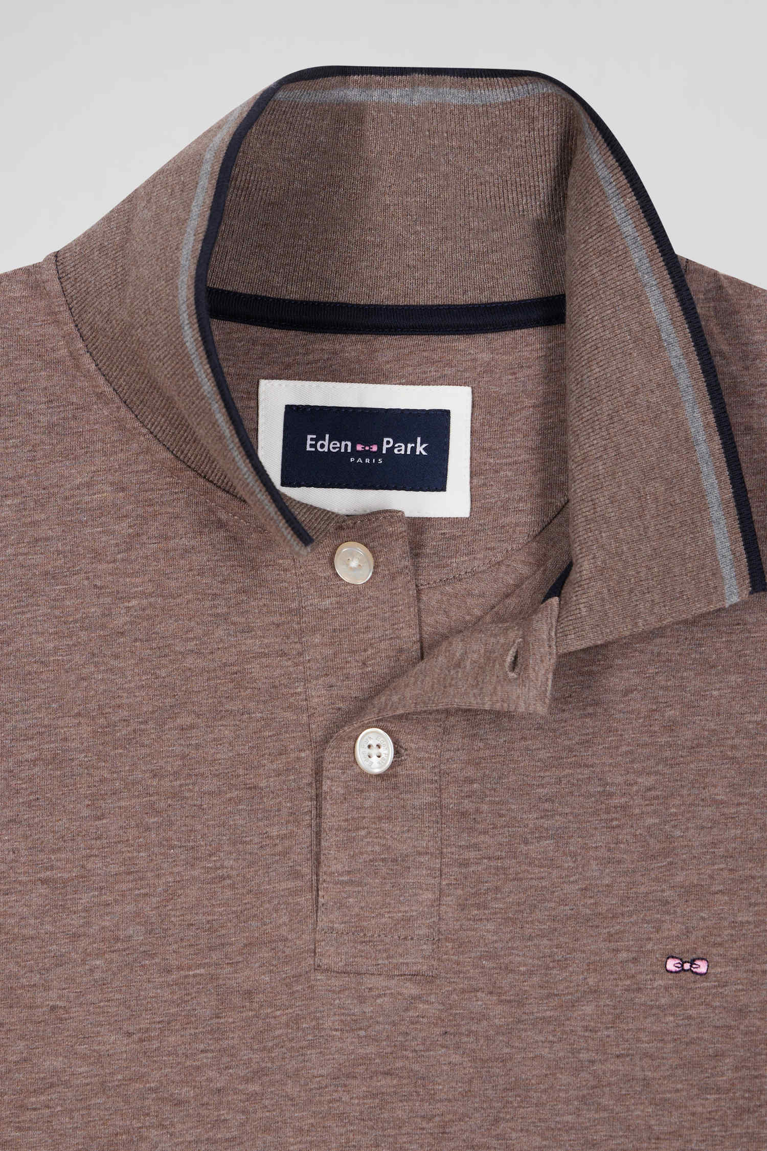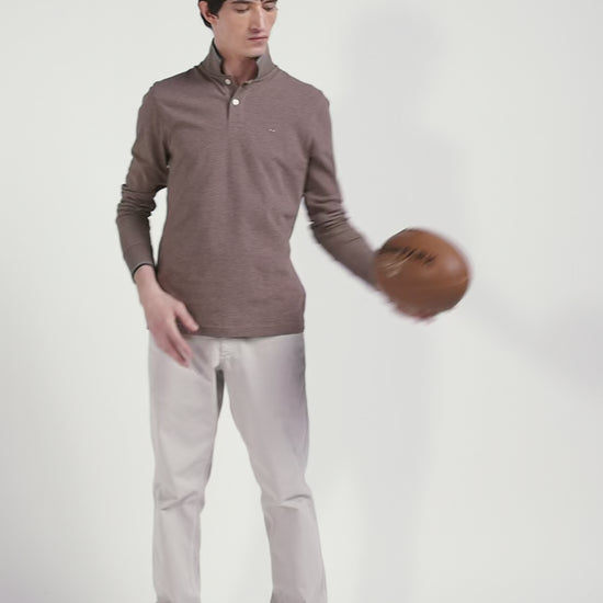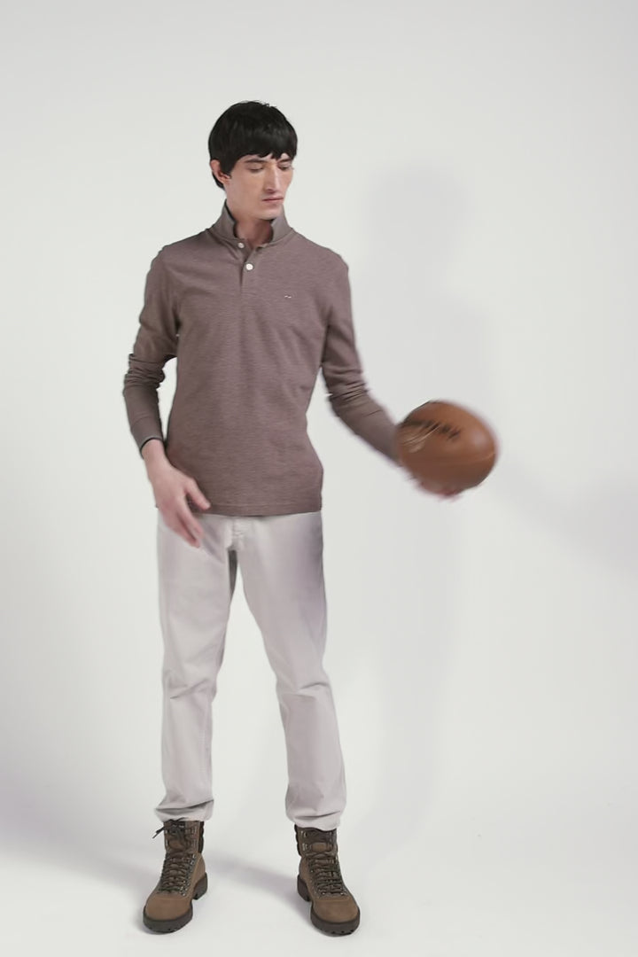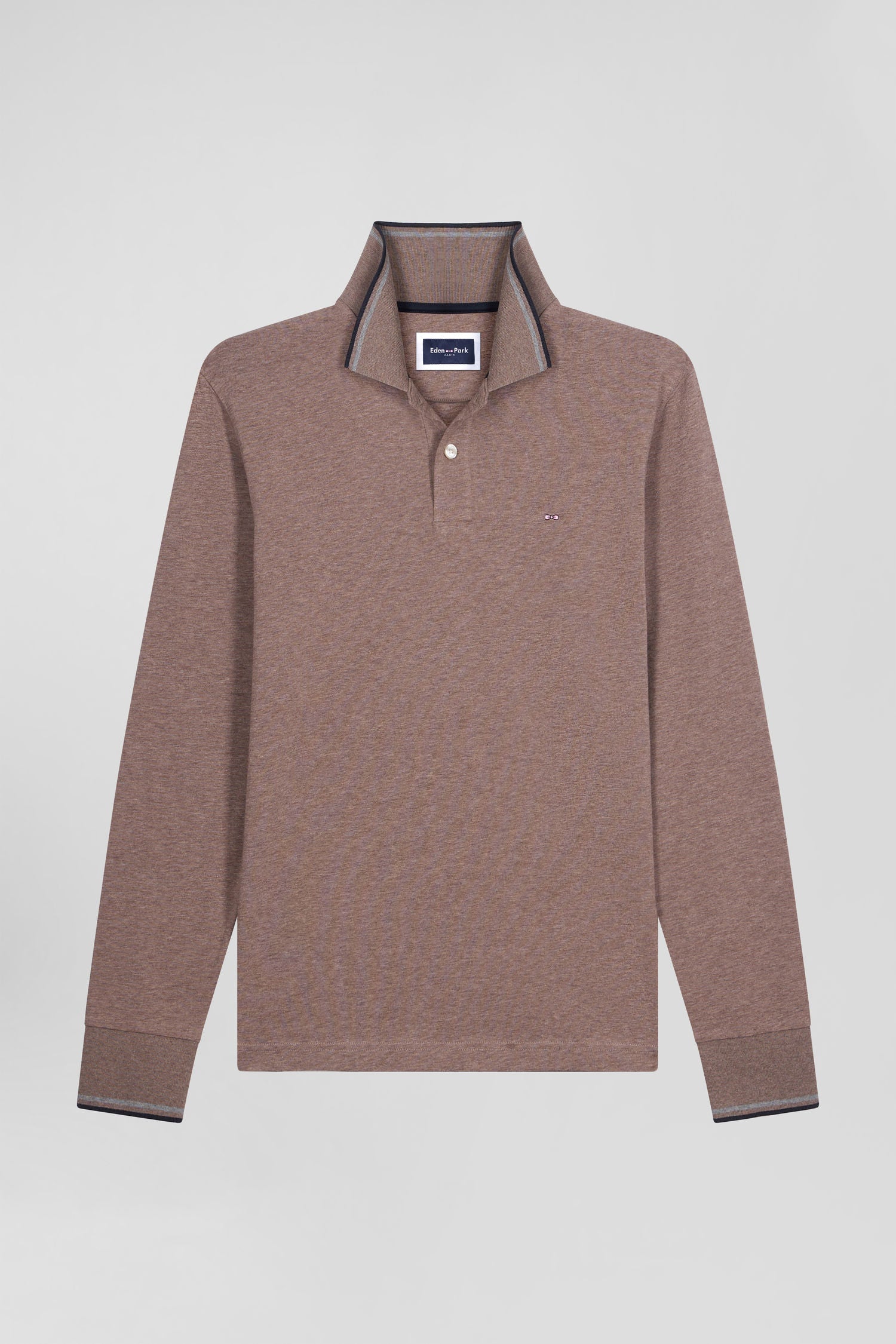 Slim brown long-sleeved stretch cotton polo shirt with striped finishes