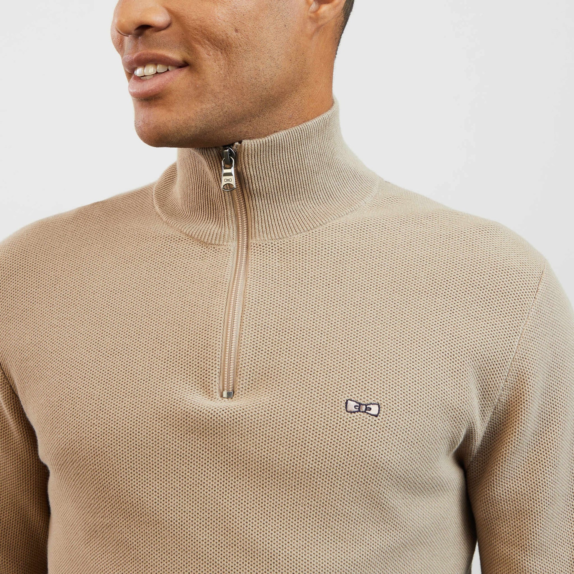 Made from soft, warm cotton knit, this sweater plays the simplicity card with its plain color, yet stands out with its trucker collar and fancy knit. Note the bow-tie logo on the chest.