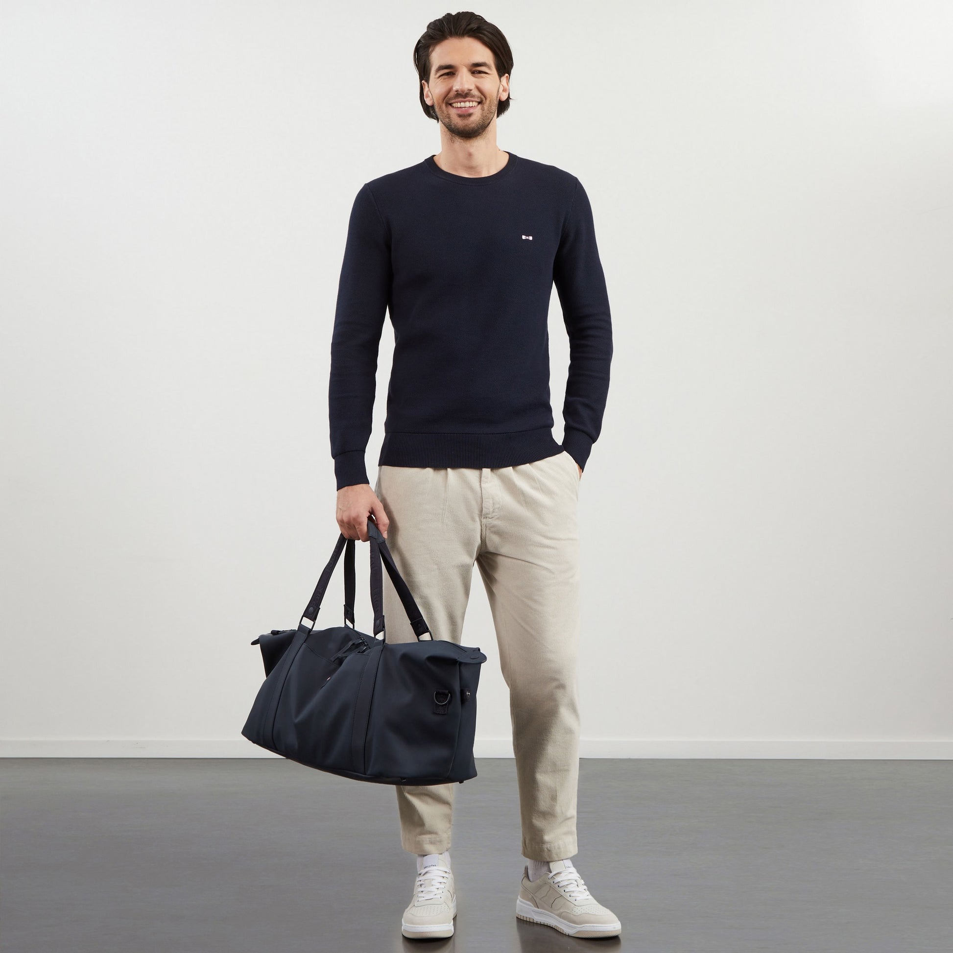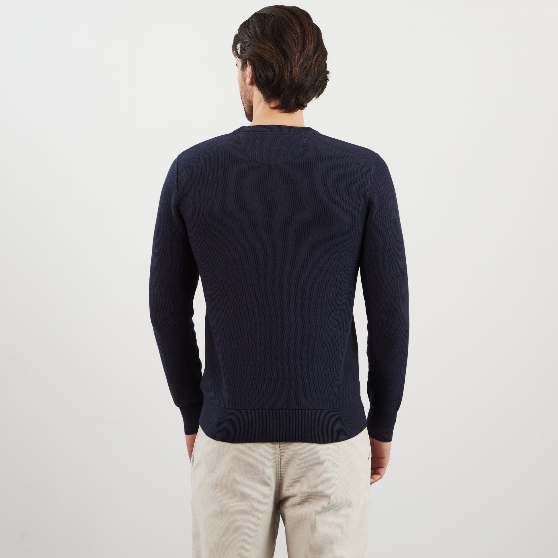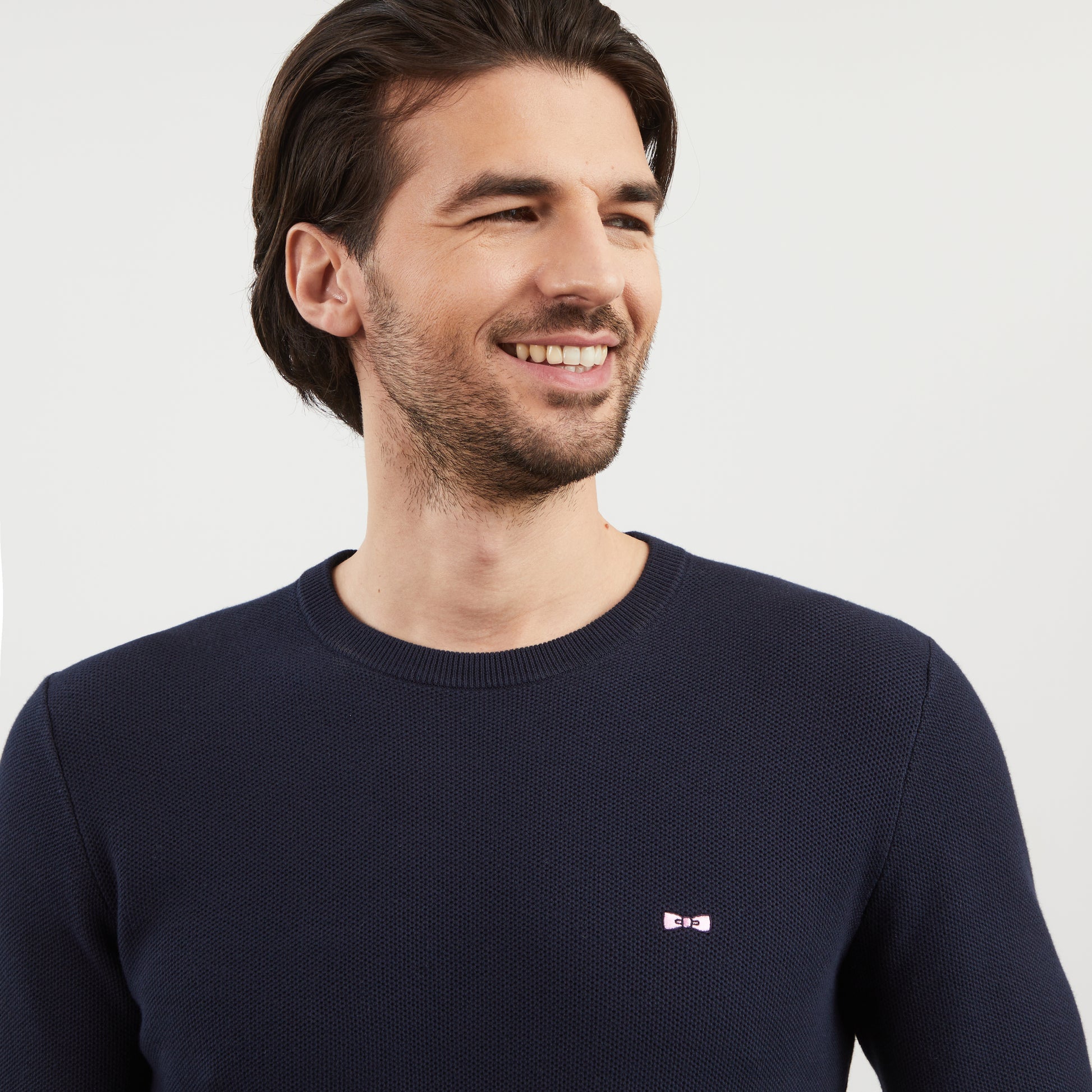 Made from soft, warm cotton knit, this sweater plays the simplicity card with its plain color, yet stands out with its pretty round collar and fancy knit. Note the bowtie logo on the chest.