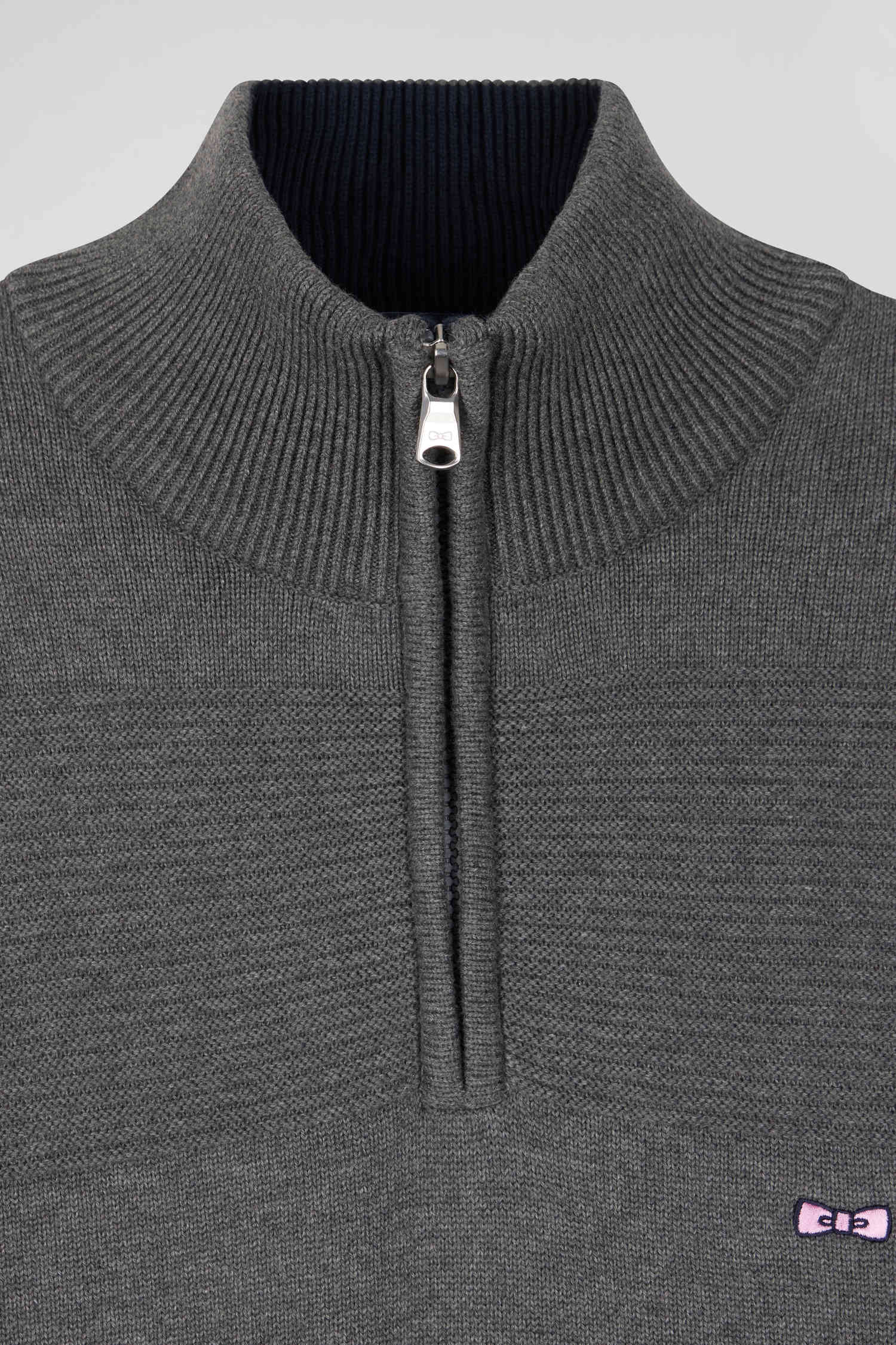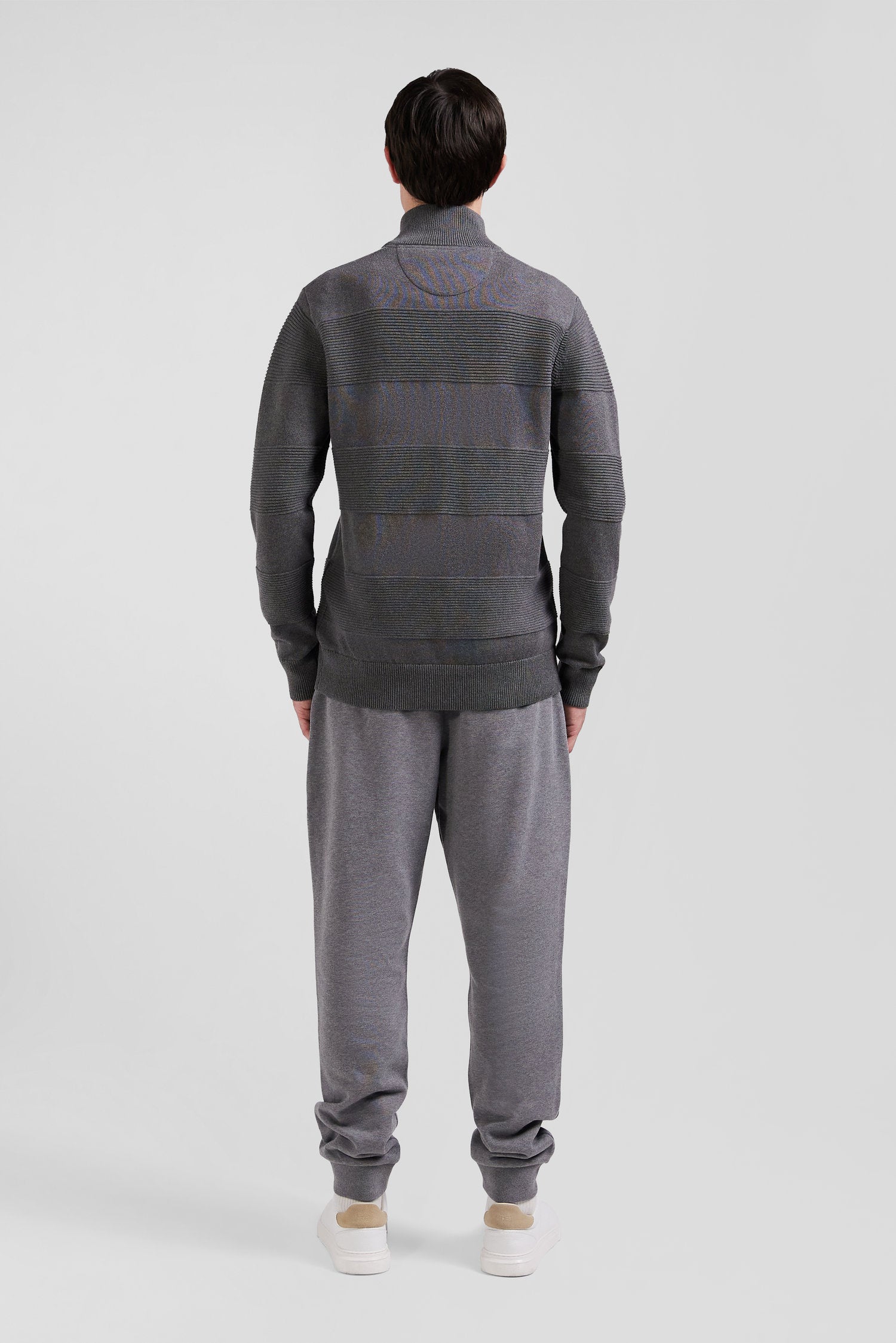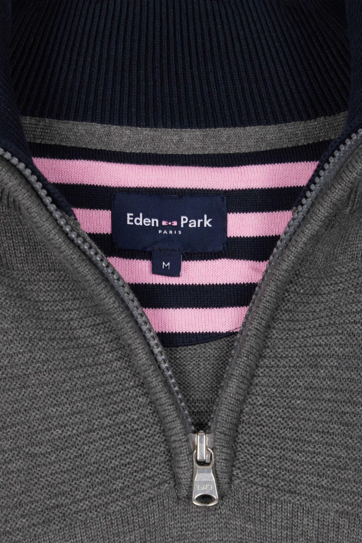 Designed in cotton for softness and comfort, this men's trucker-neck sweater features a practical zipper for a modern touch. The inner half-moon features hooped stripes, a subtle signature of Eden Park elegance, while its varied knit stitches whimsically express Eden Park savoir-faire. Wear it zipped over a t-shirt for a casual look, or half-open over a shirt for a more formal touch.