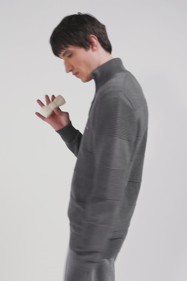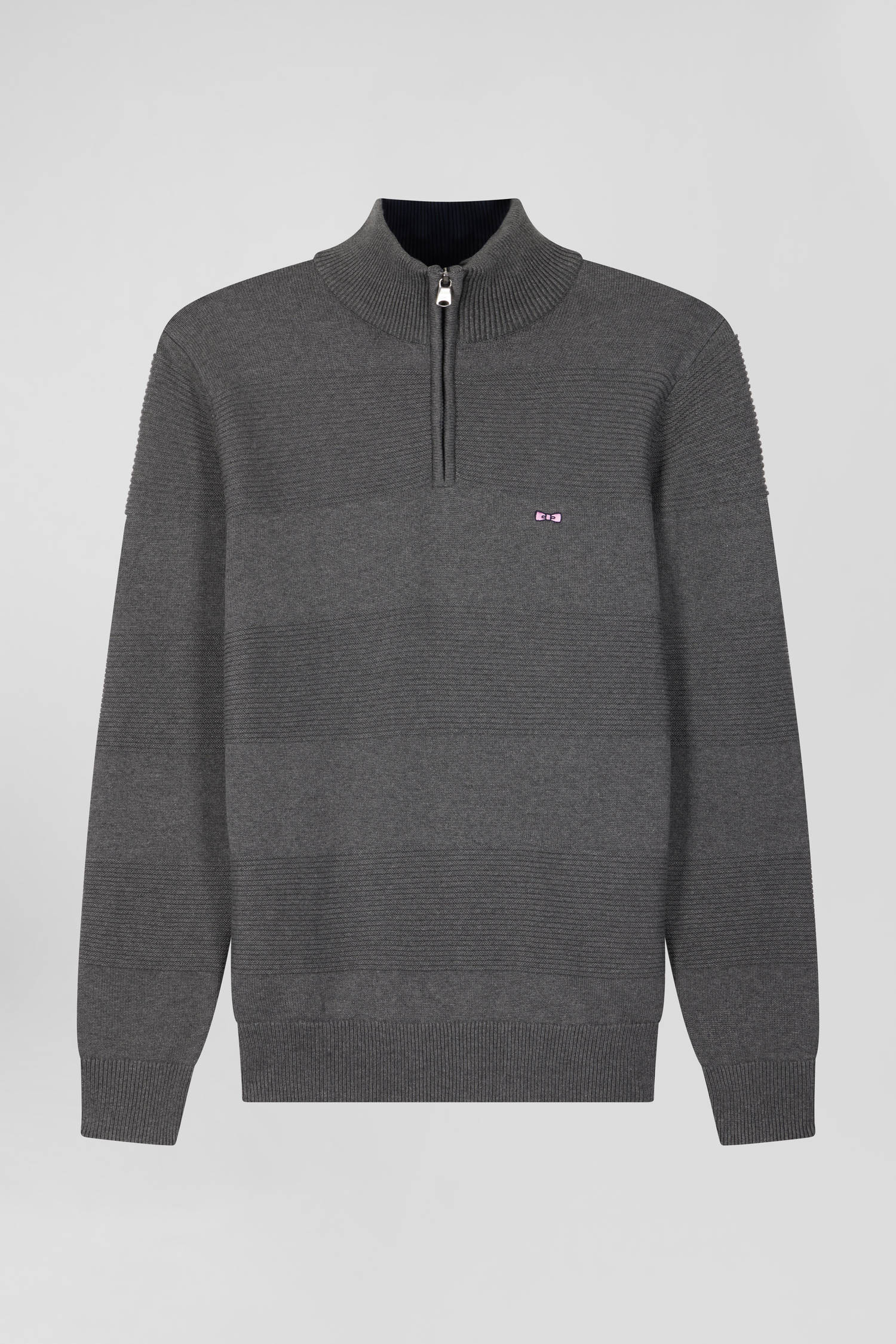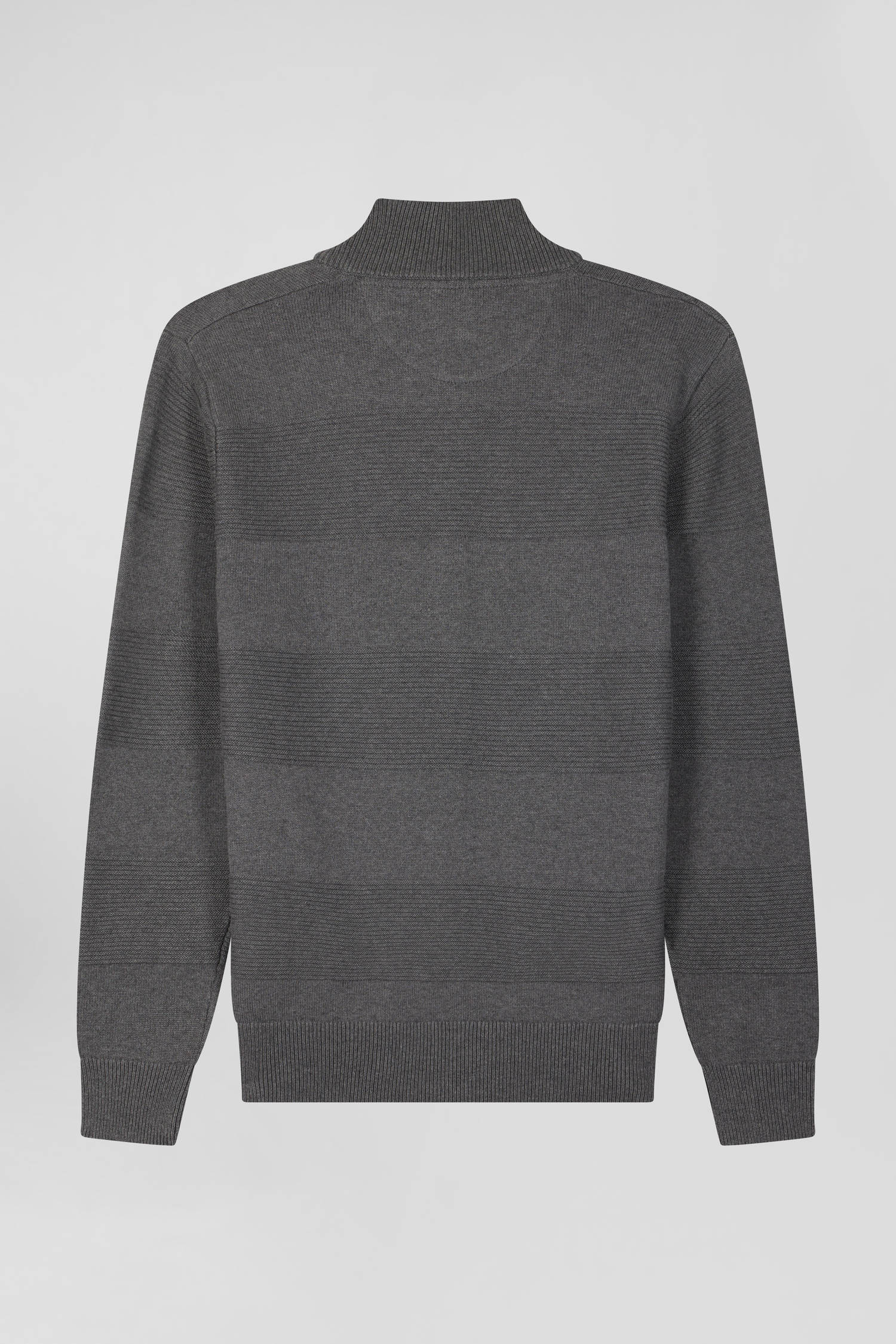 Designed in cotton for softness and comfort, this men's trucker-neck sweater features a practical zipper for a modern touch. The inner half-moon features hooped stripes, a subtle signature of Eden Park elegance, while its varied knit stitches whimsically express Eden Park savoir-faire. Wear it zipped over a t-shirt for a casual look, or half-open over a shirt for a more formal touch.