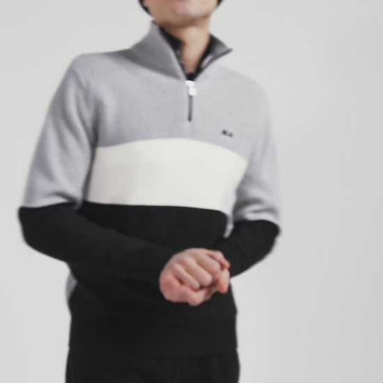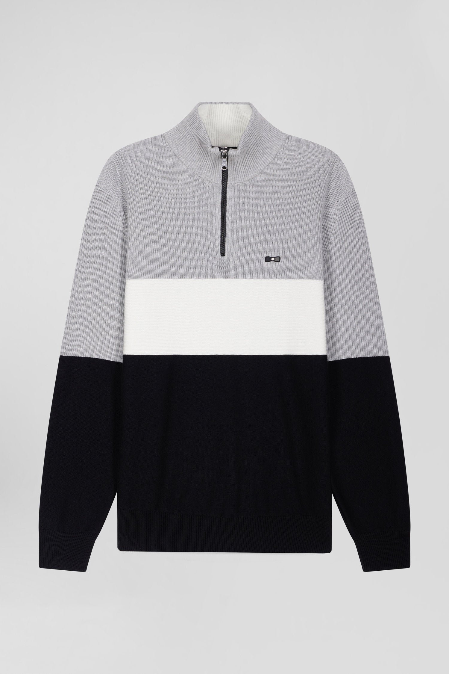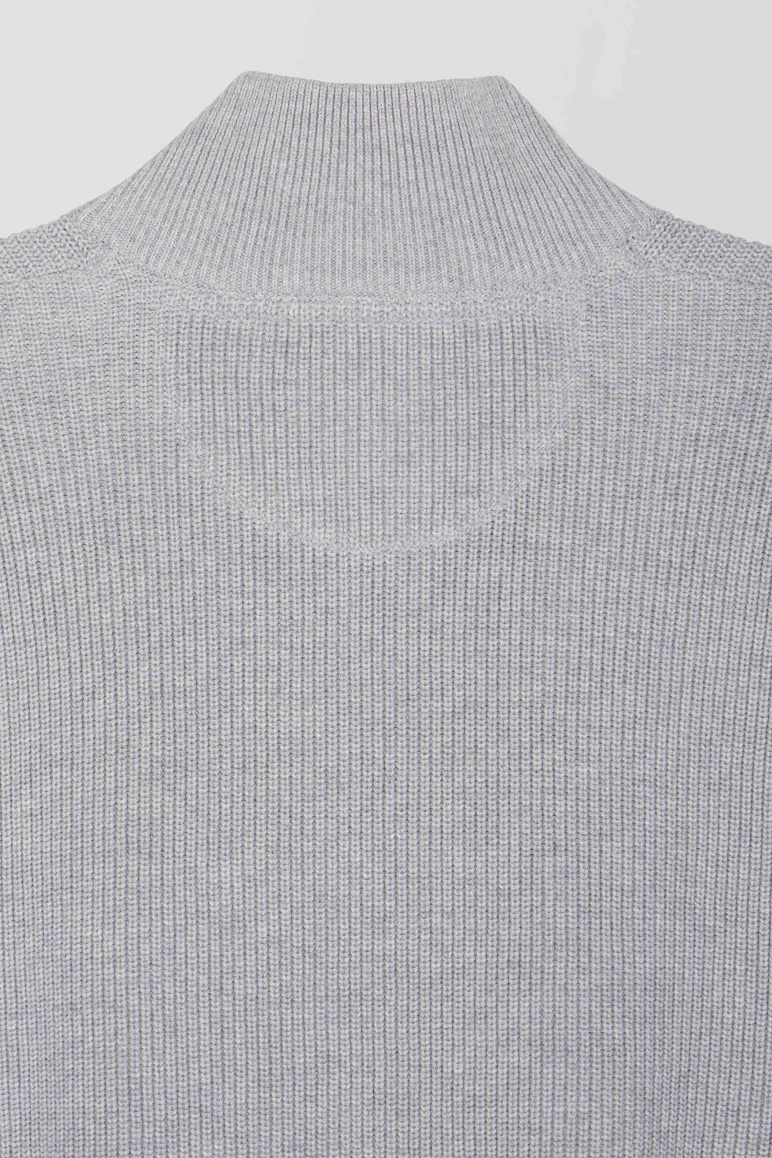 This zip-up stand-up collar sweater reveals meticulous finishes like its elegant vertical stripes on the inside, its jersey half-moon and the tricolored knit detail that enrich its interior with distinction. Alternating pearl ribbing, reverse jersey and Ottoman stitch create a subtle contrast, offering a versatile piece in three timeless shades for everyday style.