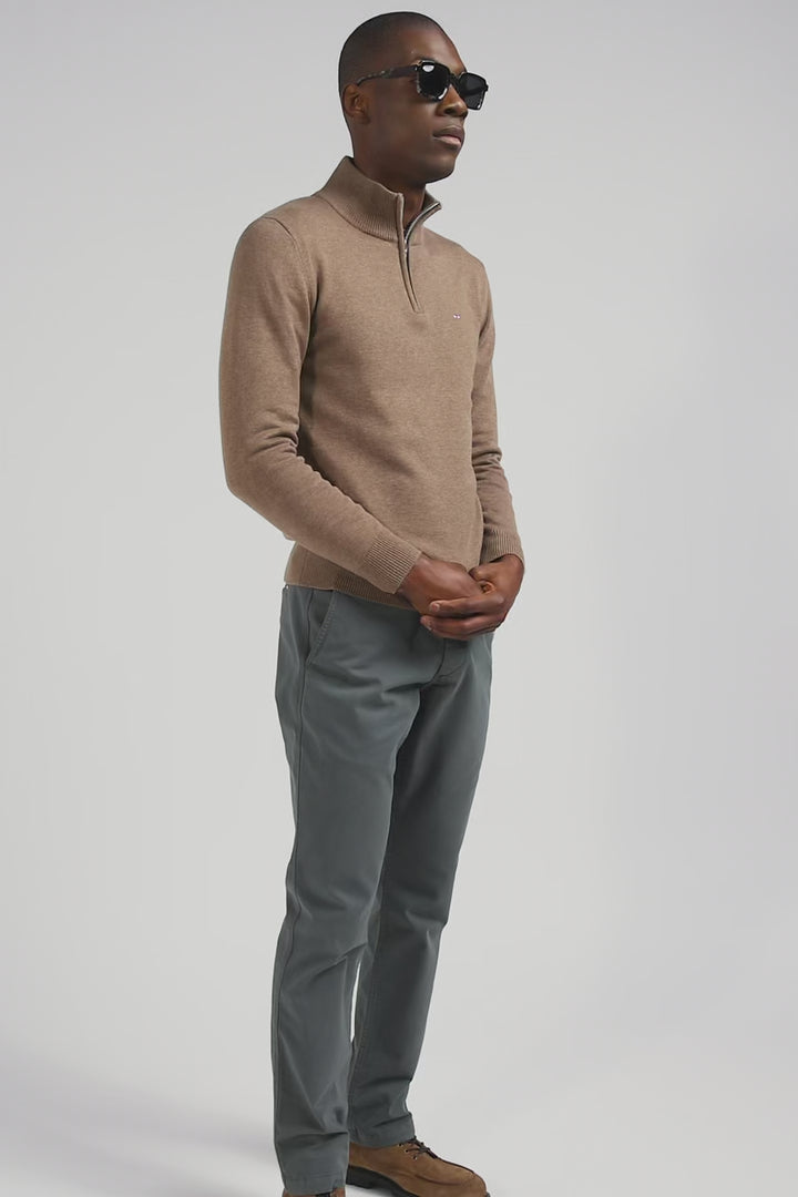 Regular brown semi-zipped wool and cotton jumper