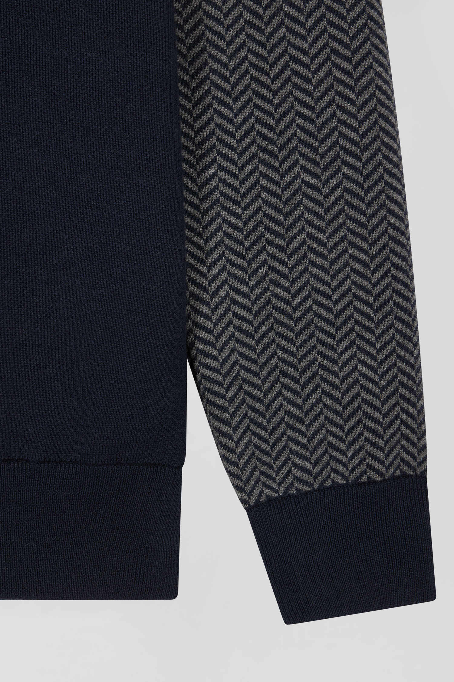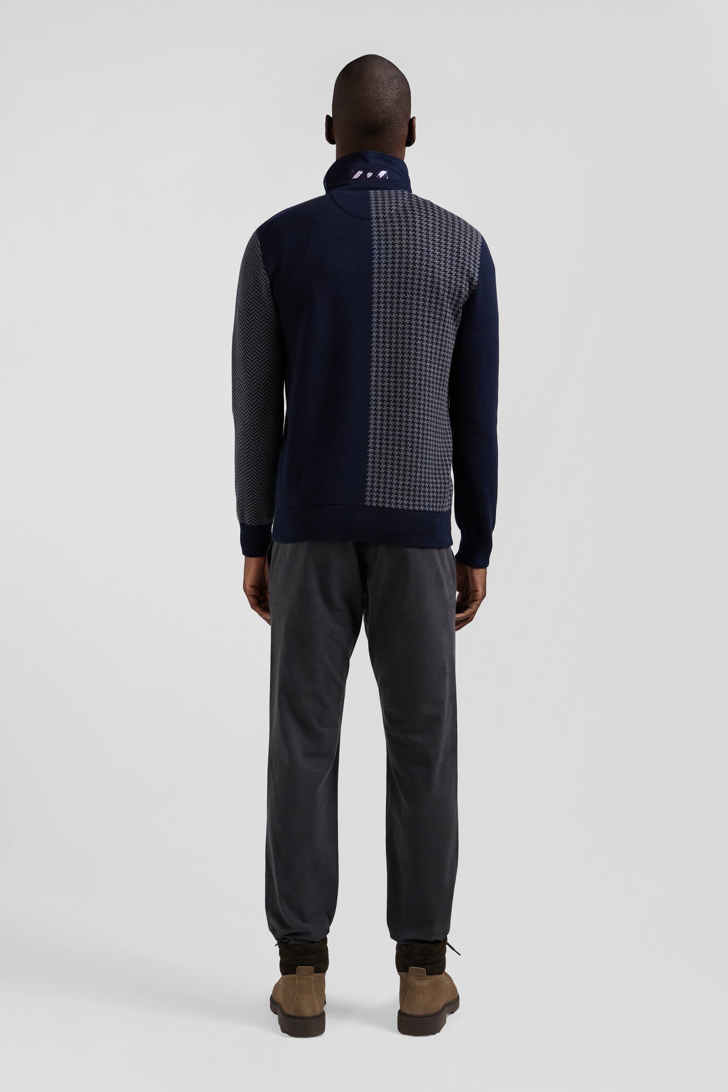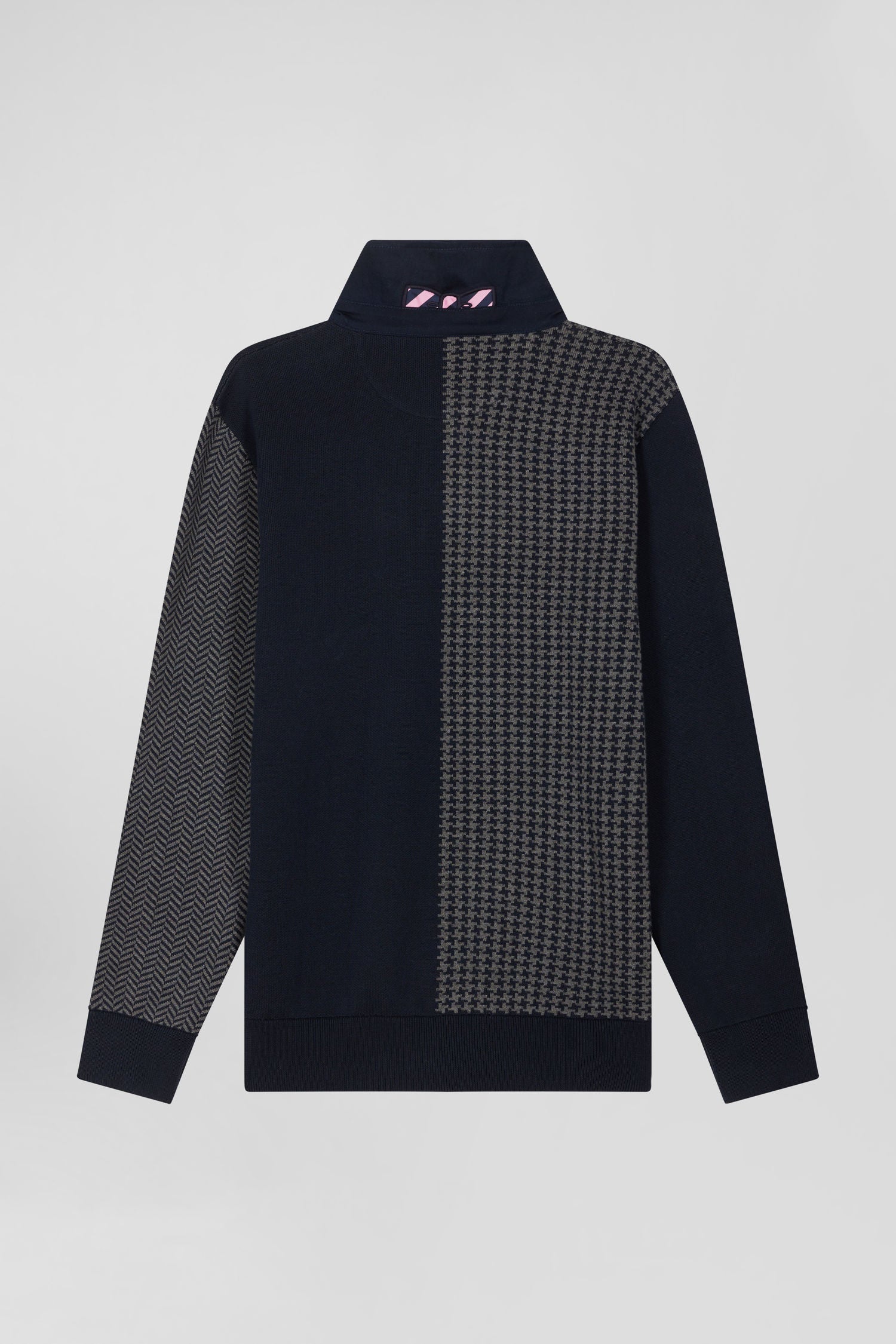 Regular navy blue cotton jumper with houndstooth jacquard and rugby shirt collar