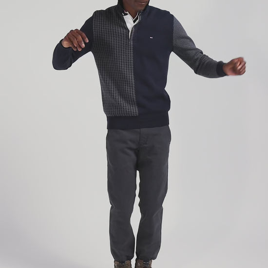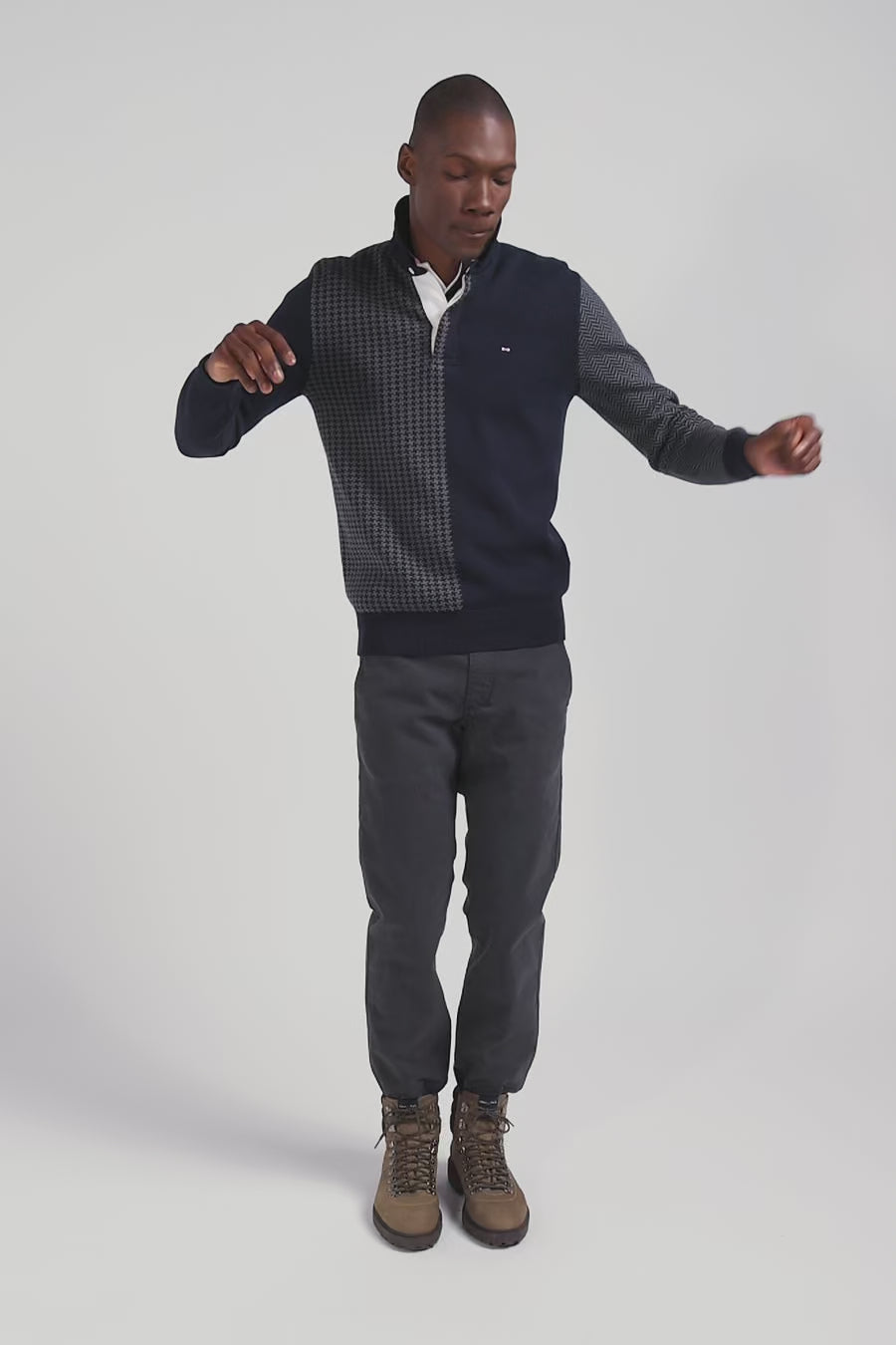 This men's cotton sweater features a twill collar for a touch of sporty elegance. The unique front panel design harmoniously combines a houndstooth pattern with a plain knit, creating a striking visual contrast. At the back, the collar is adorned with a sophisticated bowtie embroidery, topped by a striped tie fabric application providing a refined, discreet finish.