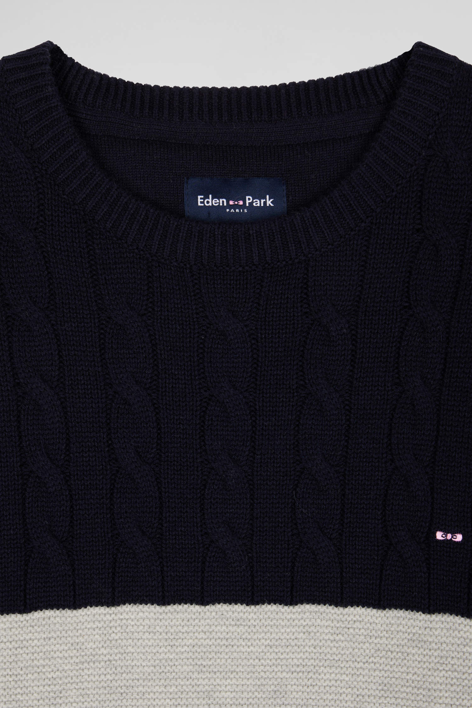 The relaxed elegance of this men's round-neck sweater comes from its design, which features alternating twists and knits in Ottoman and pique stitches, creating a play of textures that complements its skillfully combined colors. Its soft, breathable cotton makes it the perfect choice for an elegant, comfortable look all autumn/winter long.