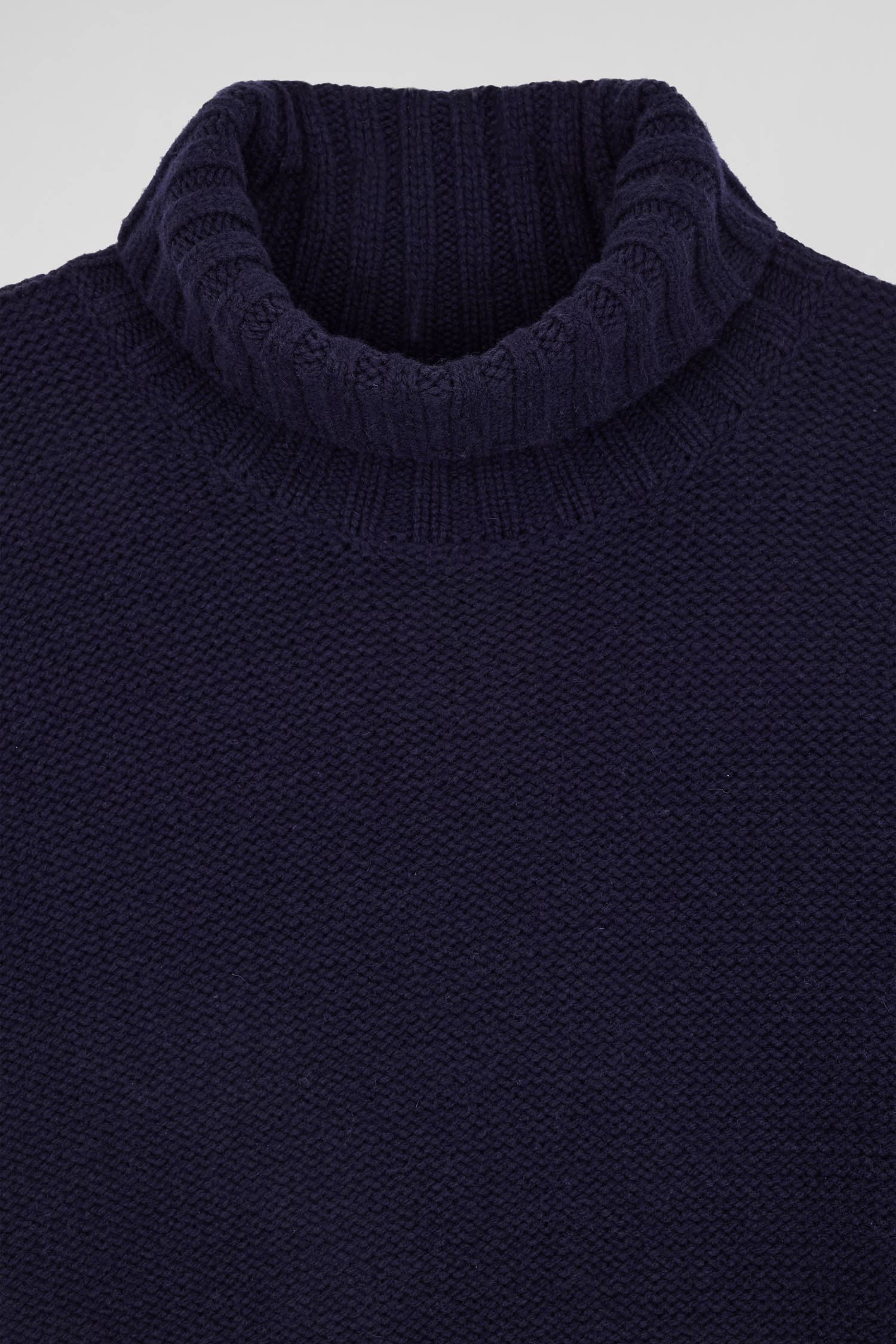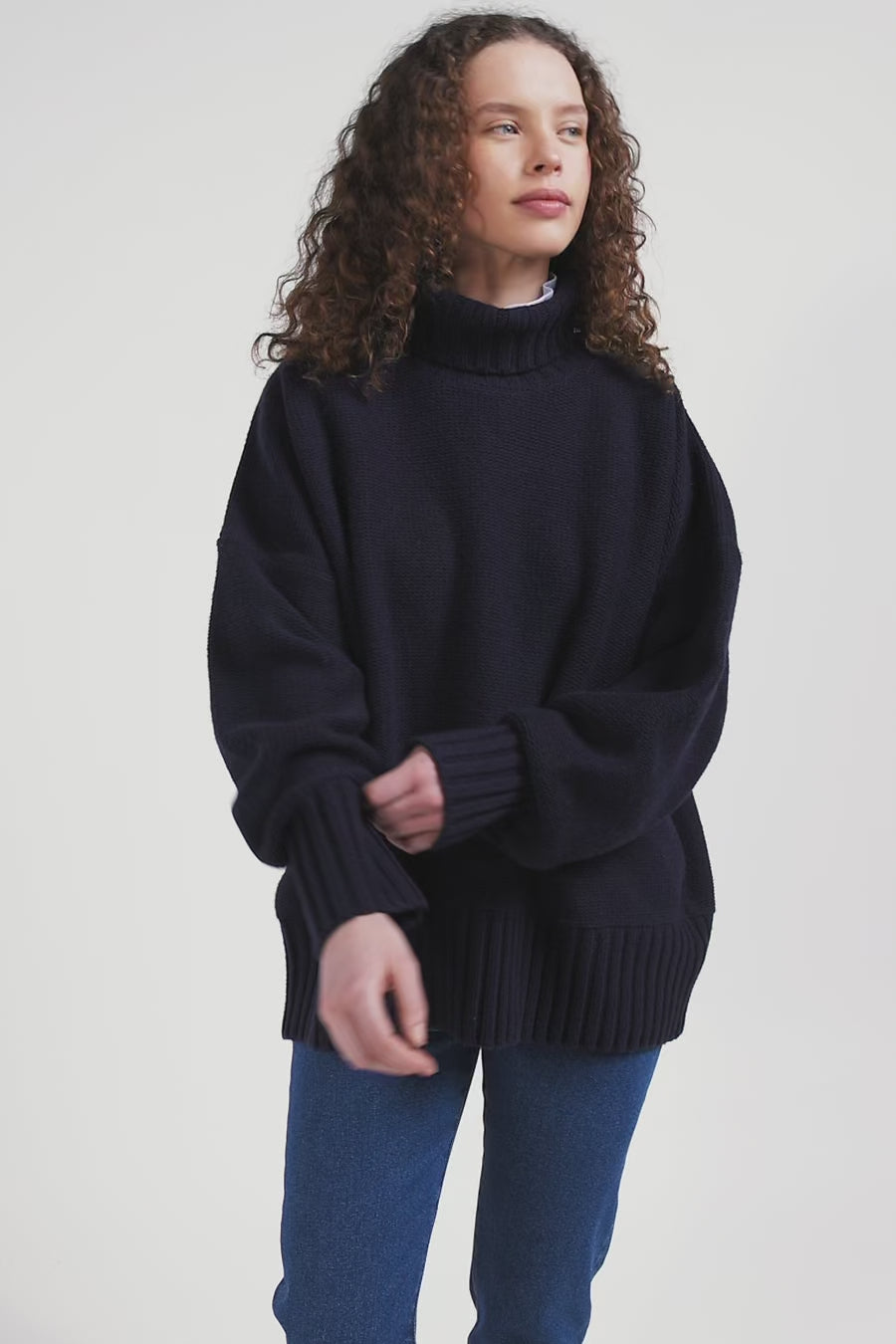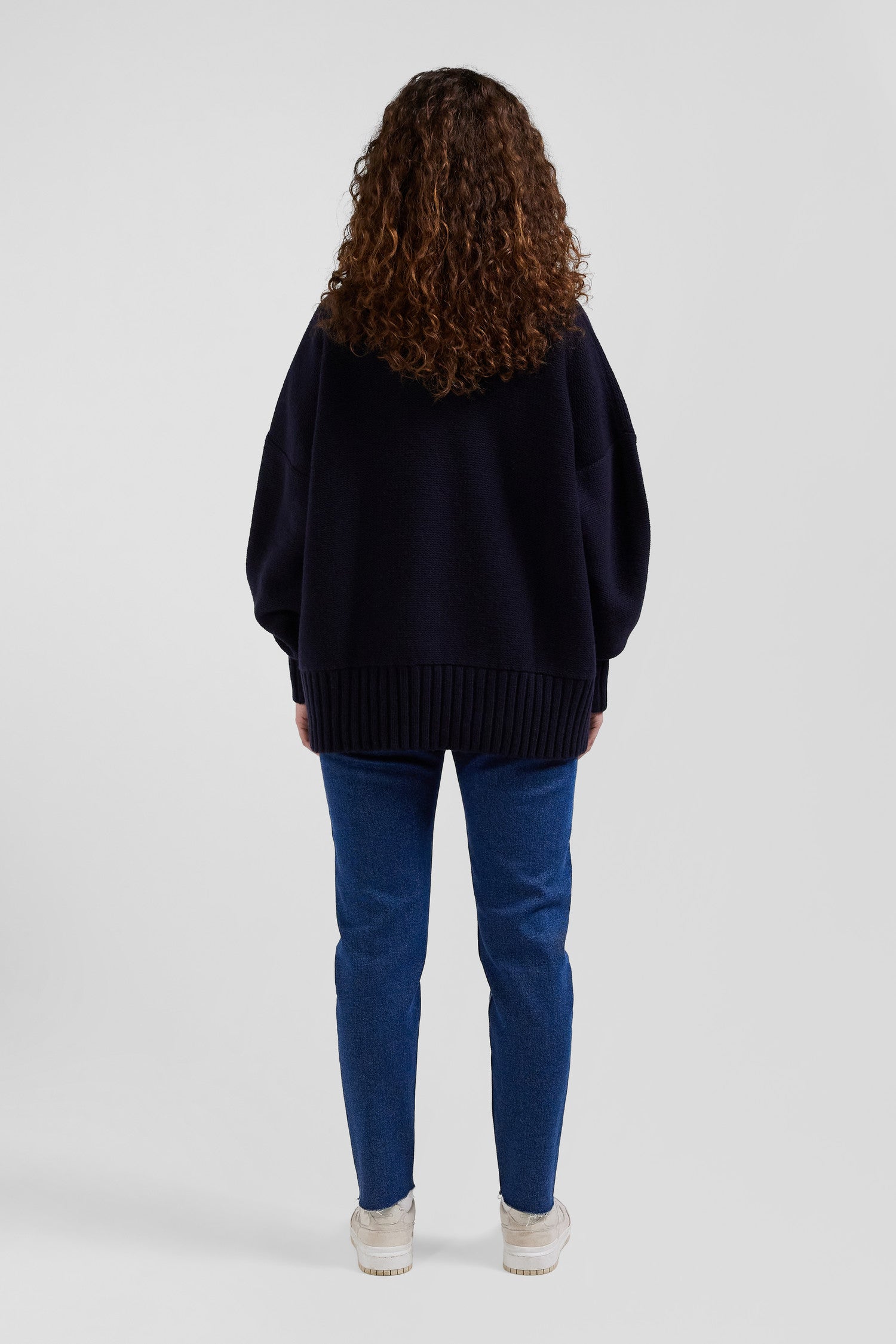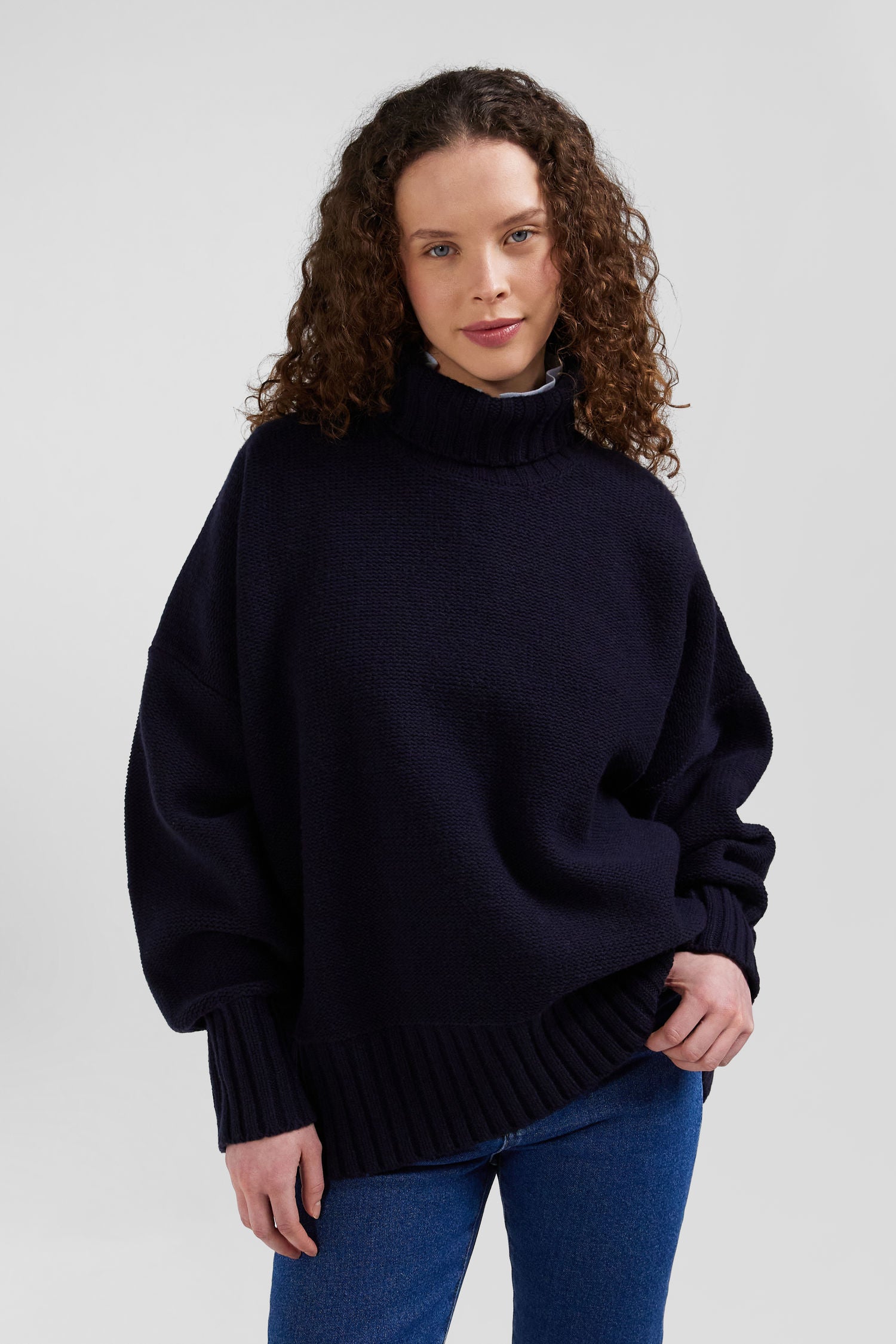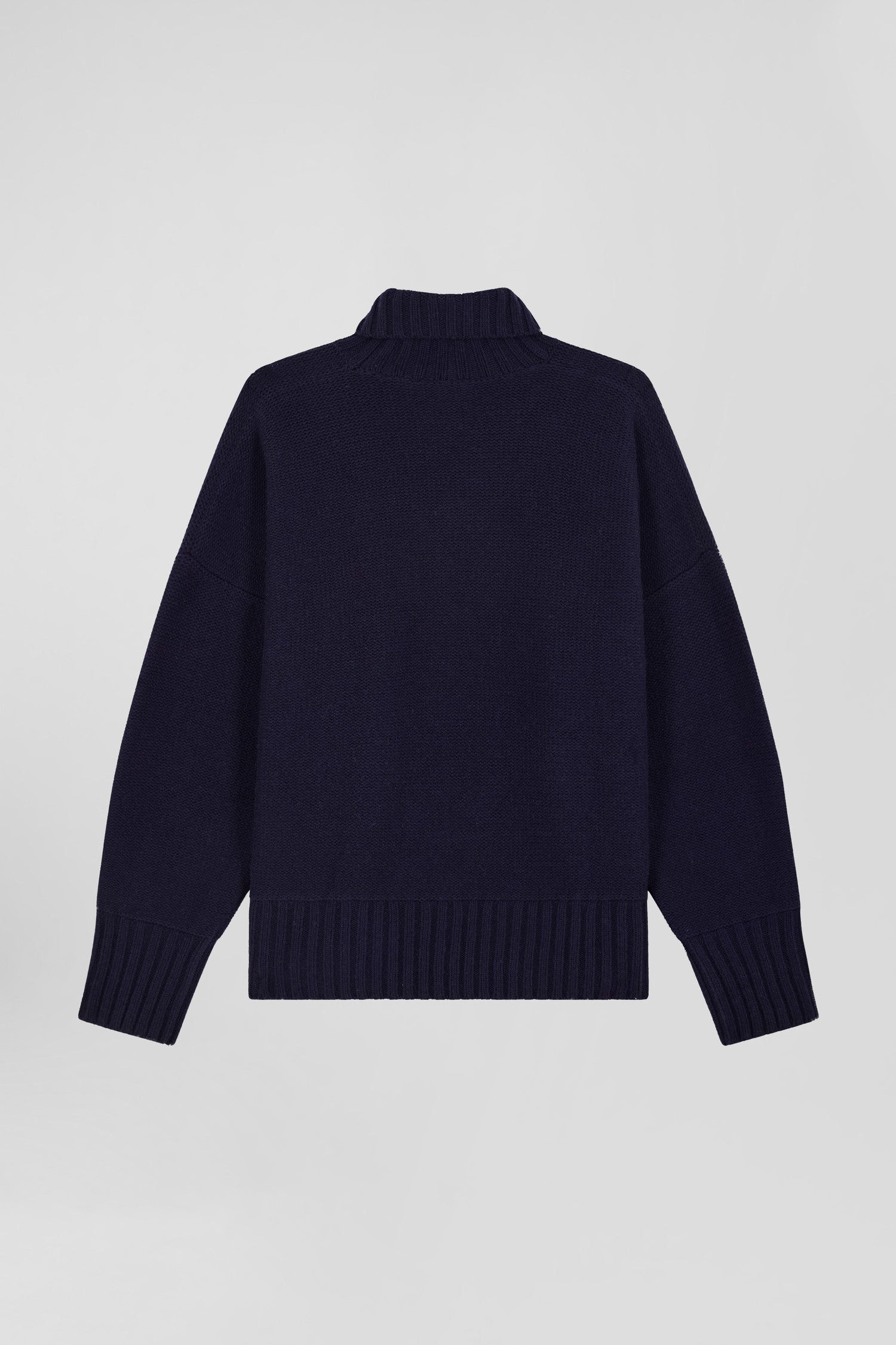 Our turtleneck sweater, knitted in reverse stockinette stitch from a blend of virgin wool and recycled polyamide, guarantees warmth and durability. Its wide sleeves tightened at the cuffs by knitted ribbing add a touch of contemporary sophistication to this timeless piece. Perfect for winter days, this feminine sweater in navy or grey in a trendy oversized cut will become a wardrobe staple worn with raw denim jeans or suit pants.