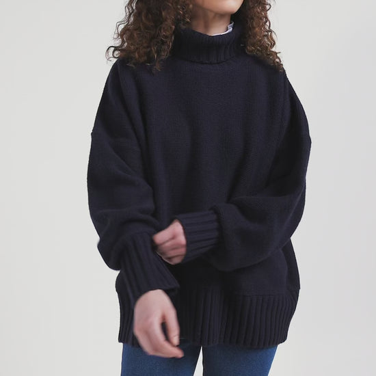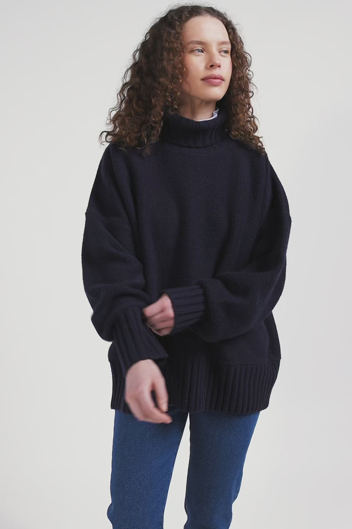 Oversize navy blue wool blend turtleneck jumper