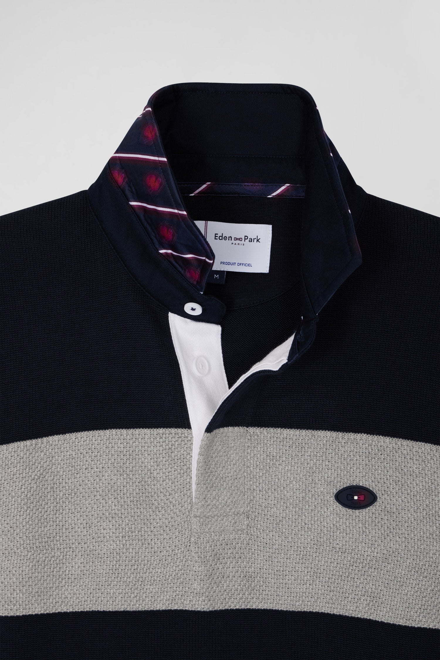 This jersey-neck sweater with hooped stripes brilliantly combines the elegance and sporting spirit of our House. The underside of the collar, adorned with a striped tie fabric, is enriched with embroidery and silicone rubber badges representing Eden Park emblems and those of the XV de France, this 100% cotton piece marries innovation and tradition.