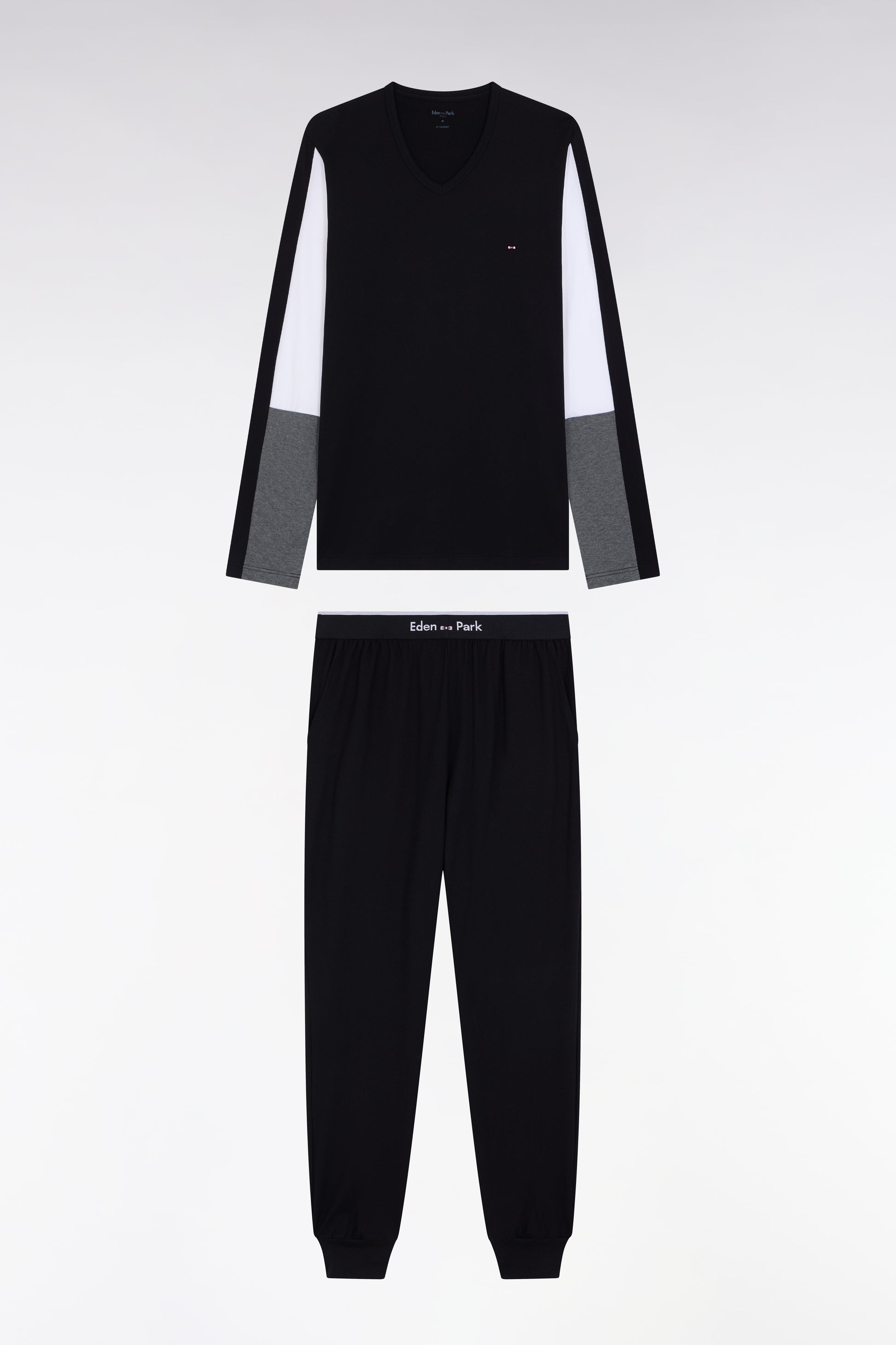 These long pyjamas feature a graphic style, with a V-neck t-shirt and colorblock cutout sleeves in the pure style of our sports-chic collections. The tricolored design is paired with plain, ankle-length pants featuring an elasticated waistband with the Eden Park logo. A modern, comfortable silhouette, ideal for relaxed evenings and weekends without compromising on style.