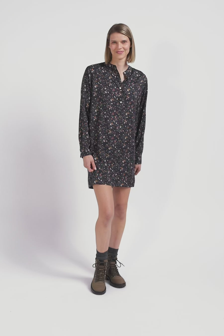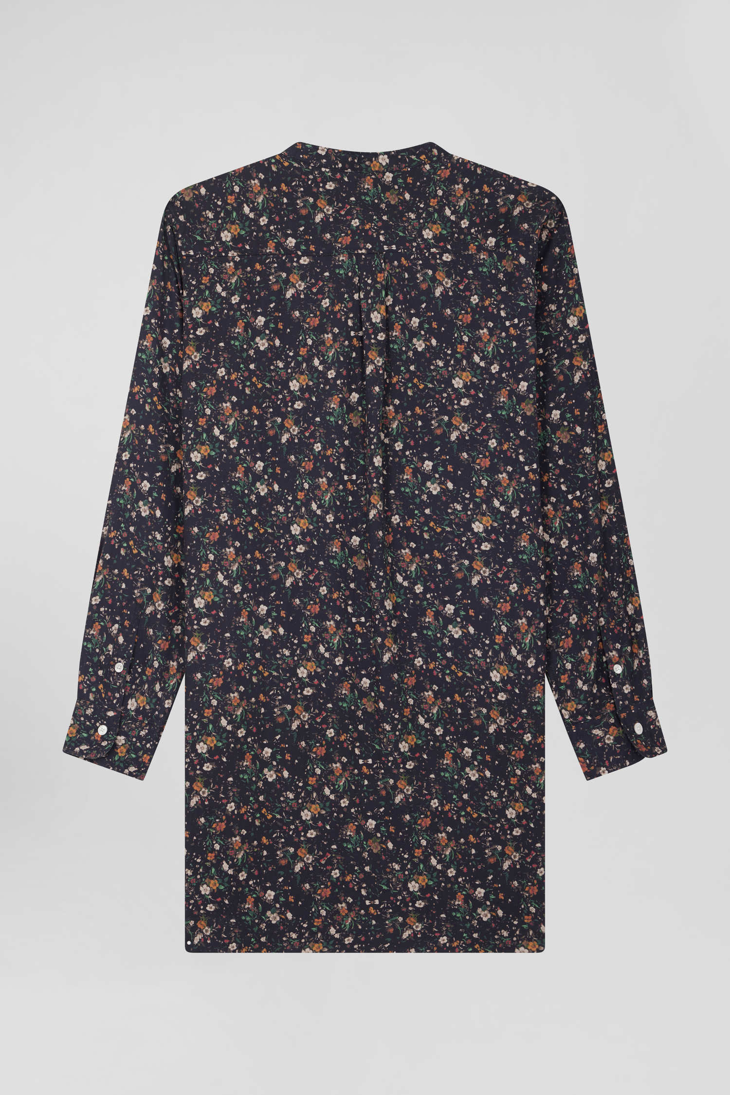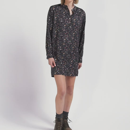 Ideal for any occasion, this black shirtdress features a delicate floral print, made exclusively for our Maison. The oval rugby buttons along the placket and on the cuffs underline the attention to detail in our collections. With its small round collar, this straight dress in soft, durable lyocell elegantly enhances the head carriage.