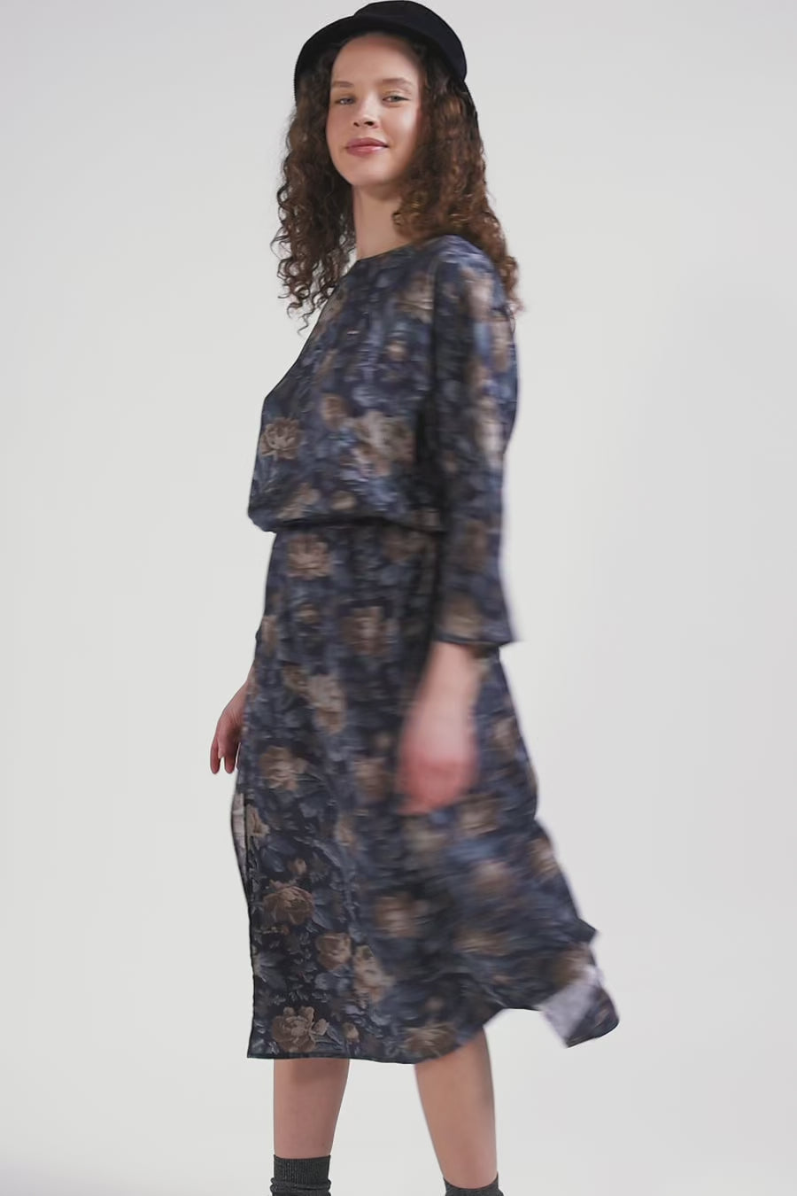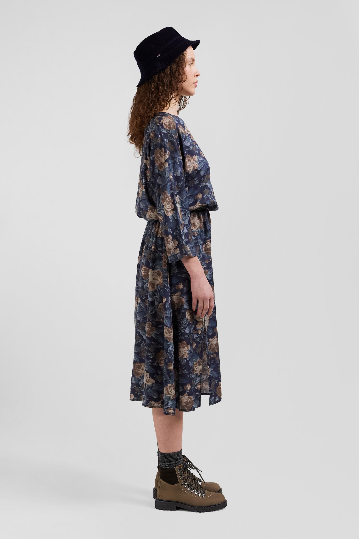 Navy blue lyocell floral dress with long sleeves