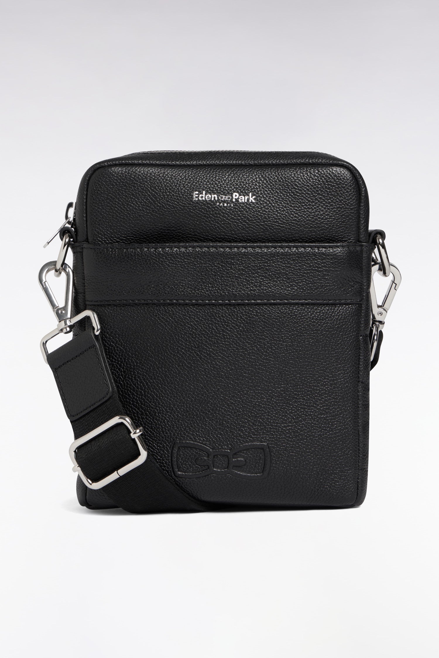 This men's bag with its minimalist design combines practicality and elegance. Ideal for urban adventures or everyday use, this masculine bag is crafted in luxurious grained leather in deep black, enlivened by its bow-tie embossing.