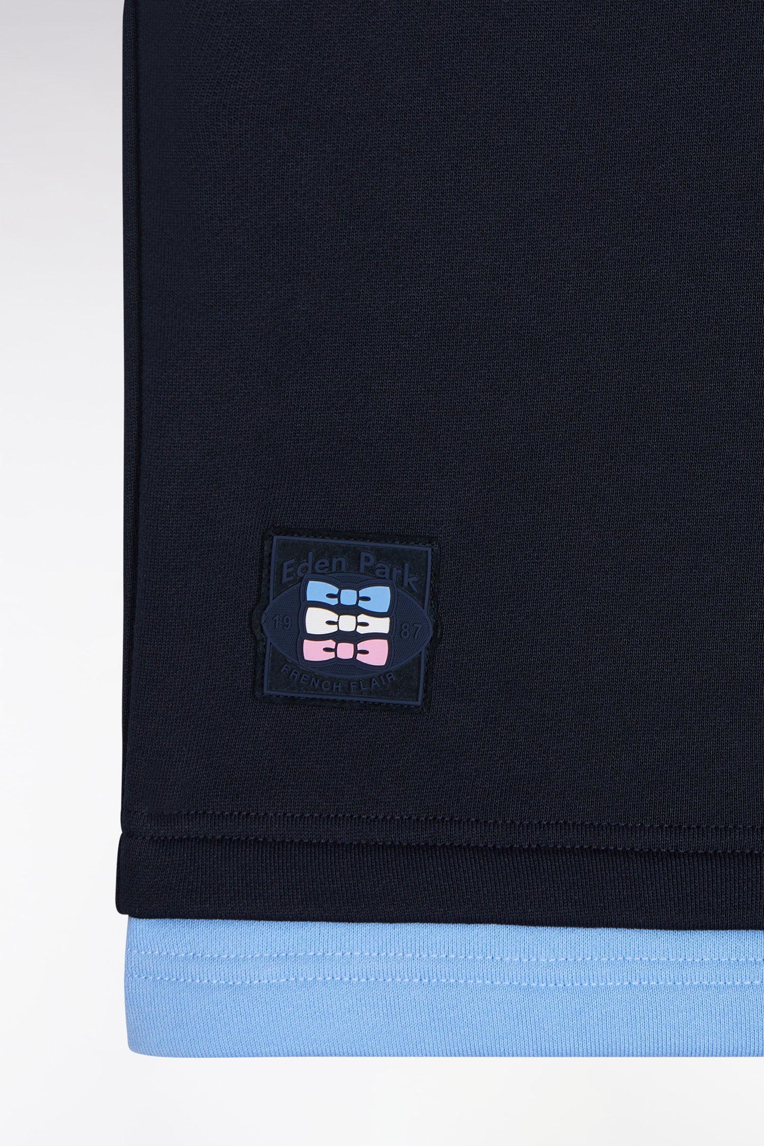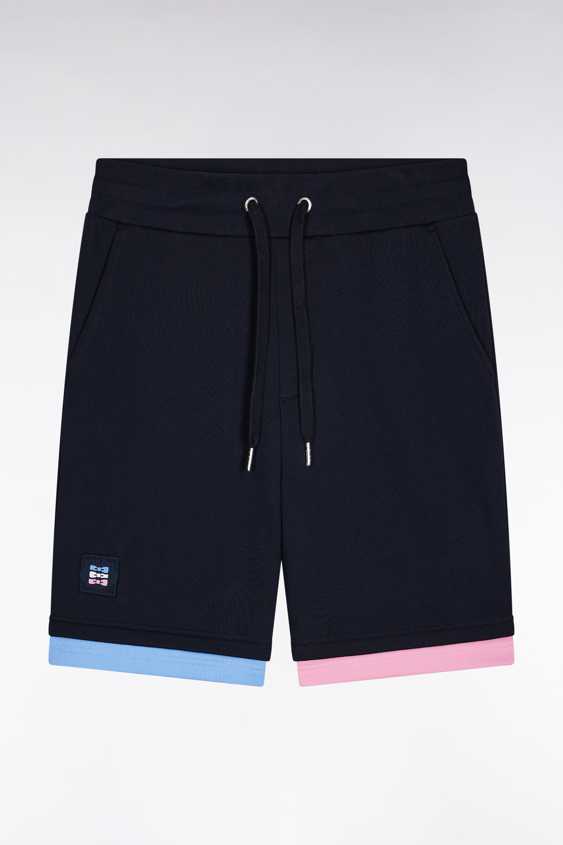 Comfort and style come together in these brushed fleece shorts, ideal for both relaxed moments and sporty-chic looks, thanks to the many pieces designed to match. The elasticated waistband with drawcord ensures a comfortable fit, while the contrasting hems at the bottom of the legs, which vary according to the color chosen, add a graphic touch. This model is available in black with gray edges, or navy with pink or sky edges, for a sporty chic look that blends rugby tradition with urban modernity.