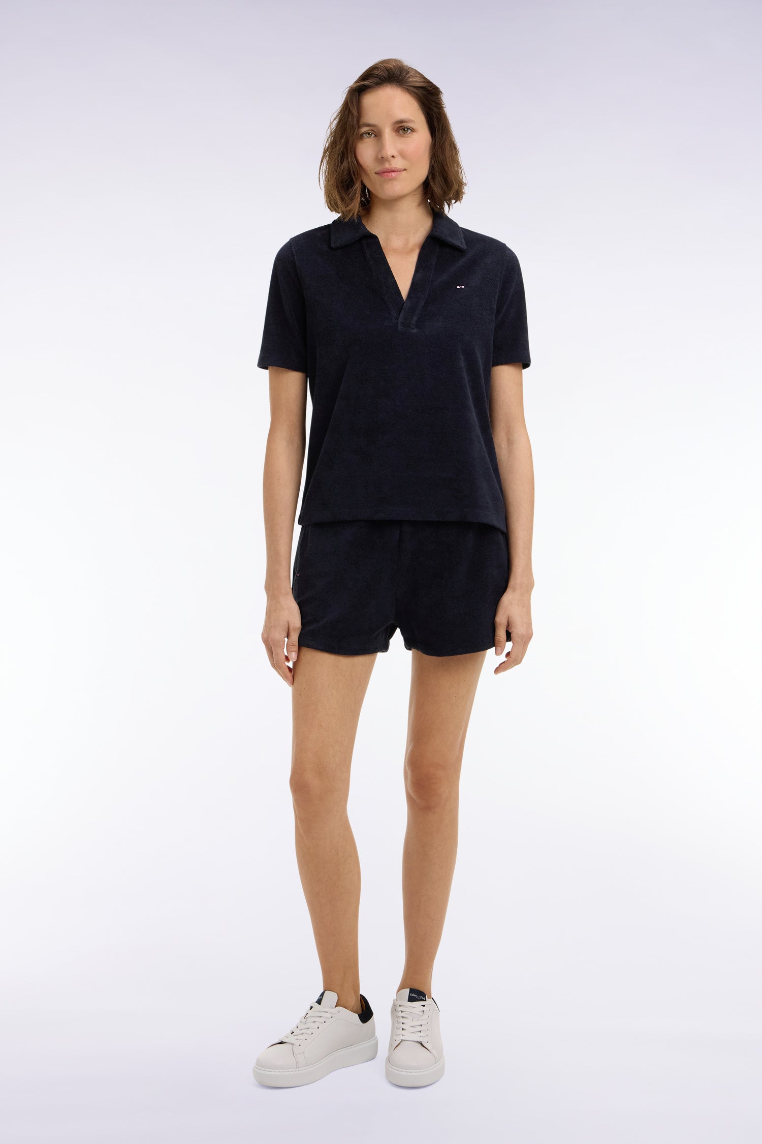 Notre petit short en éponge de coton mélangé conjugue douceur, légèreté et esprit sport chic. Sa taille élastiquée assure un confort optimal au quotidien, tandis que sa coupe regular droite permet de l’associer facilement à un T-shirt oversized, un polo ou au polo en éponge coordonné pour un total look d'influence balnéaire. Le nœud papillon brodé sur le côté de sa jambe apporte une signature discrète à ce short en éponge. Idéal pour l’été, les vacances ou les moments de détente.