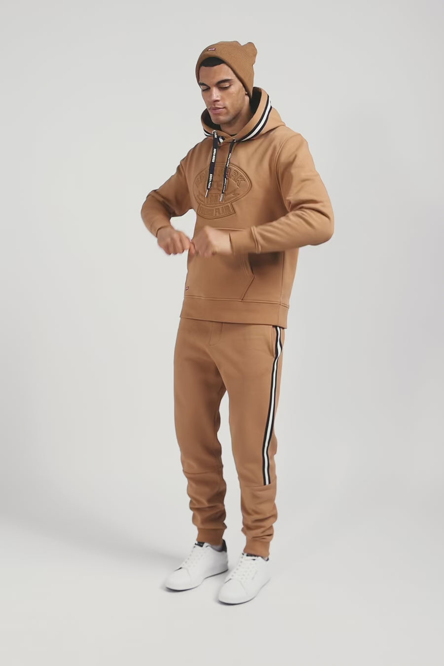 Invite softness and style into your autumn-winter wardrobe with this hooded sweatshirt in brushed fleece. It features quilted embroidery on the front and a practical kangaroo pocket. A knitted ribbon in navy and pink elegantly accentuates the hood, while the signature drawstrings with metallic finishings add a touch of distinction. Three-tone lining stripes reflect our meticulous craftsmanship, for high-end comfort and a sporty-chic look.