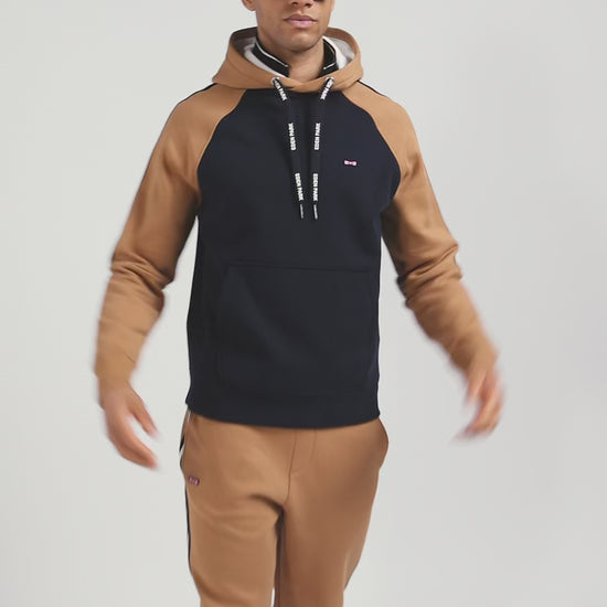 Relaxed navy blue and camel fleece hoodie with branded drawstrings