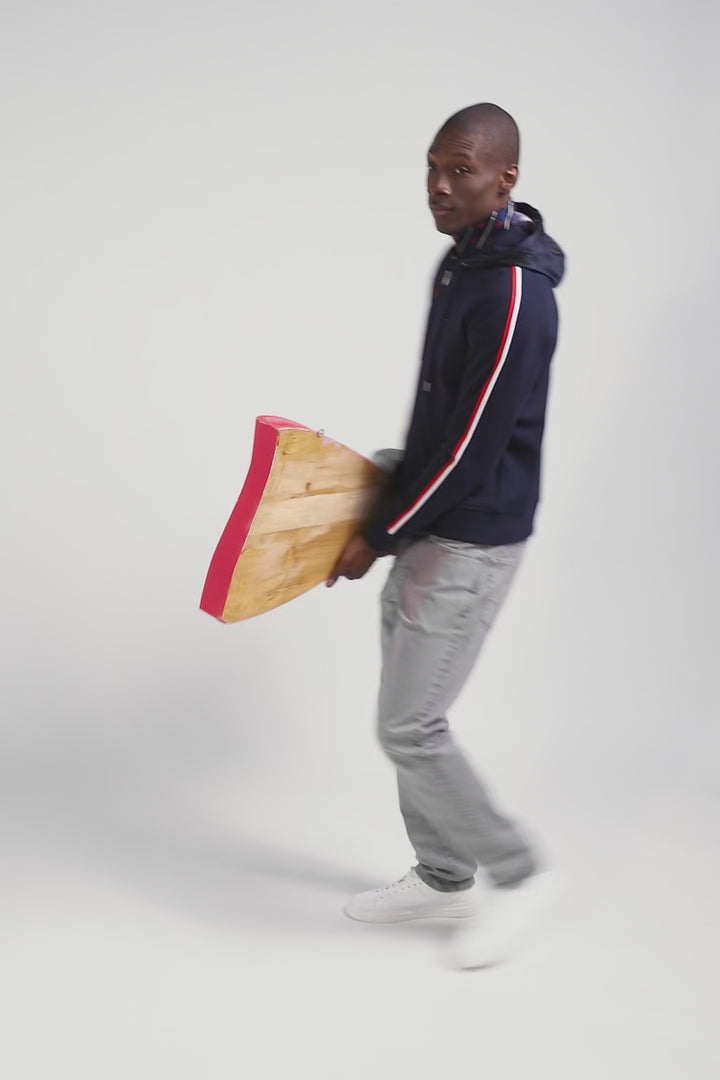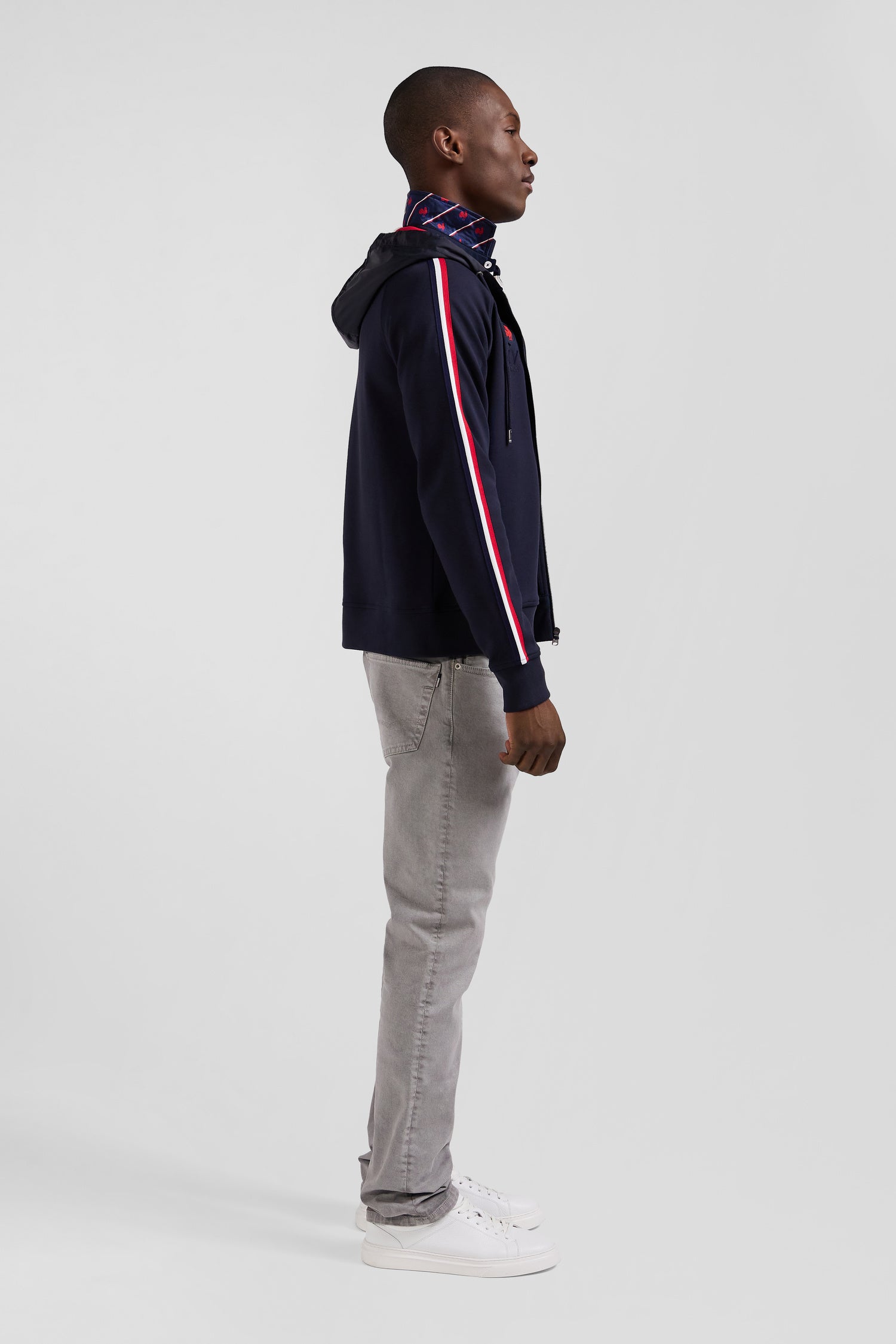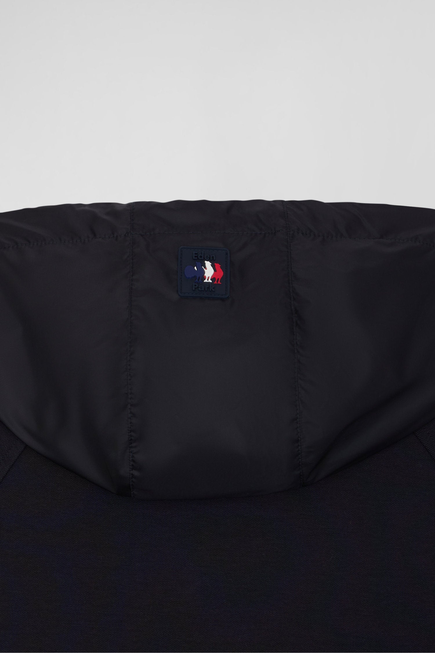 Embrace team spirit with this zip-up hoodie in the colors of Eden Park and the XV de France. In navy blue and gray, it's enhanced by our signature pink details. The inside of the hood features tricolor stripes, while fine embroidery and rubber badges sign off the look with sporty elegance.