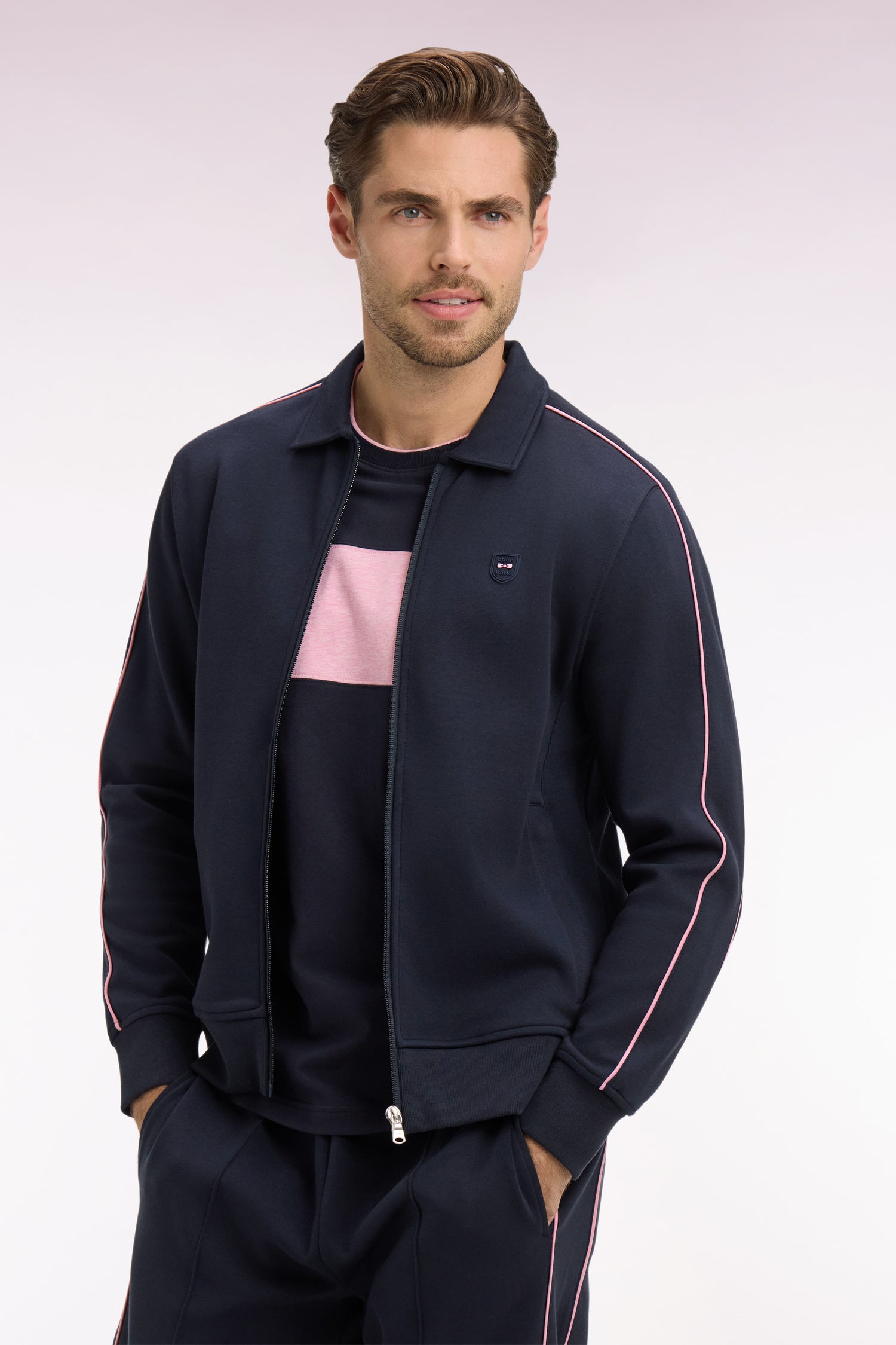 Proposé en beige, ciel ou marine, ce sweatshirt zippé arbore une coupe blouson, idéale en superposition d'un polo ou d'un T-shirt. Ses découpes de manches sont rehaussées de passepoils contrastés, un détail agrémentant également ses poches à fermeture zippée. Avec son col classique et sa coupe droite, ce sweatshirt homme réconcilie confort et élégance.