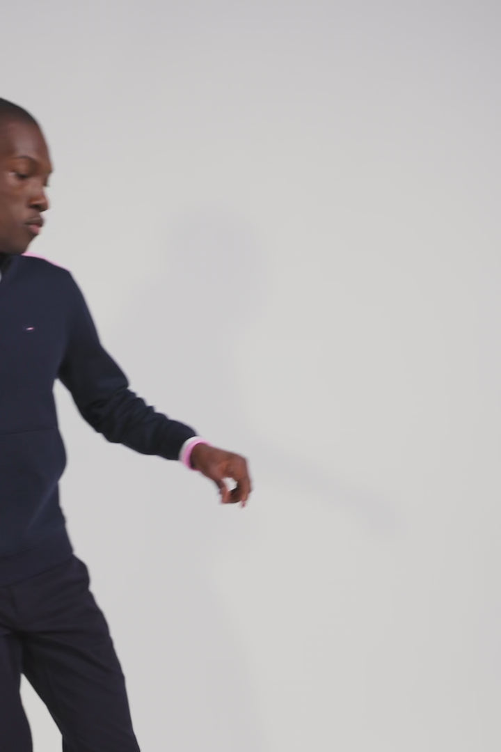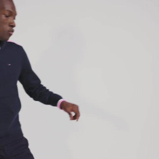 Our men's cotton sweatshirt is designed in partnership with the XV de France. This navy model features a classic rugby jersey collar, and is distinguished by embroidery of the XV de France rooster on the back. The shoulders are adorned with blue, white and pink tricolor stripes. Perfect for rugby and fashion fans alike, this kangaroo pocket sweatshirt is a must-have for supporting your favorite team in style.