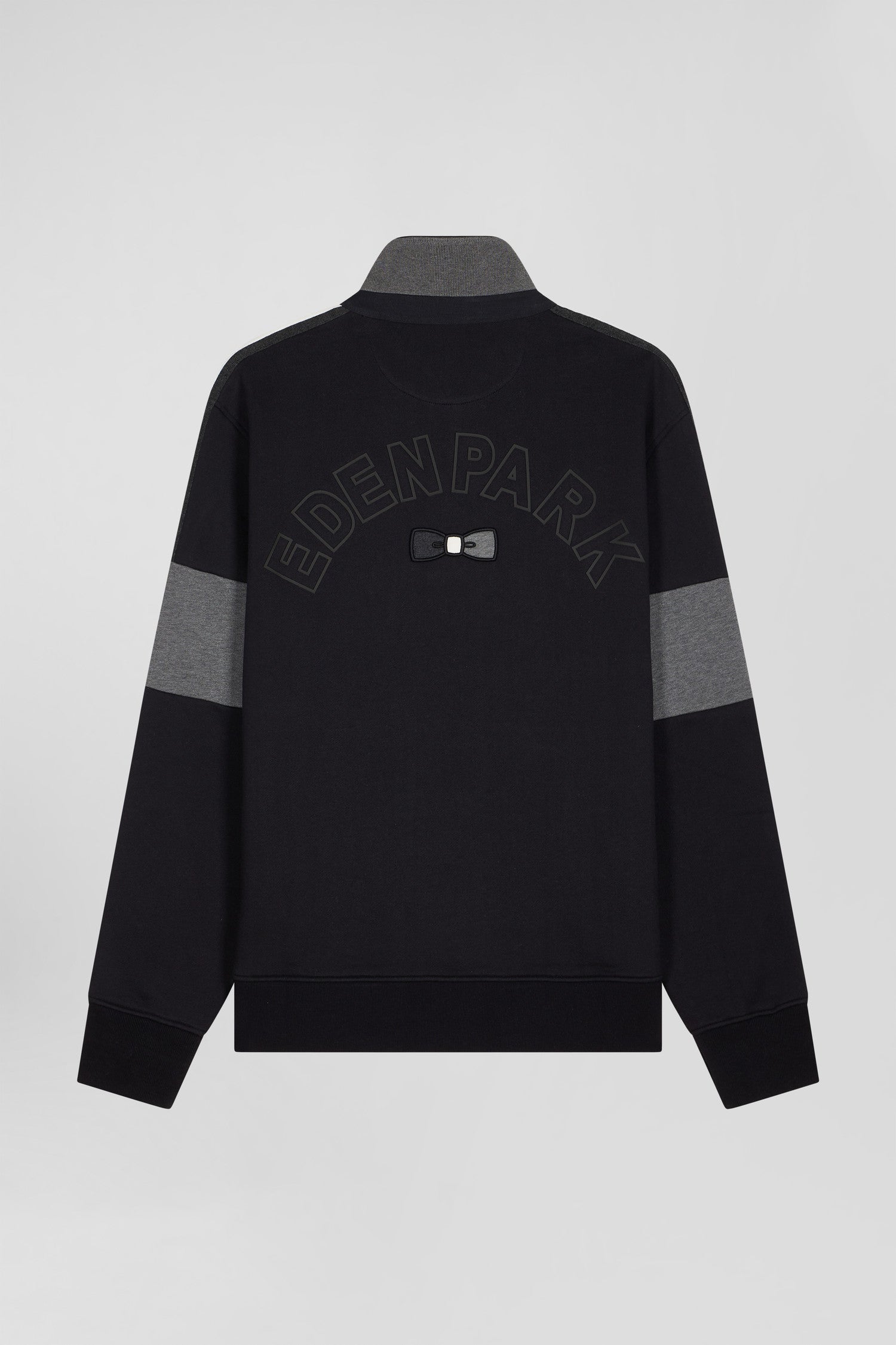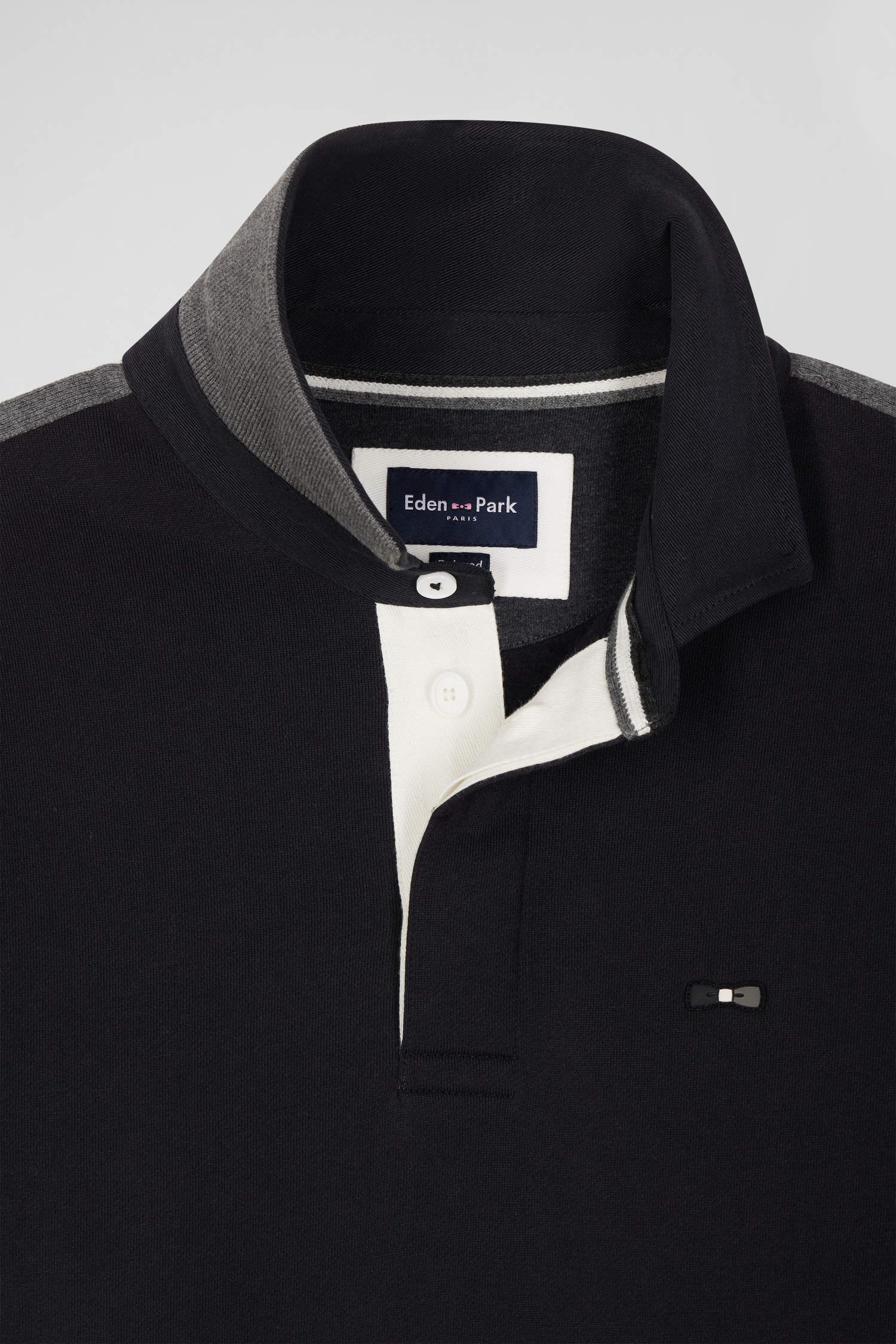 Our men's sweatshirt, available in black or burgundy, is designed in brushed fleece for optimum comfort. Cuff cutouts on the sleeves and a rugby jersey collar in twill, lined with knitted ribbing, add a sporty touch. A tricolored knitted ribbon runs along the shoulders, while the back proudly displays EDEN PARK lettering and a tricolored embroidered bow, topped with a fabric applique.