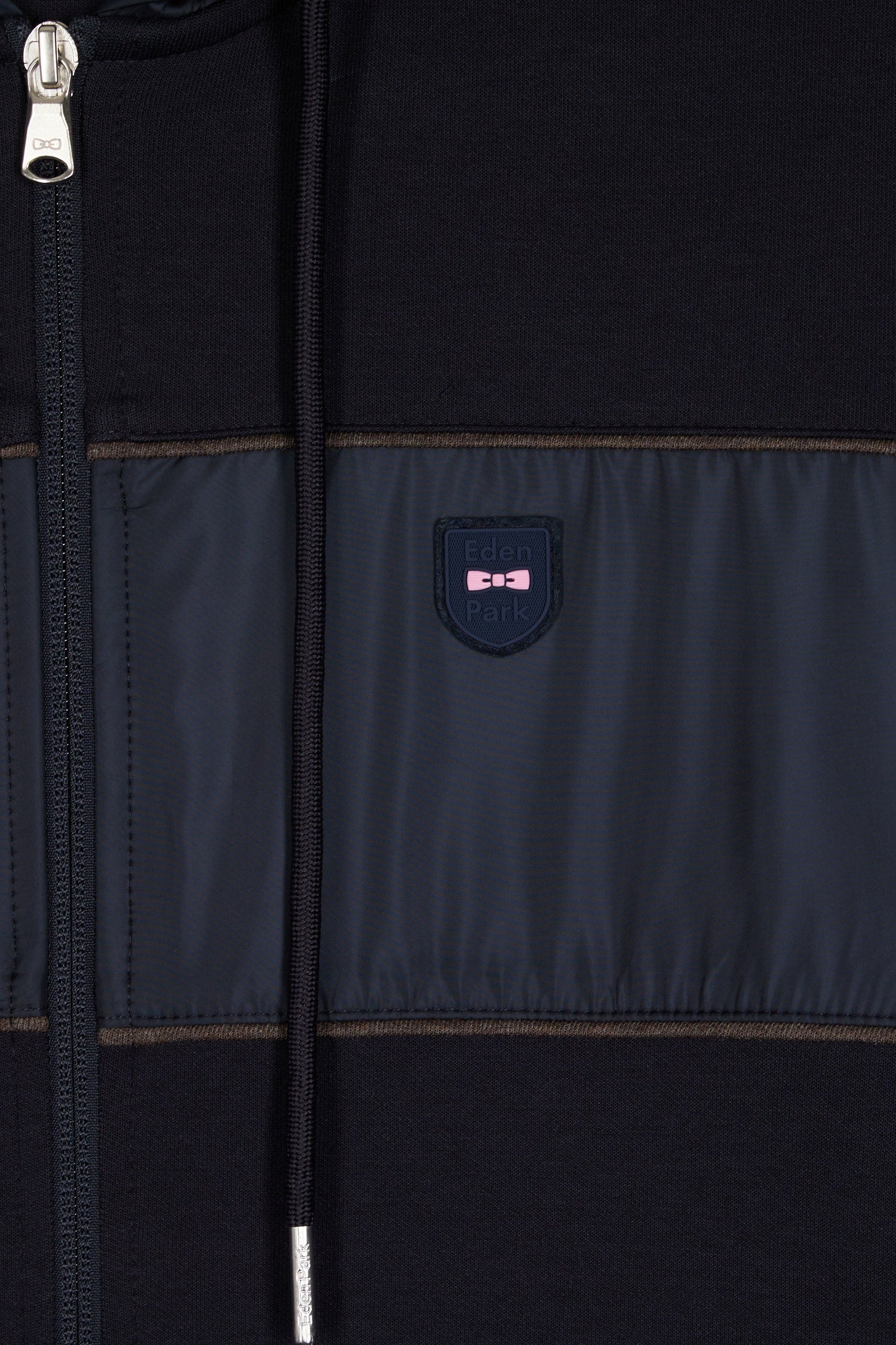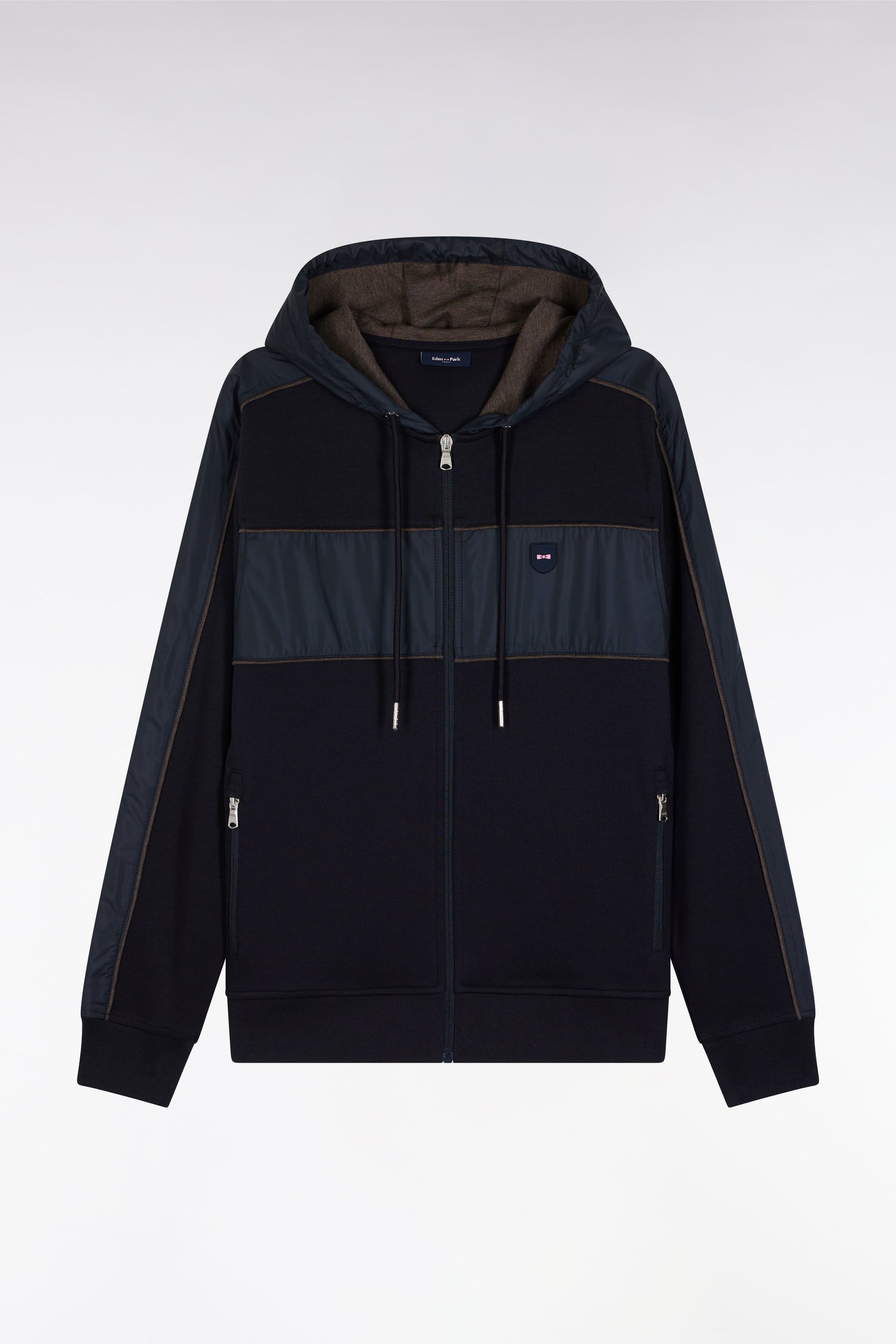 Zip-up hooded sweatshirt in navy and beige fleece and nylon