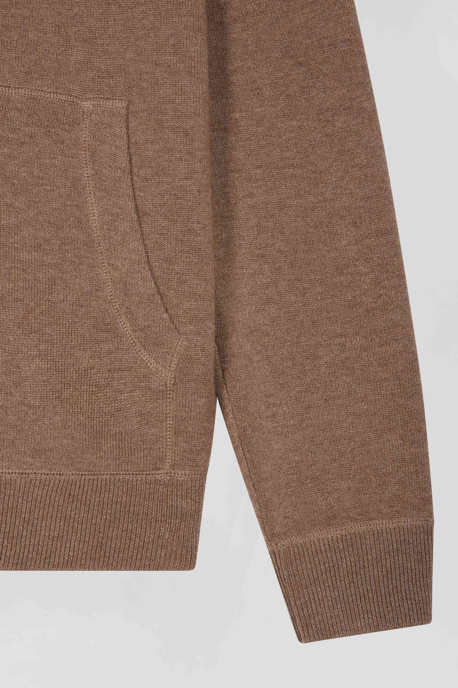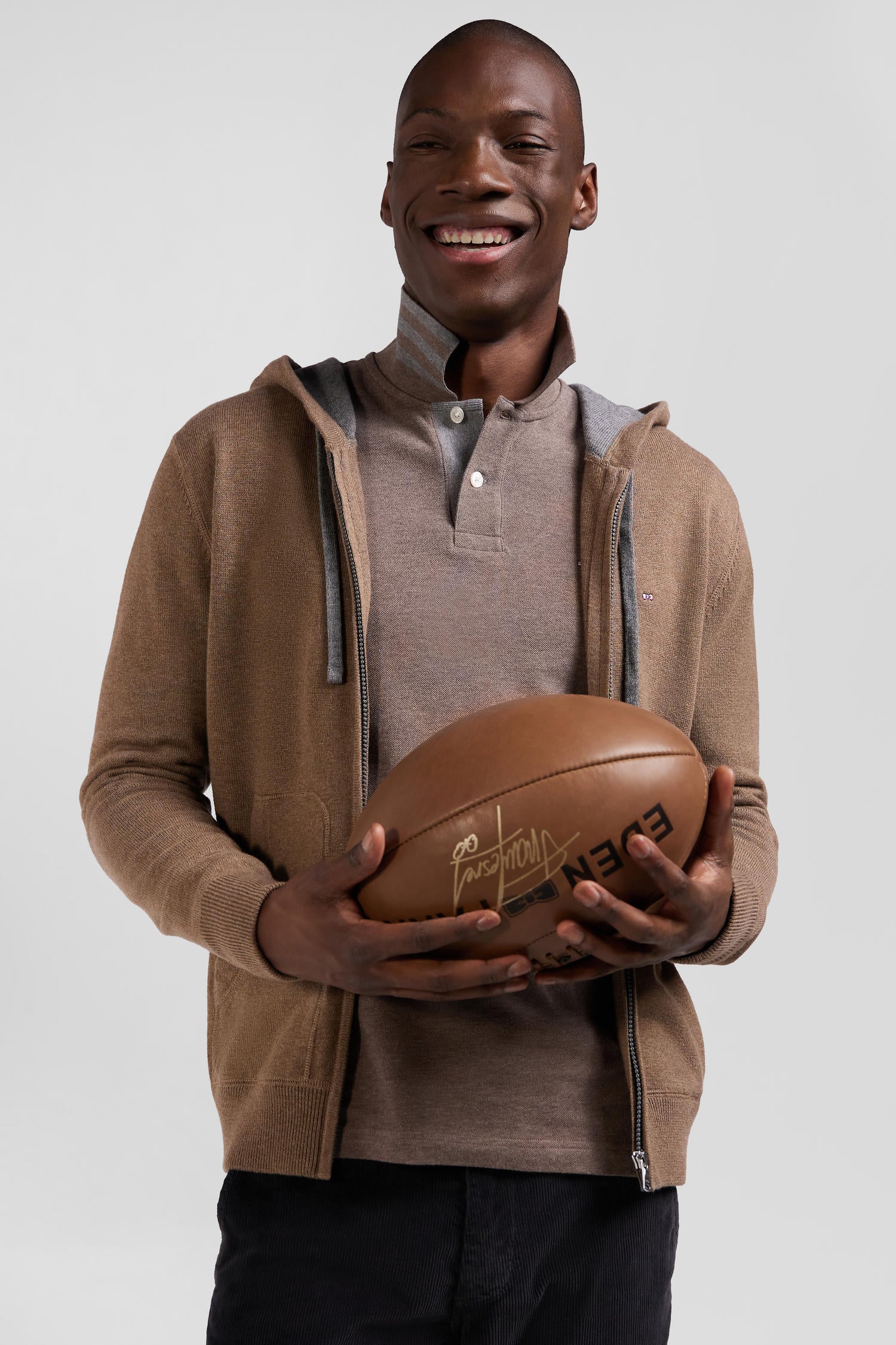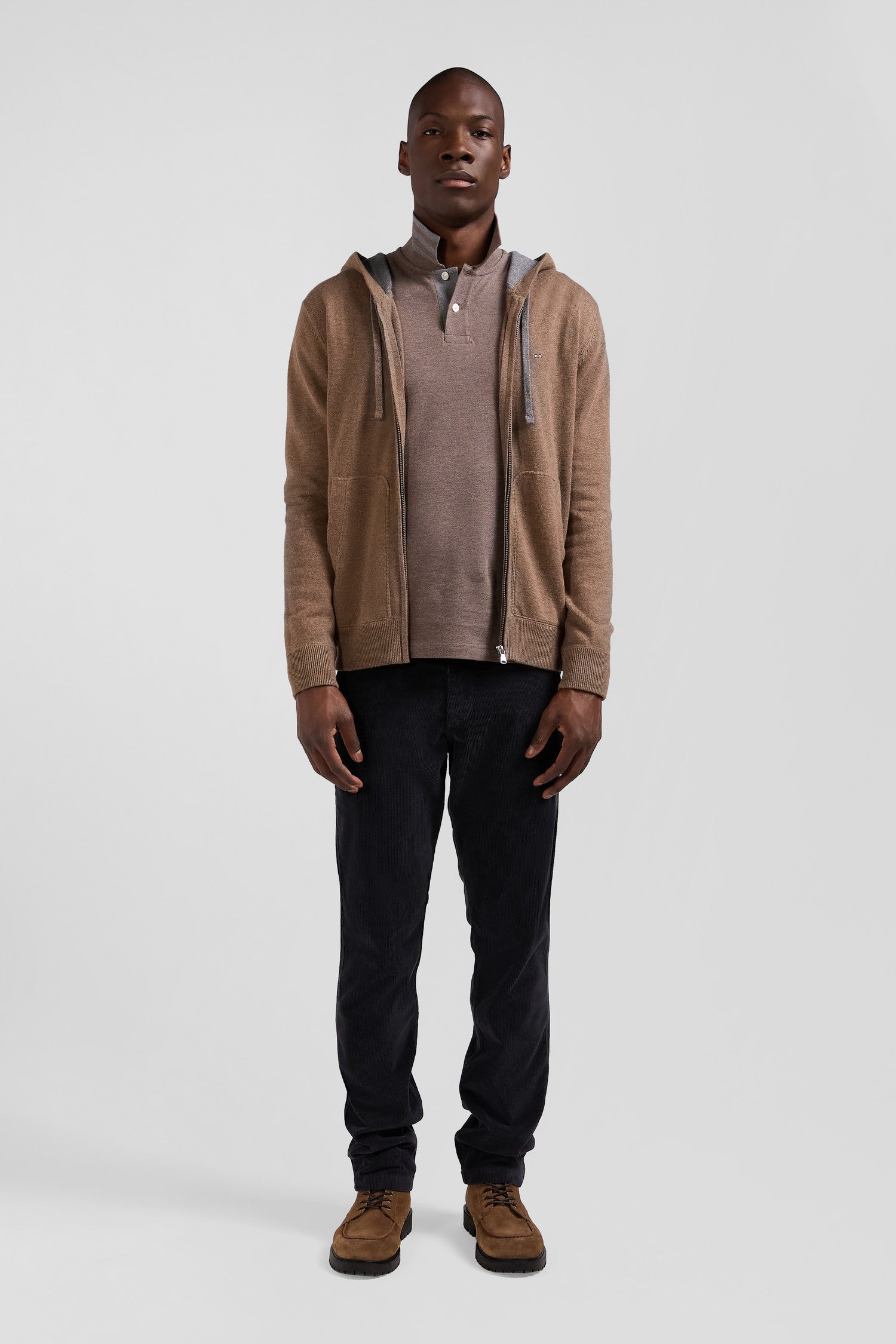 In navy, gray or brown, this men's cardigan with straight zip and kangaroo pocket, inspired by the hooded sweatshirt, promises a smartly crafted casual look. The inside of the hood offers an elegant reminder of its contrasting drawstrings.