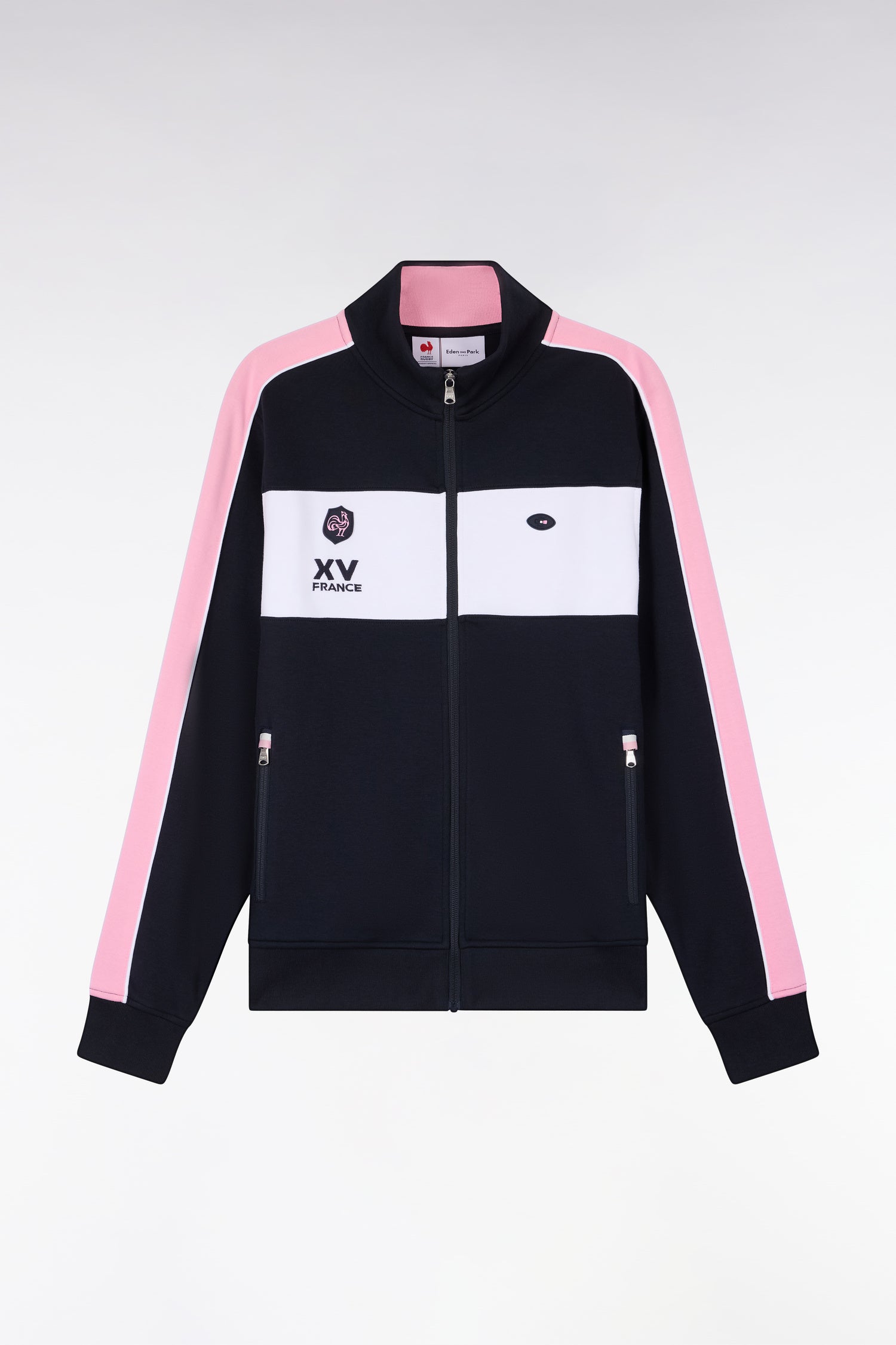 Ce sweatshirt à ouverture zippé associe une base marine à de une large bande blanche animée de badges et broderies pour une silhouette graphique et contemporaine. Ses découpes de manches roses, rappel de son intérieur de col, soulignent la carrure tandis que les poches zippées renforcent l'aspect utilitaire de cette pièce collector adaptant les codes de l'ovalie au quotidien.