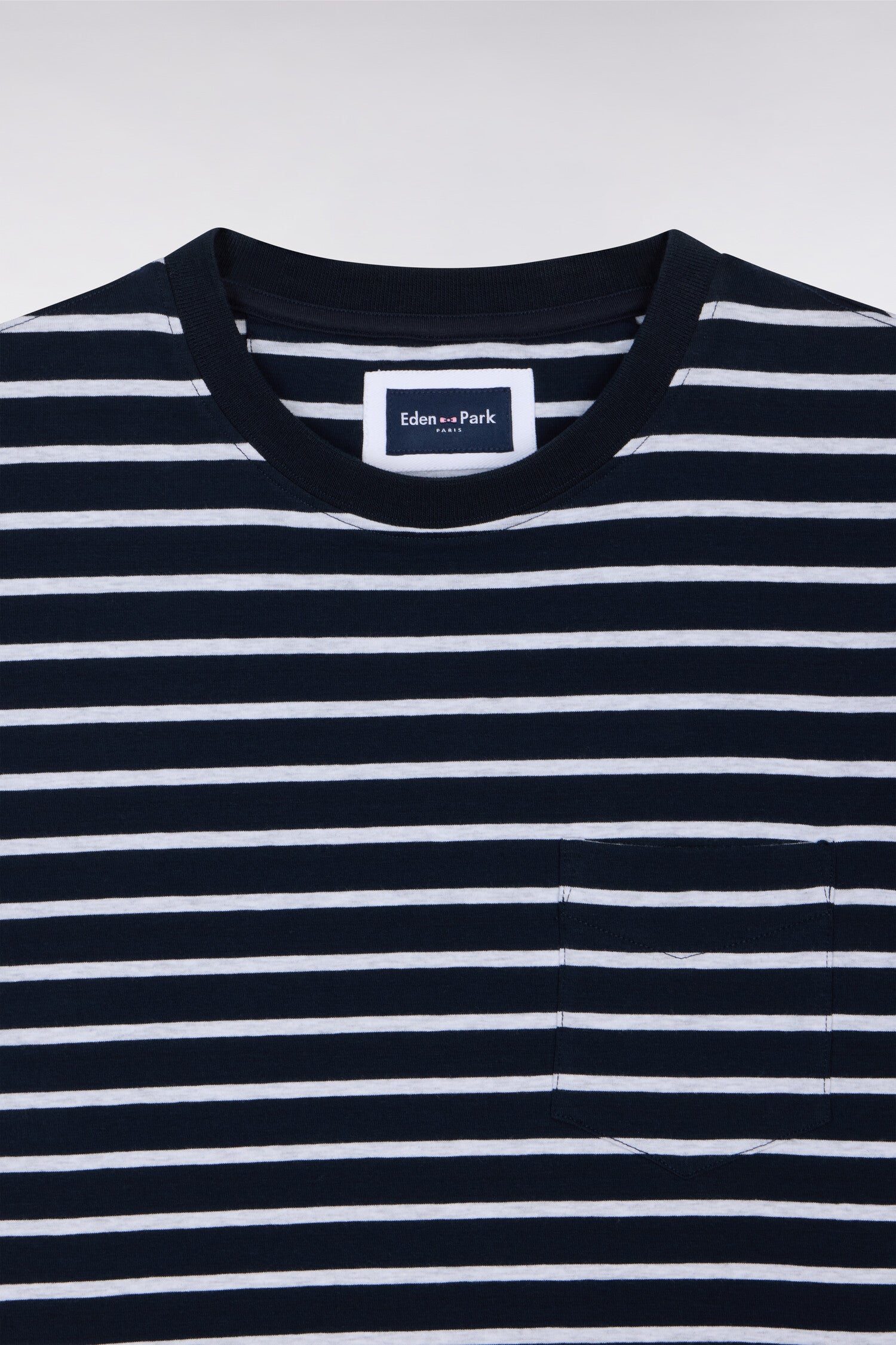 This stretch cotton T-shirt, available in 3 color variations, is a must-have in the men's wardrobe. With its short sleeves, its navy ribbed collar and its patch pocket embroidered with a personalized badge, it combines casual style and sporty elegance. Its fine stripes, inspired by French sailor stripes and rugby stripes, mark this soft T-shirt with a close-fitting cut.