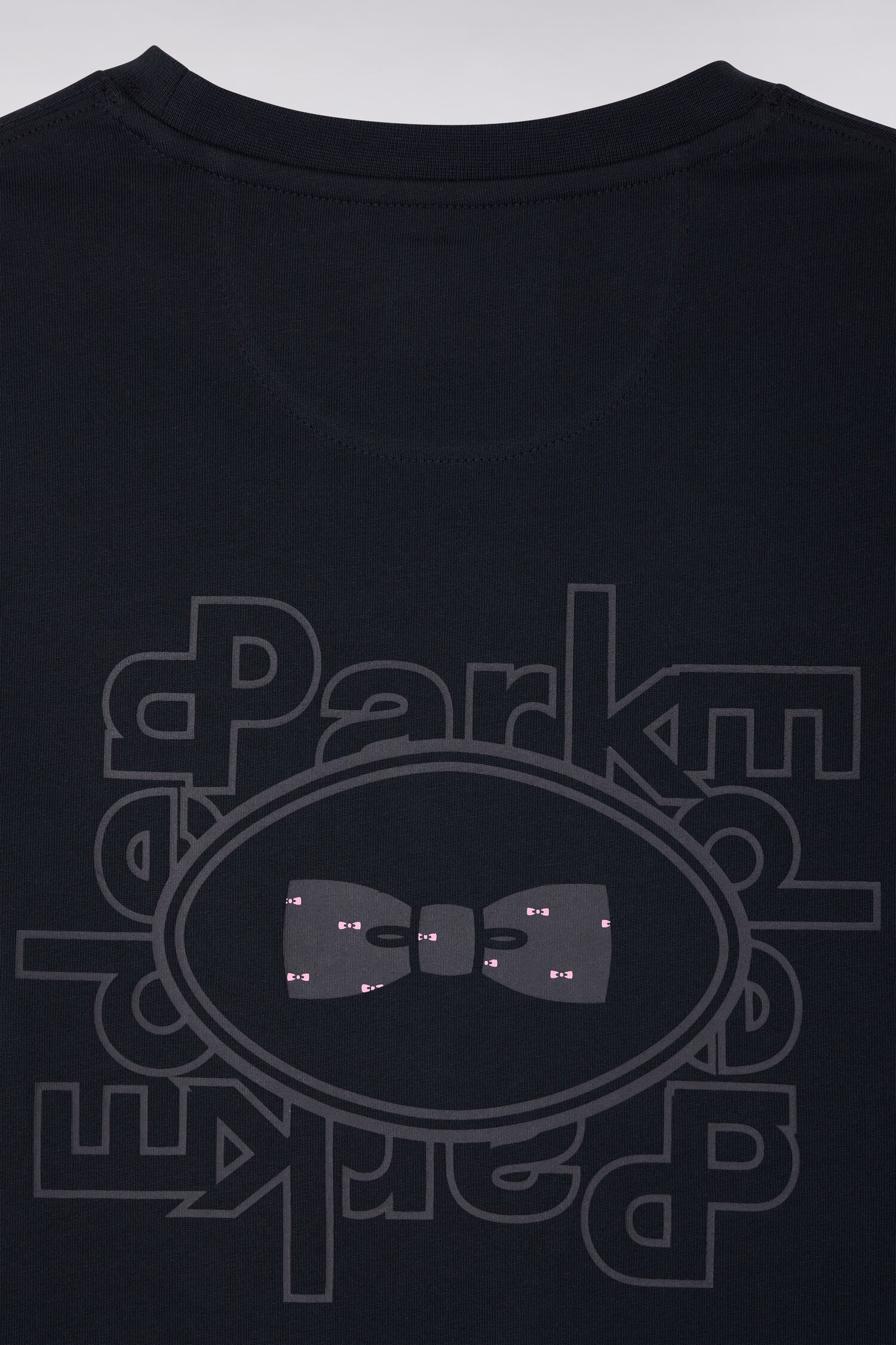 Sobre à l’avant, ce T-shirt homme bleu marine à col rond en bords-côtes dévoile au dos une sérigraphie exclusive s'amusant de notre emblème : le nœud papillon. Ce détail original signe la singularité de cette pièce, tout en conservant une allure équilibrée et facile à porter au quotidien.