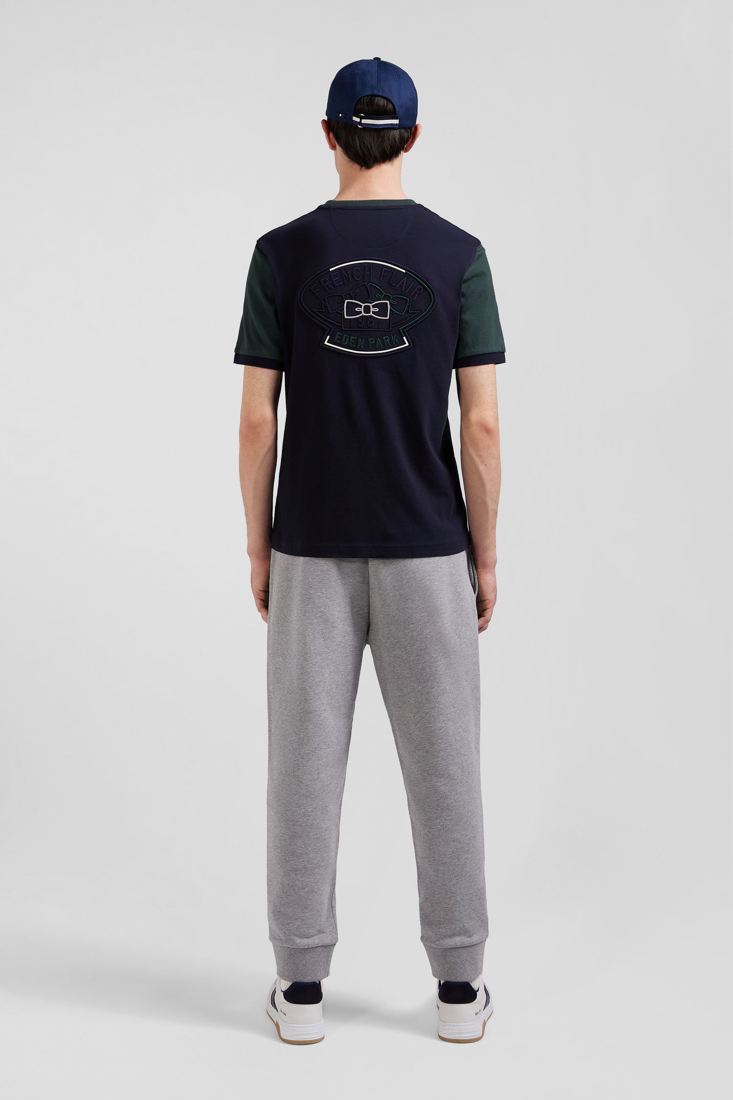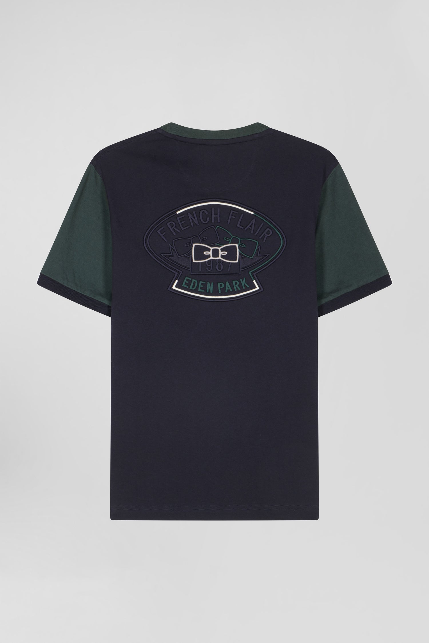 Our top-of-the-range cotton men's T-shirt is embellished with our House's iconic elements assembled in intricate back embroidery. For a graphic touch, this two-tone T-shirt features contrasting sleeves inspired by sportswear.