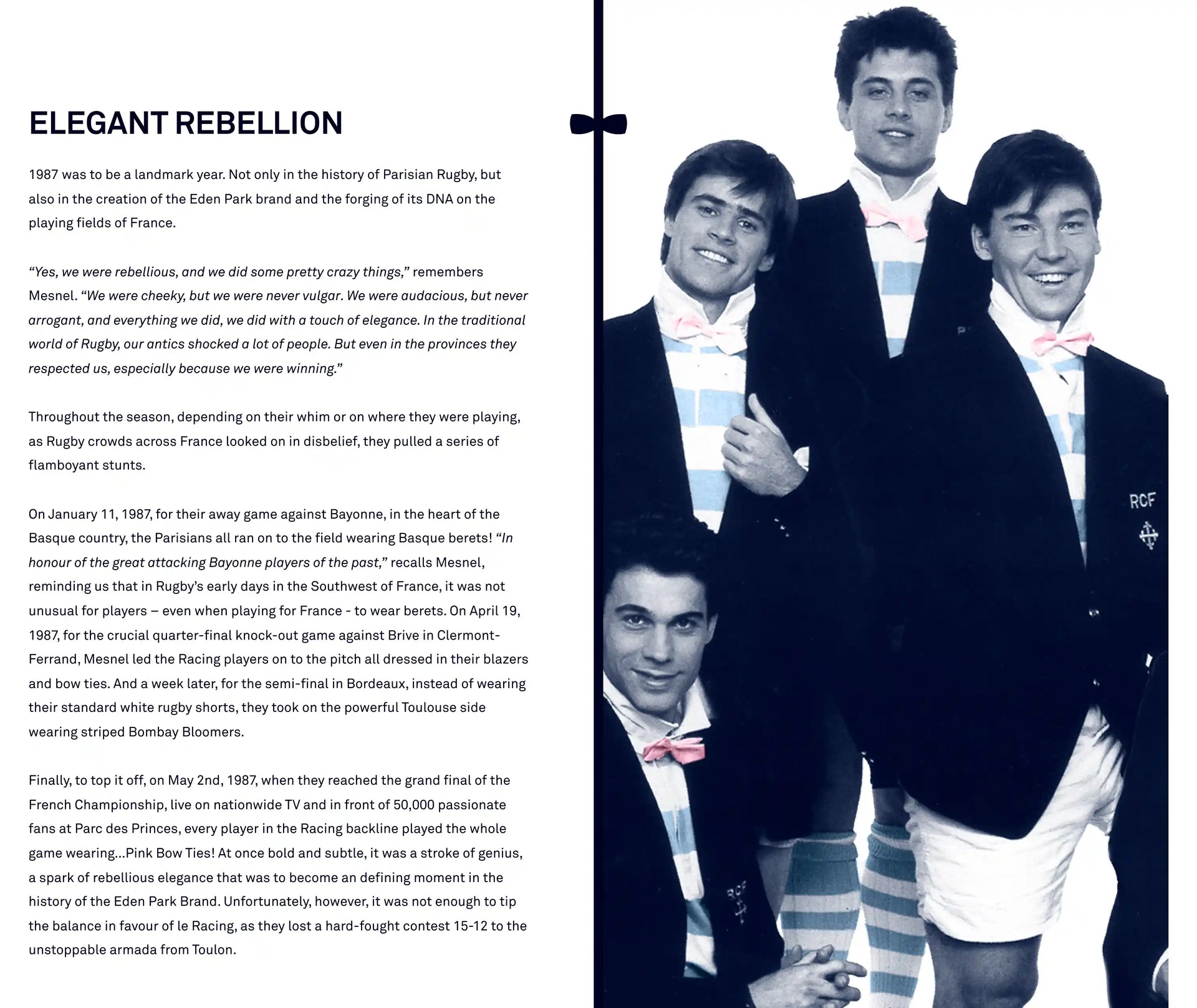 Eden Park. The name itself, as we shall see, is synonymous with the game of Rugby. But over the past 37 years, the brand of clothing, and its iconic Pink Bow Tie logo have also become synonymous with a certain style. Stylish but never stuffy, chic but always comfortable, respectful of tradition, but always pushing the boundaries of innovation. In France it’s known as the Eden Park look, an uncompromising search for elegance and meticulous attention to detail. Combined with high-quality ethically sourced fabrics, the brand boasts a unique fusion of contemporary Parisian chic with Eden Park’s own authentic, and unmistakable, identity.